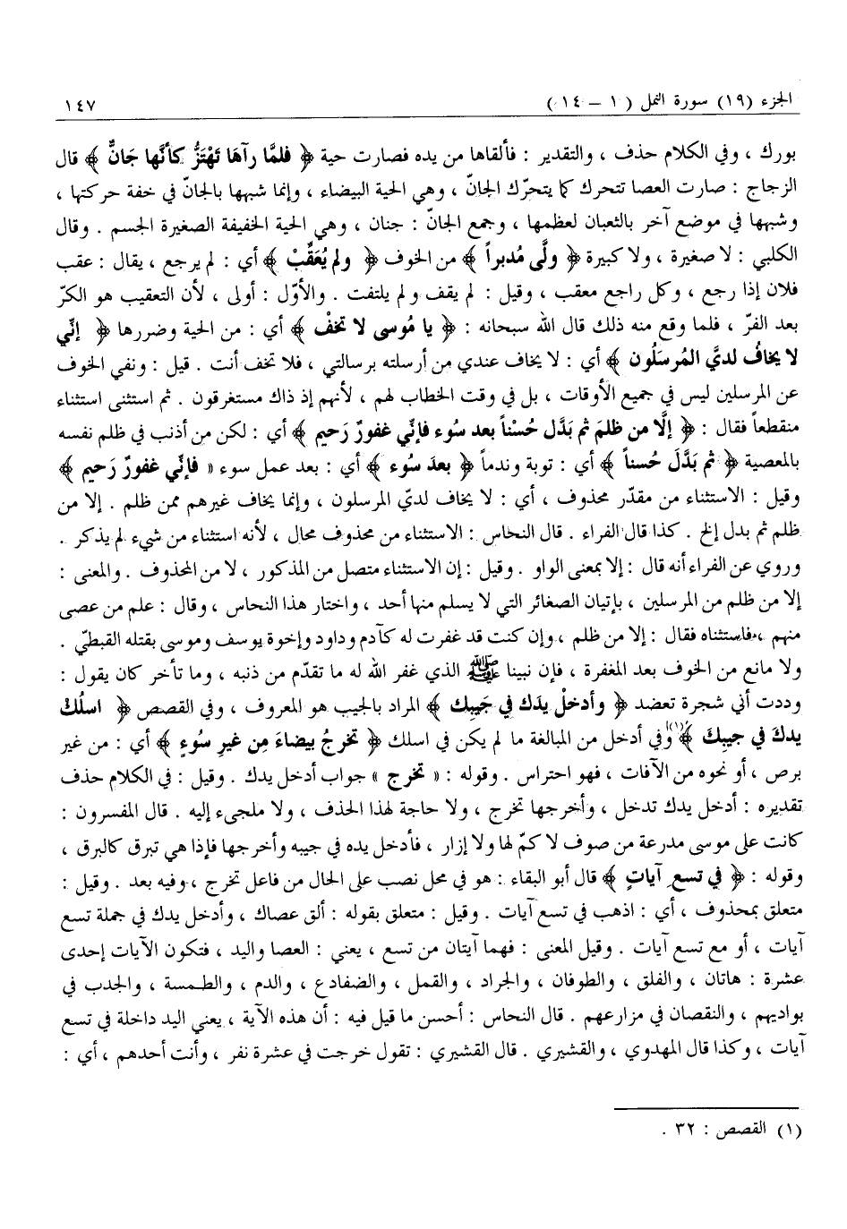 بُورِكَ، وَفِي الْكَلَامِ حَذْفٌ، وَالتَّقْدِيرُ: فَأَلْقَاهَا مِنْ يَدِهِ فَصَارَتْ حَيَّةً فَلَمَّا رَآها تَهْتَزُّ كَأَنَّها جَانٌّ قَالَ الزَّجَّاجُ: صَارَتِ الْعَصَا تَتَحَرَّكُ كَمَا يَتَحَرَّكُ الْجَانُّ، وَهِيَ الْحَيَّةُ الْبَيْضَاءُ، وَإِنَّمَا شَبَّهَهَا بِالْجَانِّ فِي خِفَّةِ حَرَكَتِهَا، وَشَبَّهَهَا فِي مَوْضِعٍ آخَرَ بِالثُّعْبَانِ لِعِظَمِهَا، وَجَمْعُ الْجَانِّ: جِنَانٌ، وَهِيَ الْحَيَّةُ الْخَفِيفَةُ الصَّغِيرَةُ الْجِسْمِ. وَقَالَ الْكَلْبِيُّ: لَا صَغِيرَةٌ، وَلَا كَبِيرَةٌ وَلَّى مُدْبِراً مِنَ الْخَوْفِ وَلَمْ يُعَقِّبْ أَيْ: لَمْ يَرْجِعْ، يُقَالُ: عَقَّبَ فُلَانٌ إِذَا رَجَعَ، وَكُلُّ رَاجِعٍ مُعَقِّبٌ، وَقِيلَ: لَمْ يَقِفْ وَلَمْ يَلْتَفِتْ. وَالْأَوَّلُ: أَوْلَى، لِأَنَّ التَّعْقِيبَ هُوَ الْكَرُّ بَعْدَ الْفَرِّ، فَلَمَّا وَقَعَ منه ذلك قال الله سبحانه: يا مُوسى لَا تَخَفْ أَيْ: مِنَ الْحَيَّةِ وَضَرَرِهَا إِنِّي لَا يَخافُ لَدَيَّ الْمُرْسَلُونَ أَيْ: لَا يَخَافُ عِنْدِي مَنْ أَرْسَلْتُهُ بِرِسَالَتِي، فَلَا تَخَفْ أَنْتَ. قِيلَ: وَنَفْيُ الْخَوْفِ عَنِ الْمُرْسَلِينَ لَيْسَ فِي جَمِيعِ الْأَوْقَاتِ، بَلْ فِي وَقْتِ الْخِطَابِ لَهُمْ، لِأَنَّهُمْ إِذْ ذَاكَ مُسْتَغْرِقُونَ. ثُمَّ اسْتَثْنَى اسْتِثْنَاءً مُنْقَطِعًا فَقَالَ: إِلَّا مَنْ ظَلَمَ ثُمَّ بَدَّلَ حُسْناً بَعْدَ سُوءٍ فَإِنِّي غَفُورٌ رَحِيمٌ أَيْ: لَكِنَّ مَنْ أَذْنَبَ فِي ظُلْمِ نَفْسِهِ بِالْمَعْصِيَةِ ثُمَّ بَدَّلَ حُسْناً أَيْ: تَوْبَةً وَنَدَمًا بَعْدَ سُوءٍ أَيْ: بَعْدَ عَمَلِ سُوءٍ فَإِنِّي غَفُورٌ رَحِيمٌ وَقِيلَ: الِاسْتِثْنَاءُ مِنْ مُقَدَّرٍ مَحْذُوفٍ، أَيْ: لَا يَخَافُ لَدَيَّ الْمُرْسَلُونَ، وَإِنَّمَا يَخَافُ غَيْرُهُمْ مِمَّنْ ظَلَمَ. إِلَّا مِنْ ظَلَمَ ثُمَّ بَدَّلَ إِلَخْ. كَذَا قَالَ الْفَرَّاءُ. قَالَ النَّحَّاسُ: الِاسْتِثْنَاءُ مِنْ مَحْذُوفٍ مُحَالٌ، لِأَنَّهُ اسْتِثْنَاءٌ مِنْ شَيْءٍ لَمْ يُذْكَرْ.
