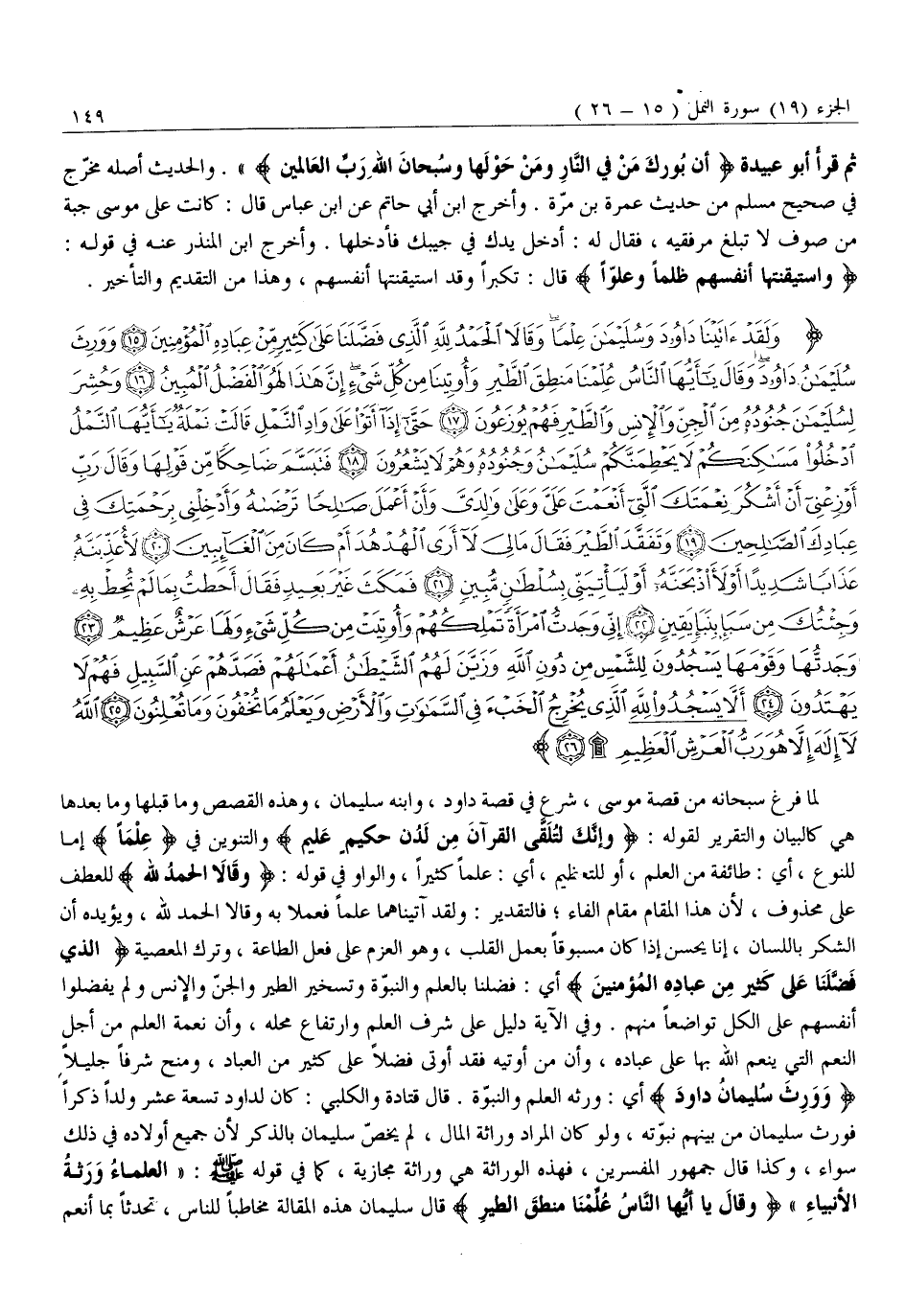 لَمَّا فَرَغَ سبحانه من قصة موسى، شرع فِي قِصَّةِ دَاوُدَ، وَابْنِهِ سُلَيْمَانَ، وَهَذِهِ الْقِصَصُ وَمَا قَبْلَهَا وَمَا بَعْدَهَا هِيَ كَالْبَيَانِ وَالتَّقْرِيرِ لِقَوْلِهِ: وَإِنَّكَ لَتُلَقَّى الْقُرْآنَ مِنْ لَدُنْ حَكِيمٍ عَلِيمٍ وَالتَّنْوِينُ فِي عِلْماً إِمَّا لِلنَّوْعِ، أَيْ: طَائِفَةً مِنَ الْعِلْمِ، أَوْ لِلتَّعْظِيمِ، أَيْ: عِلْمًا كَثِيرًا، والواو فِي قَوْلِهِ: وَقالا الْحَمْدُ لِلَّهِ لِلْعَطْفِ عَلَى مَحْذُوفٍ، لِأَنَّ هَذَا الْمَقَامَ مَقَامُ الْفَاءِ فَالتَّقْدِيرُ: وَلَقَدْ آتَيْنَاهُمَا عِلْمًا فَعَمِلَا بِهِ وَقَالَا الْحَمْدُ لله، ويؤيده أن الشكر باللسان، إنا يَحْسُنُ إِذَا كَانَ مَسْبُوقًا بِعَمَلِ الْقَلْبِ، وَهُوَ الْعَزْمُ عَلَى فِعْلِ الطَّاعَةِ، وَتَرْكِ الْمَعْصِيَةِ الَّذِي فَضَّلَنا عَلى كَثِيرٍ مِنْ عِبادِهِ الْمُؤْمِنِينَ أَيْ: فَضَّلَنَا بِالْعِلْمِ وَالنُّبُوَّةِ وَتَسْخِيرِ الطَّيْرِ وَالْجِنِّ وَالْإِنْسِ وَلَمْ يُفَضِّلُوا أَنْفُسَهُمْ عَلَى الْكُلِّ تَوَاضُعًا مِنْهُمْ. وَفِي الْآيَةِ دَلِيلٌ عَلَى شَرَفِ الْعِلْمِ وَارْتِفَاعِ مَحَلِّهِ، وَأَنَّ نِعْمَةَ الْعِلْمِ مِنْ أَجَلِّ النِّعَمِ الَّتِي يُنْعِمُ اللَّهُ بِهَا عَلَى عِبَادِهِ، وَأَنَّ مَنْ أُوتِيَهُ فَقَدْ أُوتِيَ فَضْلًا عَلَى كَثِيرٍ مِنَ الْعِبَادِ، وَمُنِحَ شَرَفًا جَلِيلًا وَوَرِثَ سُلَيْمانُ داوُدَ أي: ورثه الْعِلْمَ وَالنُّبُوَّةَ. قَالَ قَتَادَةُ وَالْكَلْبِيُّ: كَانَ لِدَاوُدَ تِسْعَةَ عَشَرَ وَلَدًا ذَكَرًا فَوَرِثَ سُلَيْمَانُ مِنْ بَيْنِهِمْ نُبُوَّتَهُ، وَلَوْ كَانَ الْمُرَادُ وِرَاثَةُ الْمَالِ، لِمَ يَخُصَّ سُلَيْمَانَ بِالذِّكْرِ لِأَنَّ جَمِيعَ أَوْلَادِهِ فِي ذَلِكَ سَوَاءٌ، وَكَذَا قَالَ جُمْهُورُ الْمُفَسِّرِينَ، فَهَذِهِ الْوِرَاثَةُ هِيَ وِرَاثَةٌ مَجَازِيَّةٌ، كَمَا فِي قَوْلِهِ صَلَّى اللَّهُ عَلَيْهِ وَسَلَّمَ: «العلماء ورثة الأنبياء» وَقالَ يَا أَيُّهَا النَّاسُ عُلِّمْنا مَنْطِقَ الطَّيْرِ قَالَ سُلَيْمَانُ هَذِهِ الْمَقَالَةَ مُخَاطِبًا لِلنَّاسِ، تَحَدُّثًا بما أنعم