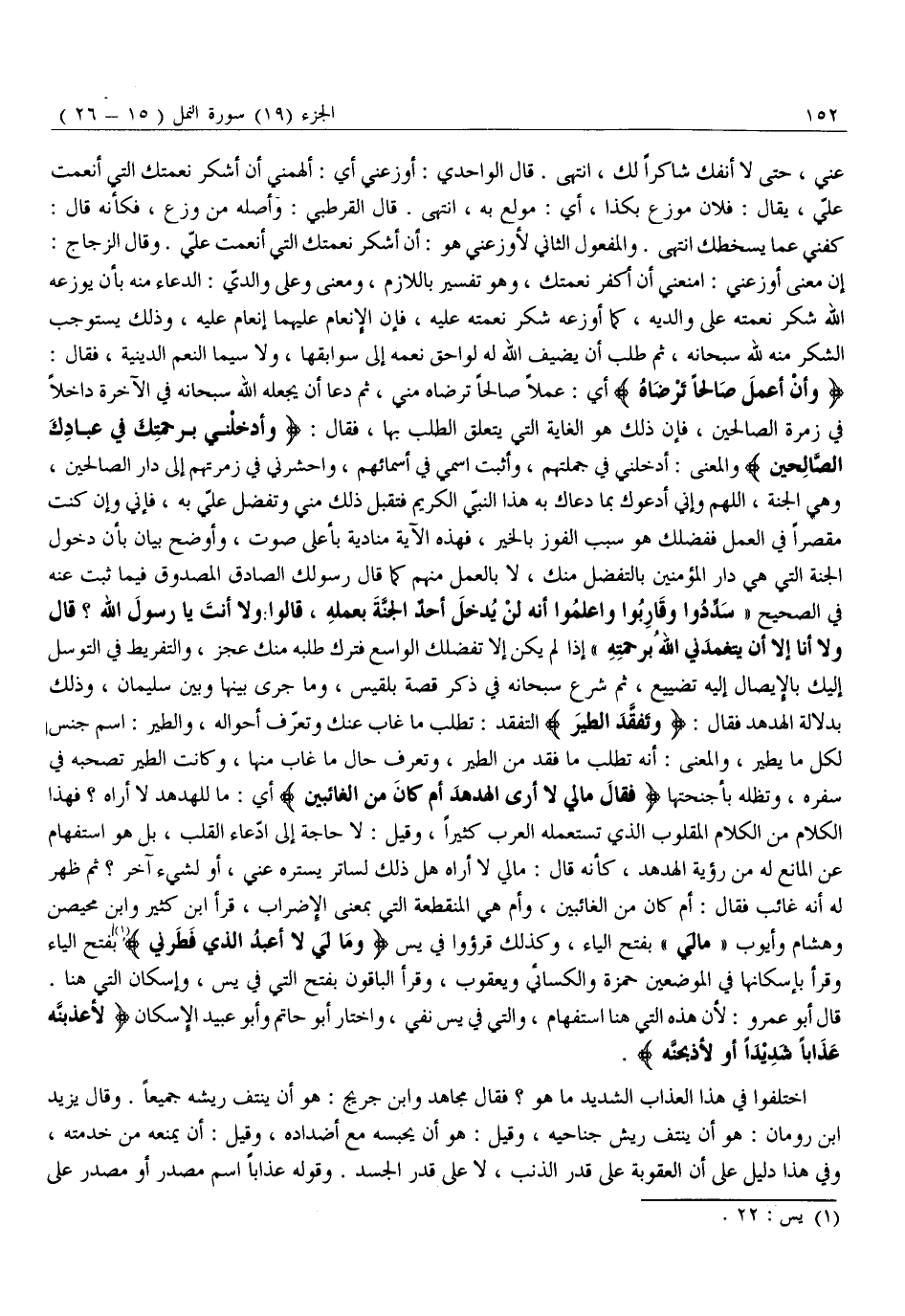 وَأَنْ أَعْمَلَ صالِحاً تَرْضاهُ أَيْ: عَمَلًا صَالِحًا تَرْضَاهُ مِنِّي، ثُمَّ دَعَا أَنْ يَجْعَلَهُ اللَّهُ سُبْحَانَهُ فِي الْآخِرَةِ دَاخِلًا فِي زُمْرَةِ الصَّالِحِينَ، فَإِنَّ ذَلِكَ هُوَ الْغَايَةُ الَّتِي يَتَعَلَّقُ الطَّلَبُ بِهَا، فَقَالَ: وَأَدْخِلْنِي بِرَحْمَتِكَ فِي عِبادِكَ الصَّالِحِينَ وَالْمَعْنَى: أَدْخِلْنِي فِي جُمْلَتِهِمْ، وَأَثْبِتِ اسْمِي فِي أَسْمَائِهِمْ، وَاحْشُرْنِي فِي زُمْرَتِهِمْ إِلَى دَارِ الصَّالِحِينَ، وَهِيَ الْجَنَّةُ، اللَّهُمَّ وَإِنِّي أَدْعُوكَ بِمَا دَعَاكَ بِهِ هَذَا النَّبِيُّ الْكَرِيمُ فَتَقَبَّلْ ذَلِكَ مِنِّي وَتَفَضَّلْ عَلَيَّ بِهِ، فَإِنِّي وَإِنْ كُنْتُ مُقَصِّرًا فِي الْعَمَلِ فَفَضْلُكَ هُوَ سَبَبُ الْفَوْزِ بِالْخَيْرِ، فَهَذِهِ الْآيَةُ مُنَادِيَةٌ بِأَعْلَى صَوْتٍ، وَأَوْضَحِ بَيَانٍ بِأَنَّ دُخُولَ الْجَنَّةِ الَّتِي هِيَ دَارُ الْمُؤْمِنِينَ بِالتَّفَضُّلِ مِنْكَ، لَا بالعمل منهم كما قال رسولك الصادق المصدوق فِيمَا ثَبَتَ عَنْهُ فِي الصَّحِيحِ «سَدِّدُوا وَقَارِبُوا وَاعْلَمُوا أَنَّهُ لَنْ يَدْخُلَ أَحَدٌ الْجَنَّةَ بِعَمَلِهِ، قَالُوا: وَلَا أَنْتَ يَا رَسُولَ اللَّهِ؟ قَالَ وَلَا أَنَا إِلَّا أَنْ يَتَغَمَّدَنِي اللَّهُ بِرَحْمَتِهِ» إذا لَمْ يَكُنْ إِلَّا تَفَضُّلُكَ الْوَاسِعُ فَتَرْكُ طَلَبِهِ مِنْكَ عَجْزٌ، وَالتَّفْرِيطُ فِي التَّوَسُّلِ إِلَيْكَ بِالْإِيصَالِ إِلَيْهِ تَضْيِيعٌ، ثُمَّ شَرَعَ سُبْحَانَهُ فِي ذِكْرِ قِصَّةِ بِلْقِيسَ، وَمَا جَرَى بَيْنَهَا وَبَيْنَ سُلَيْمَانَ، وَذَلِكَ بِدَلَالَةِ الْهُدْهُدِ فَقَالَ: وَتَفَقَّدَ الطَّيْرَ التَّفَقُّدُ: تَطَلُّبُ مَا غَابَ عَنْكَ وَتَعَرُّفُ أَحْوَالِهِ، وَالطَّيْرُ: اسْمُ جِنْسٍ لِكُلِّ مَا يَطِيرُ، وَالْمَعْنَى: أَنَّهُ تَطَلَّبَ مَا فَقَدَ مِنَ الطَّيْرِ، وَتَعَرَّفَ حَالَ مَا غَابَ مِنْهَا، وَكَانَتِ الطَّيْرُ تَصْحَبُهُ فِي سَفَرِهِ، وَتُظِلُّهُ بِأَجْنِحَتِهَا فَقالَ مَا لِيَ لَا أَرَى الْهُدْهُدَ أَمْ كانَ مِنَ الْغائِبِينَ أَيْ: مَا لِلْهُدْهُدِ لَا أَرَاهُ؟ فَهَذَا الْكَلَامُ مِنَ الْكَلَامِ الْمَقْلُوبِ الَّذِي تَسْتَعْمِلُهُ الْعَرَبُ كَثِيرًا، وَقِيلَ: لَا حَاجَةَ إِلَى ادِّعَاءِ الْقَلْبِ، بَلْ هُوَ اسْتِفْهَامٌ عَنِ الْمَانِعِ لَهُ مِنْ رُؤْيَةِ الْهُدْهُدِ، كَأَنَّهُ قَالَ: مَالِي لَا أَرَاهُ هَلْ ذَلِكَ لِسَاتِرٍ يَسْتُرُهُ عَنِّي، أَوْ لِشَيْءٍ آخَرَ؟ ثُمَّ ظَهَرَ لَهُ أَنَّهُ غَائِبٌ فَقَالَ: أَمْ كَانَ من الغائبين، وأم هِيَ الْمُنْقَطِعَةُ الَّتِي بِمَعْنَى الْإِضْرَابِ، قَرَأَ ابْنُ كثير وابن محيصن وهشام وأيوب «مالي» بفتح الياء، وكذلك قرءوا فِي يس وَما لِيَ لَا أَعْبُدُ الَّذِي فَطَرَنِي «1» بِفَتْحِ الْيَاءِ وَقَرَأَ بِإِسْكَانِهَا فِي الْمَوْضِعَيْنِ حَمْزَةُ وَالْكِسَائِيُّ وَيَعْقُوبُ، وَقَرَأَ الْبَاقُونَ بِفَتْحِ الَّتِي فِي يس، وَإِسْكَانِ الَّتِي هُنَا.