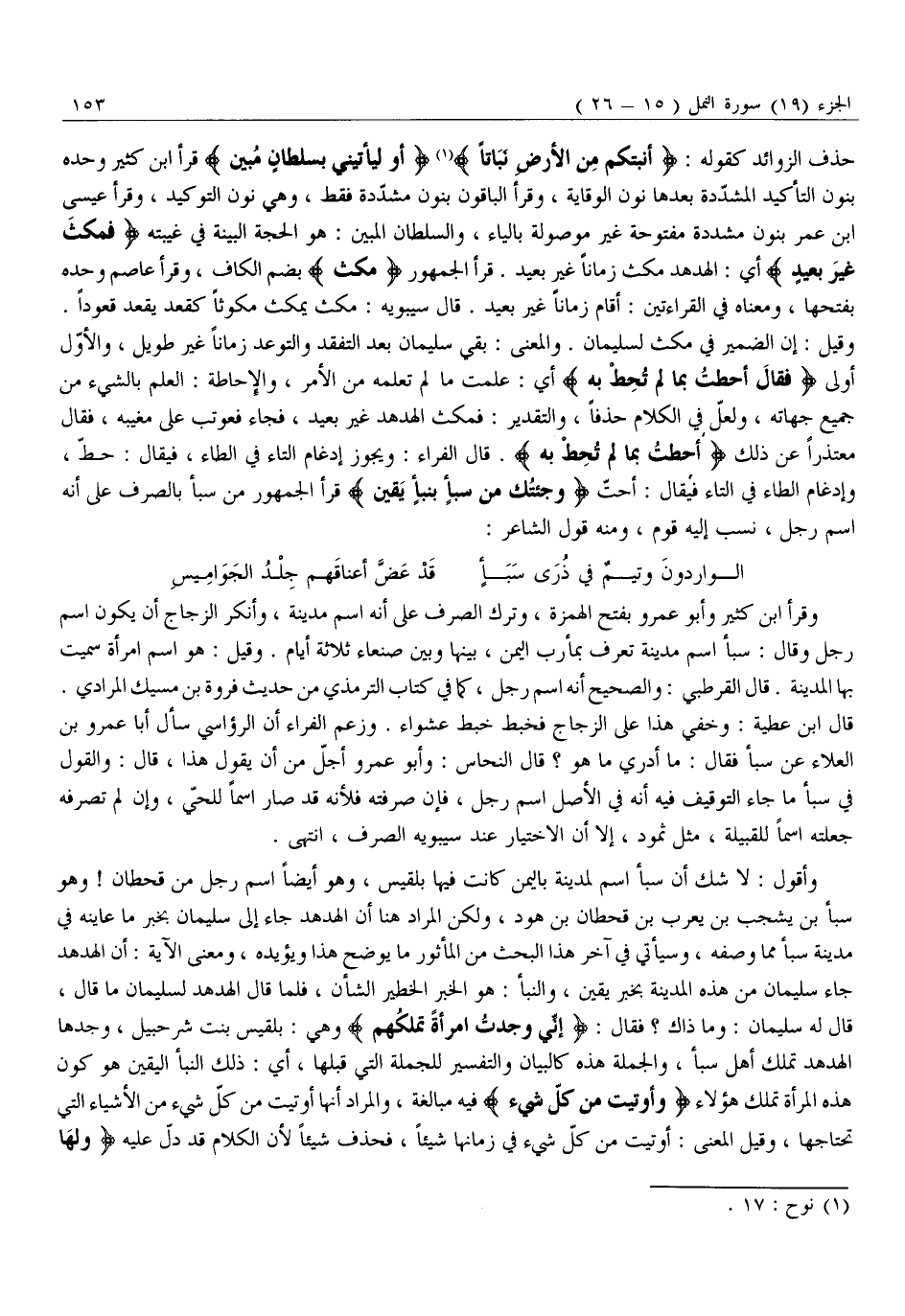 وَقِيلَ: إِنَّ الضَّمِيرَ فِي مَكَثَ لِسُلَيْمَانَ. وَالْمَعْنَى: بَقِيَ سُلَيْمَانُ بَعْدَ التَّفَقُّدِ وَالتَّوَعُّدِ زَمَانًا غَيْرَ طَوِيلٍ، وَالْأَوَّلُ أَوْلَى فَقالَ أَحَطْتُ بِما لَمْ تُحِطْ بِهِ أَيْ: عَلِمْتُ مَا لَمْ تَعْلَمْهُ مِنَ الْأَمْرِ، وَالْإِحَاطَةُ: الْعِلْمُ بِالشَّيْءِ مِنْ جَمِيعِ جِهَاتِهِ، وَلَعَلَّ فِي الْكَلَامِ حَذْفًا، وَالتَّقْدِيرُ: فَمَكَثَ الْهُدْهُدُ غَيْرَ بَعِيدٍ، فَجَاءَ فَعُوتِبَ عَلَى مَغِيبِهِ، فَقَالَ مُعْتَذِرًا عَنْ ذَلِكَ أَحَطْتُ بِما لَمْ تُحِطْ بِهِ. قَالَ الْفَرَّاءُ: وَيَجُوزُ إِدْغَامُ التَّاءَ فِي الطَّاءِ، فيقال: حطّ، وَإِدْغَامُ الطَّاءِ فِي التَّاءِ فَيُقَالُ: أَحَتُّ وَجِئْتُكَ مِنْ سَبَإٍ بِنَبَإٍ يَقِينٍ قَرَأَ الْجُمْهُورُ مِنْ سَبَإٍ بِالصَّرْفِ عَلَى أَنَّهُ اسْمُ رَجُلٍ، نُسِبَ إِلَيْهِ قَوْمٌ، وَمِنْهُ قَوْلُ الشَّاعِرِ: