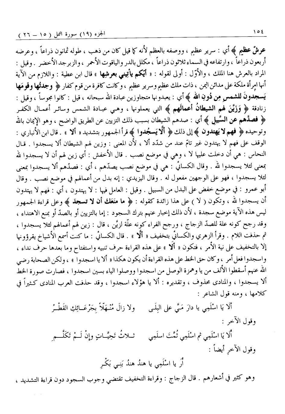 الْوَقْفُ عَلَى فَهُمْ لَا يَهْتَدُونَ غَيْرُ تَامٍّ عِنْدَ مَنْ شَدَّدَ أَلَّا، لأنَّ الْمَعْنَى: وَزَيَّنَ لَهُمُ الشَّيْطَانُ أَلَّا يَسْجُدُوا. قَالَ النَّحَّاسُ: هِيَ أَنْ دَخَلَتْ عَلَيْهَا لَا، وَهِيَ فِي مَوْضِعِ نَصْبٍ. قَالَ الْأَخْفَشُ: أَيْ زَيَّنَ لَهُمْ أَنْ لَا يَسْجُدُوا لِلَّهِ بِمَعْنَى لِئَلَّا يَسْجُدُوا لِلَّهِ. وَقَالَ الْكِسَائِيُّ: هِيَ في موضع نصب يصدّهم، أَيْ: فَصَدَّهُمْ أَلَا يَسْجُدُوا بِمَعْنَى لِئَلَّا يَسْجُدُوا، فَهُوَ عَلَى الْوَجْهَيْنِ مَفْعُولٌ لَهُ. وَقَالَ الْيَزِيدِيُّ: إِنَّهُ بَدَلٌ مِنْ أَعْمَالَهُمْ فِي مَوْضِعِ نَصْبٍ. وَقَالَ أَبُو عَمْرٍو: فِي مَوْضِعِ خَفْضٍ عَلَى الْبَدَلِ مِنَ السَّبِيلِ. وَقِيلَ: الْعَامِلُ فِيهَا: لَا يَهْتَدُونَ، أَيْ: فَهُمْ لَا يَهْتَدُونَ أَنْ يَسْجُدُوا لِلَّهِ، وَتَكُونُ (لَا) عَلَى هَذَا زَائِدَةً كَقَوْلِهِ: ما مَنَعَكَ أَلَّا تَسْجُدَ وعلى قراءة الجمهور ليس هَذِهِ الْآيَةُ مَوْضِعَ سَجْدَةٍ، لِأَنَّ ذَلِكَ إِخْبَارٌ عَنْهُمْ بِتَرْكِ السُّجُودِ: إِمَّا بِالتَّزْيِينِ أَوْ بِالصَّدِّ أَوْ بِمَنْعِ الِاهْتِدَاءِ، وَقَدْ رَجَّحَ كَوْنَهُ عِلَّةً لِلصَّدِّ الزَّجَّاجُ، وَرَجَّحَ الْفَرَّاءُ كَوْنَهُ عِلَّةً لِزَيَّنَ، قَالَ: زَيَّنَ لَهُمْ أَعْمَالَهُمْ لِئَلَّا يَسْجُدُوا، ثُمَّ حُذِفَتِ اللَّامُ. وَقَرَأَ الزُّهْرِيُّ وَالْكِسَائِيُّ بِتَخْفِيفِ «أَلَّا» . قَالَ الْكِسَائِيُّ: مَا كُنْتُ أَسْمَعُ الْأَشْيَاخَ يَقْرَءُونَهَا إِلَّا بِالتَّخْفِيفِ عَلَى نِيَّةِ الْأَمْرِ، فَتَكُونُ «أَلَا» عَلَى هَذِهِ الْقِرَاءَةِ حَرْفَ تَنْبِيهٍ وَاسْتِفْتَاحٍ وَمَا بعدها حرف نداء، واسجدوا فِعْلَ أَمْرٍ، وَكَانَ حَقُّ الْخَطِّ عَلَى هَذِهِ الْقِرَاءَةِ أَنْ يَكُونَ هَكَذَا «أَلَا يَا اسْجُدُوا» ، وَلَكِنَّ الصَّحَابَةَ رَضِيَ اللَّهُ عَنْهُمْ أَسْقَطُوا الْأَلِفَ من يا وهمزة الوصل من اسجدوا وَوَصَلُوا الْيَاءَ بِسِينِ اسْجُدُوا، فَصَارَتْ صُورَةُ الْخَطِّ أَلَا يَسْجُدُوا، وَالْمُنَادَى مَحْذُوفٌ، وَتَقْدِيرُهُ: أَلَا يَا هَؤُلَاءِ اسْجُدُوا، وَقَدْ حَذَفَتِ الْعَرَبُ الْمُنَادَى كَثِيرًا فِي كَلَامِهَا، وَمِنْهُ قَوْلُ الشَّاعِرِ: