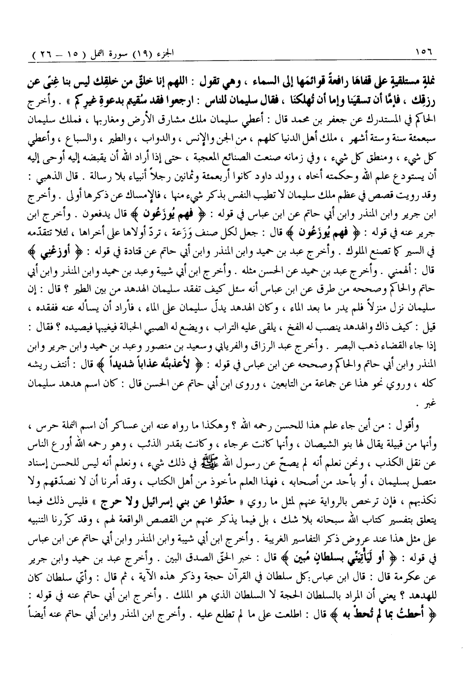 وَأَقُولُ: مِنْ أَيْنَ جَاءَ عِلْمُ هَذَا لِلْحَسَنِ رَحِمَهُ اللَّهُ؟ وَهَكَذَا مَا رَوَاهُ عَنْهُ ابْنُ عَسَاكِرَ أَنَّ اسْمَ النَّمْلَةِ حَرَسُ، وَأَنَّهَا مِنْ قَبِيلَةٍ يقال لها بنو الشيصان، وَأَنَّهَا كَانَتْ عَرْجَاءَ، وَكَانَتْ بِقَدْرِ الذِّئْبِ، وَهُوَ رَحِمَهُ اللَّهُ أَوْرَعُ النَّاسِ عَنْ نَقْلِ الْكَذِبِ، وَنَحْنُ نَعْلَمُ أَنَّهُ لَمْ يَصِحَّ عَنْ رَسُولِ اللَّهِ صَلَّى اللَّهُ عَلَيْهِ وَسَلَّمَ فِي ذَلِكَ شَيْءٌ، وَنَعْلَمُ أَنَّهُ لَيْسَ لِلْحَسَنِ إِسْنَادٌ مُتَّصِلٌ بِسُلَيْمَانَ، أَوْ بِأَحَدٍ مِنْ أَصْحَابِهِ، فَهَذَا الْعِلْمُ مَأْخُوذٌ مِنْ أَهْلِ الْكِتَابِ، وَقَدْ أُمِرْنَا أَنْ لَا نُصَدِّقَهُمْ وَلَا نُكَذِّبَهُمْ، فإن ترخص بِالرِّوَايَةِ عَنْهُمْ لِمِثْلِ مَا رُوِيَ «حَدِّثُوا عَنْ بَنِي إِسْرَائِيلَ وَلَا حَرَجَ» فَلَيْسَ ذَلِكَ فِيمَا يَتَعَلَّقُ بِتَفْسِيرِ كِتَابِ اللَّهِ سُبْحَانَهُ بِلَا شَكٍّ، بل فيما يذكر عَنْهُمْ مِنَ الْقِصَصِ الْوَاقِعَةِ لَهُمْ، وَقَدْ كَرَّرْنَا التَّنْبِيهَ عَلَى مِثْلِ هَذَا عِنْدَ عُرُوضِ ذِكْرِ التَّفَاسِيرِ الْغَرِيبَةِ. وَأَخْرَجَ ابْنُ أَبِي شَيْبَةَ وَابْنُ الْمُنْذِرِ وَابْنُ أَبِي حَاتِمٍ عَنِ ابْنِ عَبَّاسٍ فِي قَوْلِهِ: أَوْ لَيَأْتِيَنِّي بِسُلْطانٍ مُبِينٍ قَالَ: خَبَرُ الْحَقِّ الصِّدْقُ الْبَيِّنُ. وَأَخْرَجَ عَبْدُ بْنُ حُمَيْدٍ وَابْنُ جَرِيرٍ عَنْ عِكْرِمَةَ قَالَ: قَالَ ابْنُ عَبَّاسٍ: كُلُّ سُلْطَانٍ فِي الْقُرْآنِ حُجَّةٌ وَذَكَرَ هَذِهِ الْآيَةَ، ثُمَّ قَالَ: وَأَيُّ سُلْطَانٍ كَانَ لِلْهُدْهُدِ؟ يَعْنِي أَنَّ الْمُرَادَ بِالسُّلْطَانِ الْحُجَّةُ لَا السُّلْطَانُ الَّذِي هُوَ الْمُلْكُ. وَأَخْرَجَ ابْنُ أَبِي حَاتِمٍ عَنْهُ فِي قَوْلِهِ:
