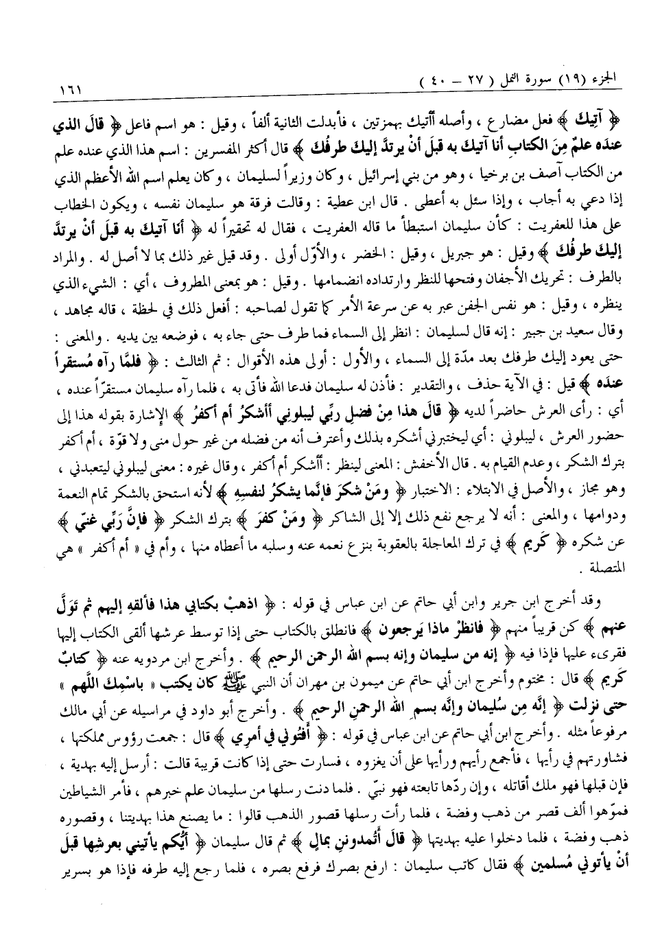 حَتَّى يَعُودَ إِلَيْكَ طَرْفُكَ بَعْدَ مَدِّهِ إِلَى السَّمَاءِ، وَالْأَوَّلُ: أَوْلَى هَذِهِ الْأَقْوَالِ: ثُمَّ الثَّالِثُ: فَلَمَّا رَآهُ مُسْتَقِرًّا عِنْدَهُ قِيلَ: فِي الْآيَةِ حَذْفٌ، وَالتَّقْدِيرُ: فَأَذِنَ لَهُ سُلَيْمَانُ فَدَعَا اللَّهَ فَأَتَى بِهِ، فَلَمَّا رَآهُ سُلَيْمَانُ مُسْتَقِرًّا عِنْدَهُ، أَيْ: رَأَى الْعَرْشَ حَاضِرًا لَدَيْهِ قالَ هَذَا مِنْ فَضْلِ رَبِّي لِيَبْلُوَنِي أَأَشْكُرُ أَمْ أَكْفُرُ الْإِشَارَةُ بِقَوْلِهِ هَذَا إِلَى حُضُورِ الْعَرْشِ، لِيَبْلُوَنِي: أَيْ لِيَخْتَبِرَنِي أَشْكُرُهُ بِذَلِكَ وَأَعْتَرِفُ أَنَّهُ مِنْ فَضْلِهِ مِنْ غَيْرِ حَوْلٍ مِنِّي وَلَا قُوَّةٍ، أَمْ أَكْفُرُ بِتَرْكِ الشُّكْرِ، وَعَدَمِ الْقِيَامِ بِهِ. قَالَ الْأَخْفَشُ: الْمَعْنَى لِيَنْظُرَ: أَأَشْكَرُ أَمْ أَكْفُرُ، وَقَالَ غَيْرُهُ: مَعْنَى لِيَبْلُوَنِي لِيَتَعَبَّدَنِي، وَهُوَ مَجَازٌ، وَالْأَصْلُ فِي الِابْتِلَاءِ: الِاخْتِبَارُ وَمَنْ شَكَرَ فَإِنَّما يَشْكُرُ لِنَفْسِهِ لِأَنَّهُ اسْتَحَقَّ بِالشُّكْرِ تَمَامَ النِّعْمَةِ وَدَوَامَهَا، وَالْمَعْنَى: أَنَّهُ لَا يَرْجِعُ نَفْعُ ذَلِكَ إِلَّا إِلَى الشَّاكِرِ وَمَنْ كَفَرَ بِتَرْكِ الشُّكْرِ فَإِنَّ رَبِّي غَنِيٌّ عَنْ شُكْرِهِ كَرِيمٌ فِي تَرْكِ الْمُعَاجَلَةِ بِالْعُقُوبَةِ بِنَزْعِ نِعَمِهِ عَنْهُ وَسَلْبِهِ مَا أَعْطَاهُ مِنْهَا، وأم فِي «أَمْ أَكْفُرُ» هِيَ الْمُتَّصِلَةُ.