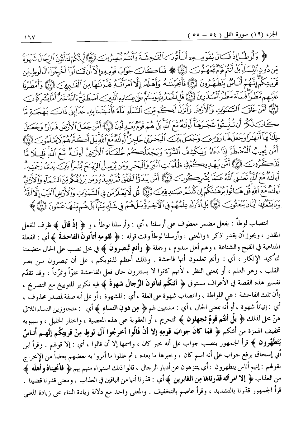 انْتِصَابُ لُوطًا: بِفِعْلٍ مُضْمَرٍ معطوف على أرسلنا، أي: وأرسلنا لوطا، وإِذْ قالَ ظَرْفٌ لِلْفِعْلِ الْمُقَدَّرِ، وَيَجُوزُ أَنْ يُقَدَّرَ اذْكُرْ وَالْمَعْنَى: وَأَرْسَلْنَا لُوطًا وَقْتَ قَوْلِهِ: لِقَوْمِهِ أَتَأْتُونَ الْفاحِشَةَ أَيِ: الْفِعْلَةَ الْمُتَنَاهِيَةَ فِي الْقُبْحِ وَالشَّنَاعَةِ، وَهُمْ أَهْلُ سَدُومَ، وَجُمْلَةُ وَأَنْتُمْ تُبْصِرُونَ فِي مَحَلِّ نَصْبٍ عَلَى الْحَالِ مُتَضَمِّنَةٌ لِتَأْكِيدِ الْإِنْكَارِ، أَيْ: وَأَنْتُمْ تَعْلَمُونَ أَنَّهَا فَاحِشَةٌ. وَذَلِكَ أَعْظَمُ لِذُنُوبِكُمْ، عَلَى أَنَّ تُبْصِرُونَ مِنْ بَصَرِ الْقَلْبِ، وَهُوَ الْعِلْمُ، أَوْ بِمَعْنَى النَّظَرِ، لِأَنَّهُمْ كَانُوا لَا يَسْتَتِرُونَ حَالَ فِعْلِ الْفَاحِشَةِ عُتُوًّا وَتَمَرُّدًا، وَقَدْ تَقَدَّمَ تَفْسِيرُ هَذِهِ الْقِصَّةِ فِي الْأَعْرَافِ مُسْتَوْفًى أَإِنَّكُمْ لَتَأْتُونَ الرِّجالَ شَهْوَةً فِيهِ تَكْرِيرٌ لِلتَّوْبِيخِ مَعَ التَّصْرِيحِ، بِأَنَّ تِلْكَ الْفَاحِشَةَ: هِيَ اللُّوَاطَةُ، وَانْتِصَابُ شَهْوَةٍ عَلَى الْعِلَّةِ، أَيْ: لِلشَّهْوَةِ، أَوْ عَلَى أَنَّهُ صِفَةٌ لِمَصْدَرٍ مَحْذُوفٍ، أَيْ: إِتْيَانًا شَهْوَةً، أَوْ أَنَّهُ بِمَعْنَى الْحَالِ، أَيْ: مُشْتَهِينَ لَهُمْ مِنْ دُونِ النِّساءِ أَيْ: مُتَجَاوِزِينَ النِّسَاءَ اللَّاتِي هُنَّ مَحَلٌّ لِذَلِكَ بَلْ أَنْتُمْ قَوْمٌ تَجْهَلُونَ التَّحْرِيمَ، أَوِ الْعُقُوبَةَ عَلَى هذه المعصية، واختار الخليل، وسيبويه تخفيف الهمزة من أإنكم فَما كانَ جَوابَ قَوْمِهِ إِلَّا أَنْ قالُوا أَخْرِجُوا آلَ لُوطٍ مِنْ قَرْيَتِكُمْ إِنَّهُمْ أُناسٌ يَتَطَهَّرُونَ قَرَأَ الْجُمْهُورُ بِنَصْبِ جَوَابَ عَلَى أَنَّهُ خَبَرُ كَانَ، وَاسْمُهَا إِلَّا أَنْ قَالُوا، أَيْ: إِلَّا قَوْلُهُمْ. وَقَرَأَ ابْنُ أَبِي إِسْحَاقَ بِرَفْعِ جَوَابٍ عَلَى أَنَّهُ اسْمُ كَانَ، وَخَبَرُهَا مَا بَعْدَهُ، ثُمَّ عَلَّلُوا مَا أَمَرُوا بِهِ بَعْضُهُمْ بَعْضًا مِنَ الْإِخْرَاجِ بِقَوْلِهِمْ: إِنَّهُمْ أُنَاسٌ يَتَطَهَّرُونَ: أَيْ يَتَنَزَّهُونَ عَنْ أَدْبَارِ الرِّجَالِ، قَالُوا ذَلِكَ اسْتِهْزَاءً مِنْهُمْ بِهِمْ فَأَنْجَيْناهُ وَأَهْلَهُ مِنَ الْعَذَابِ إِلَّا امْرَأَتَهُ قَدَّرْناها مِنَ الْغابِرِينَ أَيْ: قَدَّرْنَا أَنَّهَا مِنَ الْبَاقِينَ فِي الْعَذَابِ، وَمَعْنَى قَدَّرْنَا قَضَيْنَا.