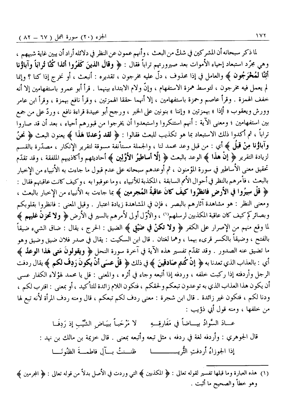 قُلْ سِيرُوا فِي الْأَرْضِ فَانْظُرُوا كَيْفَ كانَ عاقِبَةُ الْمُجْرِمِينَ بِمَا جَاءَتْ بِهِ الْأَنْبِيَاءُ مِنَ الْإِخْبَارِ بِالْبَعْثِ، وَمَعْنَى النَّظَرِ: هُوَ مُشَاهَدَةُ آثَارِهِمْ بِالْبَصَرِ، فَإِنَّ فِي الْمُشَاهَدَةِ زِيَادَةَ اعْتِبَارٍ. وَقِيلَ الْمَعْنَى: فَانْظُرُوا بِقُلُوبِكُمْ وَبَصَائِرِكُمْ كَيْفَ كَانَ عَاقِبَةُ الْمُكَذِّبِينَ لِرُسُلِهِمْ «1» ، وَالْأَوَّلُ أَوْلَى لِأَمْرِهِمْ بِالسَّيْرِ فِي الْأَرْضِ وَلا تَحْزَنْ عَلَيْهِمْ لِمَا وَقَعَ مِنْهُمْ مَنِ الْإِصْرَارِ على الكفر وَلا تَكُنْ فِي ضَيْقٍ الضَّيْقُ: الْحَرَجُ، يُقَالُ: ضَاقَ الشَّيْءُ ضَيْقًا بِالْفَتْحِ، وَضِيقًا بِالْكَسْرِ قُرِئَ بِهِمَا، وَهُمَا لُغَتَانِ. قَالَ ابْنُ السِّكِّيتِ: يُقَالُ فِي صَدْرِ فُلَانٍ ضَيْقٌ وَضِيقٌ وَهُوَ مَا تَضِيقُ عَنْهُ الصُّدُورُ. وَقَدْ تَقَدَّمَ تَفْسِيرُ هَذِهِ الْآيَةِ فِي آخرة سُورَةِ النَّحْلِ وَيَقُولُونَ مَتى هذَا الْوَعْدُ أَيْ: بِالْعَذَابِ الَّذِي تَعِدُنَا بِهِ إِنْ كُنْتُمْ صادِقِينَ فِي ذَلِكَ قُلْ عَسى أَنْ يَكُونَ رَدِفَ لَكُمْ يُقَالُ رَدِفْتُ الرَّجُلَ وَأَرْدَفْتُهُ إِذَا رَكِبْتُ خَلْفَهُ، وَرَدِفَهُ إِذَا اتَّبَعَهُ وَجَاءَ فِي أَثَرِهِ، وَالْمَعْنَى: قُلْ يَا مُحَمَّدُ لِهَؤُلَاءِ الْكُفَّارِ عَسَى أَنْ يَكُونَ هَذَا الْعَذَابُ الَّذِي بِهِ تُوعَدُونَ تَبِعَكُمْ وَلَحِقَكُمْ، فَتَكُونُ اللَّامُ زَائِدَةً لِلتَّأْكِيدِ، أَوْ بِمَعْنَى: اقْتَرَبَ لَكُمْ، وَدَنَا لَكُمْ، فَتَكُونُ غَيْرَ زَائِدَةٍ. قَالَ ابْنُ شَجَرَةَ: مَعْنَى رَدِفَ لَكُمْ تَبِعَكُمْ، قَالَ وَمِنْهُ رِدْفُ الْمَرْأَةِ لِأَنَّهُ تَبَعٌ لَهَا مِنْ خَلْفِهَا، وَمِنْهُ قَوْلُ أَبِي ذُؤَيْبٍ: