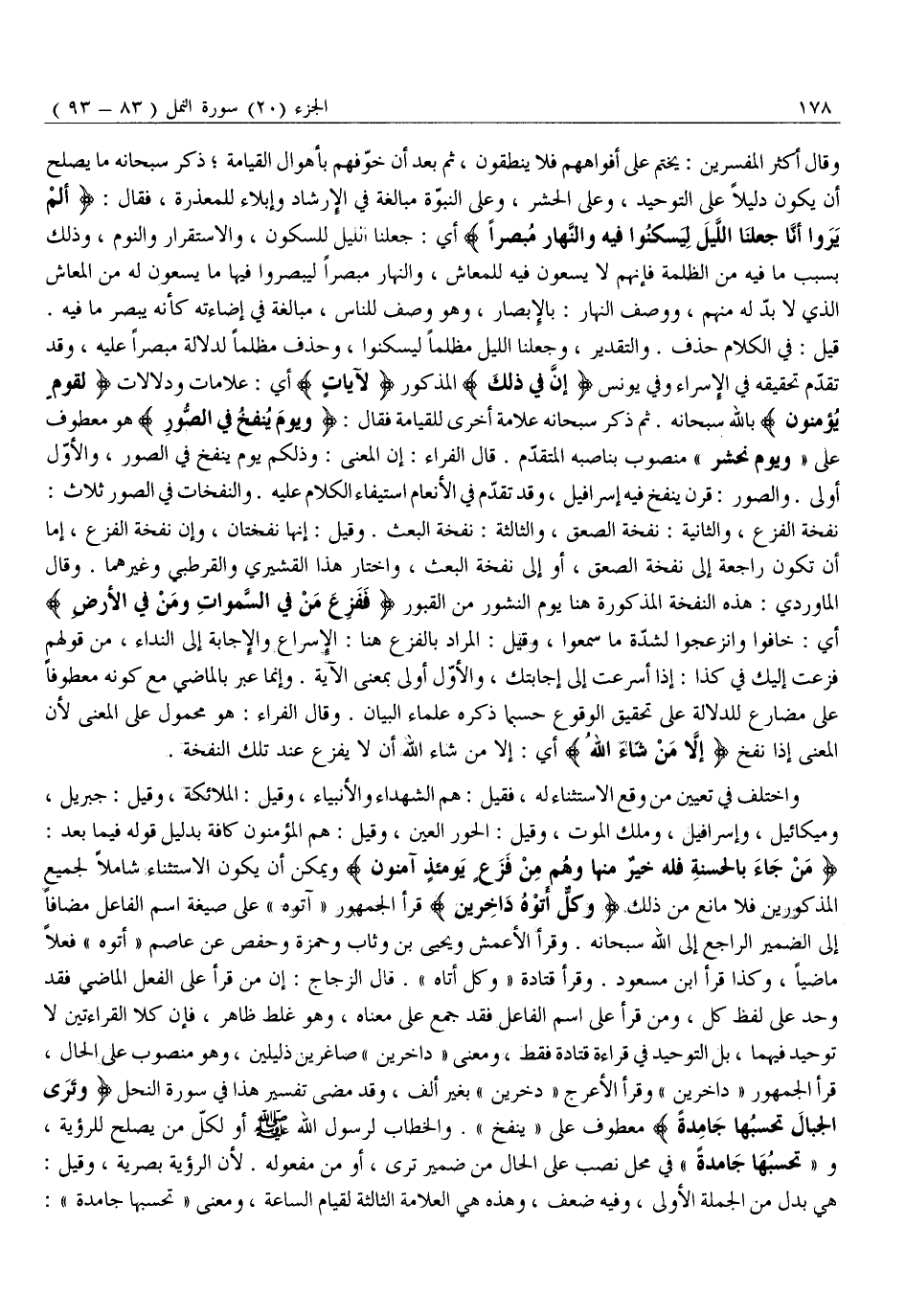 قِيلَ: فِي الْكَلَامِ حَذْفٌ. وَالتَّقْدِيرُ، وَجَعَلْنَا اللَّيْلَ مُظْلِمًا لِيَسْكُنُوا، وَحَذَفَ مُظْلِمًا لِدَلَالَةِ مُبْصِرًا عَلَيْهِ، وَقَدْ تَقَدَّمَ تَحْقِيقُهُ فِي الْإِسْرَاءِ وَفِي يُونُسَ إِنَّ فِي ذلِكَ الْمَذْكُورِ لَآياتٍ أَيْ: عَلَامَاتٍ وَدَلَالَاتٍ لِقَوْمٍ يُؤْمِنُونَ بِاللَّهِ سُبْحَانَهُ. ثُمَّ ذَكَرَ سُبْحَانَهُ عَلَامَةً أُخْرَى لِلْقِيَامَةِ فَقَالَ: وَيَوْمَ يُنْفَخُ فِي الصُّورِ هُوَ مَعْطُوفٌ عَلَى «وَيَوْمَ نَحْشُرُ» مَنْصُوبٌ بِنَاصِبِهِ الْمُتَقَدِّمِ. قَالَ الْفَرَّاءُ: إِنَّ الْمَعْنَى: وَذَلِكُمْ يَوْمَ يُنْفَخُ فِي الصُّورِ، وَالْأَوَّلُ أَوْلَى. وَالصُّورُ: قَرْنٌ يَنْفُخُ فِيهِ إِسْرَافِيلُ، وَقَدْ تَقَدَّمَ فِي الْأَنْعَامِ اسْتِيفَاءُ الْكَلَامِ عَلَيْهِ. والنفخات في الصور ثلاث: