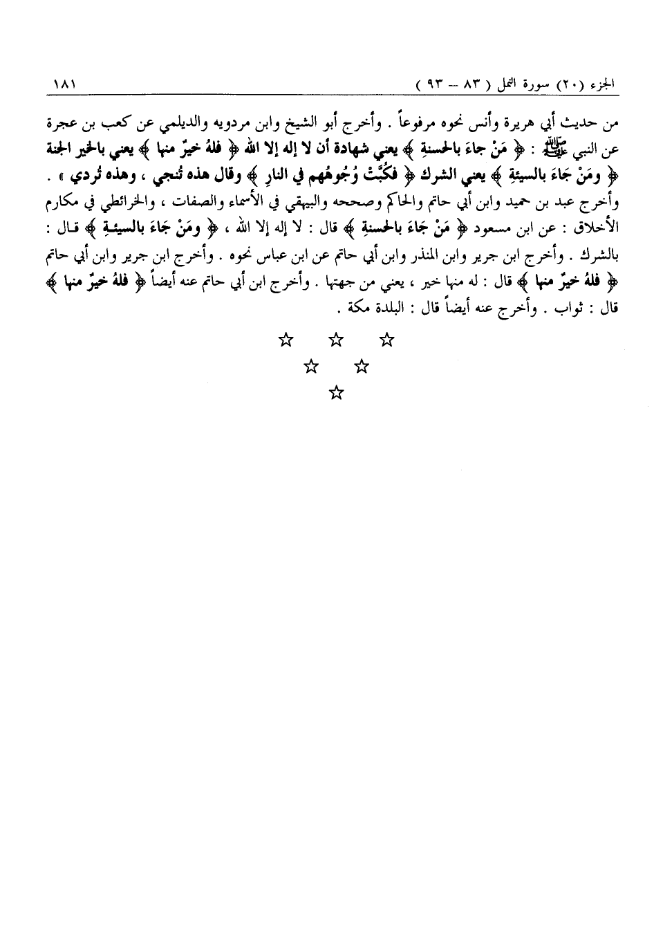 من حديث أبي هريرة وأنس نحوه مَرْفُوعًا. وَأَخْرَجَ أَبُو الشَّيْخِ وَابْنُ مَرْدَوَيْهِ وَالدَّيْلَمِيُّ عَنْ كَعْبِ بْنِ عُجْرَةَ عَنِ النَّبِيِّ صَلَّى اللَّهُ عَلَيْهِ وَسَلَّمَ: مَنْ جاءَ بِالْحَسَنَةِ يَعْنِي شَهَادَةَ أَنْ لَا إِلَهَ إِلَّا اللَّهُ فَلَهُ خَيْرٌ مِنْها يَعْنِي بِالْخَيْرِ الْجَنَّةَ وَمَنْ جاءَ بِالسَّيِّئَةِ يَعْنِي الشِّرْكَ فَكُبَّتْ وُجُوهُهُمْ فِي النَّارِ وَقَالَ هَذِهِ تُنْجِي، وَهَذِهِ تُرْدِي» .