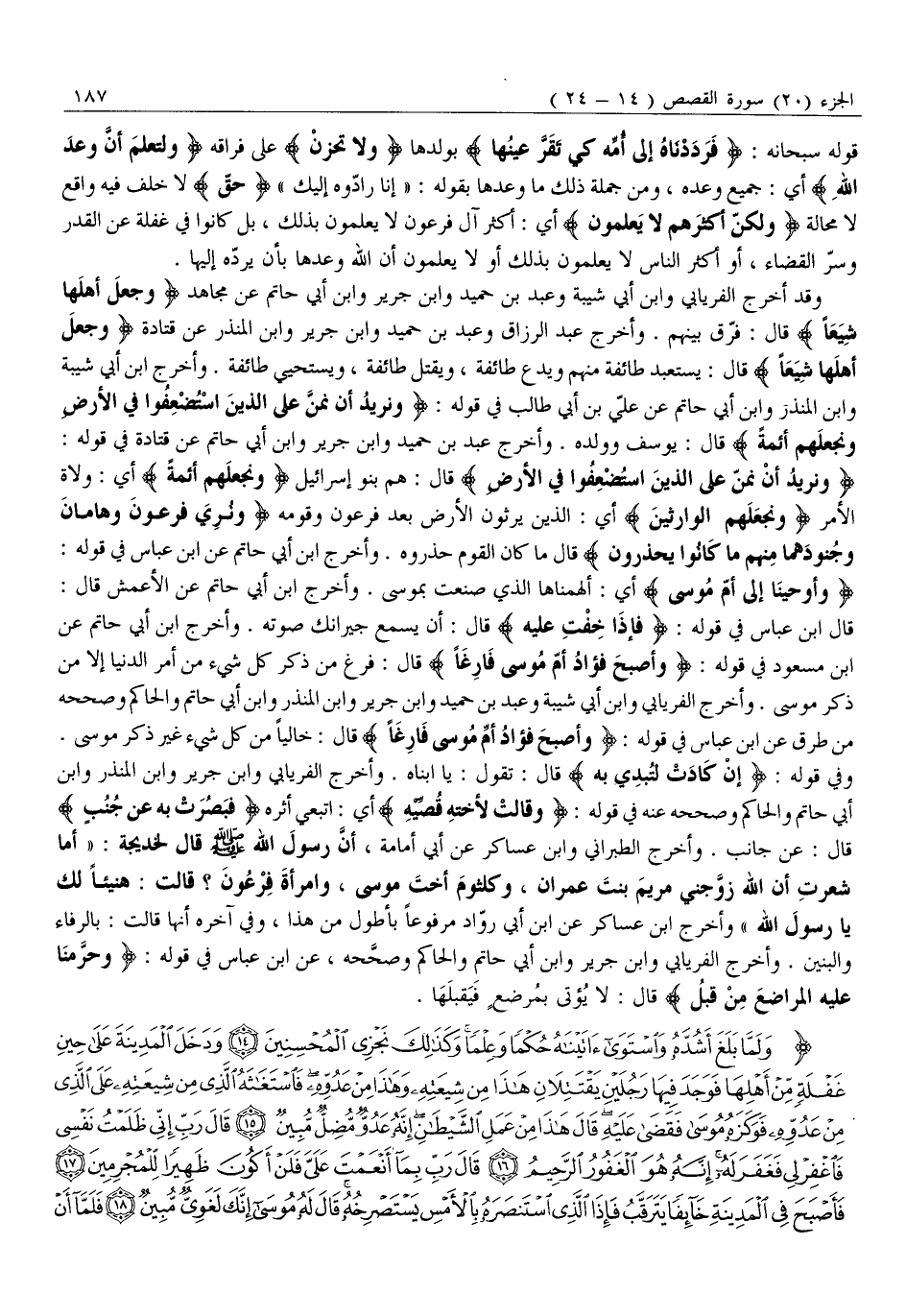 قَالَ ابْنُ عَبَّاسٍ فِي قَوْلِهِ: فَإِذا خِفْتِ عَلَيْهِ قَالَ: أَنْ يَسْمَعَ جِيرَانُكِ صَوْتَهُ. وَأَخْرَجَ ابْنُ أَبِي حَاتِمٍ عَنِ ابْنِ مَسْعُودٍ فِي قَوْلِهِ: وَأَصْبَحَ فُؤادُ أُمِّ مُوسى فارِغاً قَالَ: فَرَغَ مِنْ ذِكْرِ كُلِّ شَيْءٍ مِنْ أَمْرِ الدُّنْيَا إِلَّا مِنْ ذِكْرِ مُوسَى. وَأَخْرَجَ الْفِرْيَابِيُّ وَابْنُ أَبِي شَيْبَةَ وَعَبْدُ بْنُ حُمَيْدٍ وَابْنُ جَرِيرٍ وَابْنُ الْمُنْذِرِ وَابْنُ أَبِي حَاتِمٍ وَالْحَاكِمُ وَصَحَّحَهُ مِنْ طُرُقٍ عَنِ ابْنِ عَبَّاسٍ فِي قَوْلِهِ: وَأَصْبَحَ فُؤادُ أُمِّ مُوسى فارِغاً قَالَ: خَالِيًا مِنْ كُلِّ شَيْءٍ غَيْرَ ذِكْرِ مُوسَى.