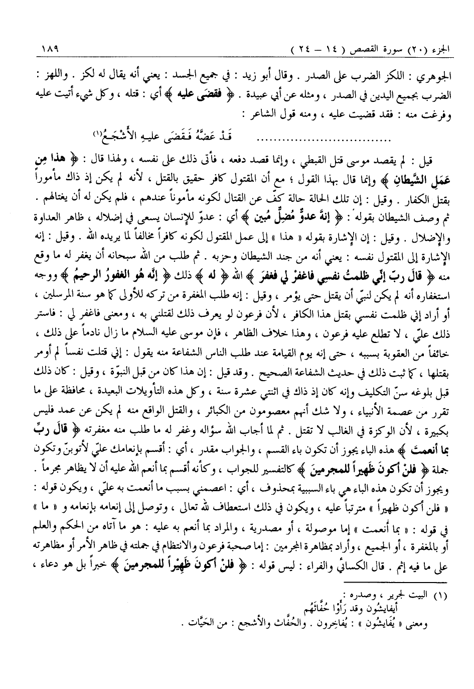 ثُمَّ وَصَفَ الشَّيْطَانَ بِقَوْلِهِ: إِنَّهُ عَدُوٌّ مُضِلٌّ مُبِينٌ أَيْ: عَدُوٌّ لِلْإِنْسَانِ يَسْعَى فِي إِضْلَالِهِ، ظَاهِرُ الْعَدَاوَةِ وَالْإِضْلَالِ. وَقِيلَ: إِنَّ الْإِشَارَةَ بِقَوْلِهِ «هَذَا» إِلَى عَمَلِ الْمَقْتُولِ لِكَوْنِهِ كَافِرًا مُخَالِفًا لِمَا يُرِيدُهُ اللَّهُ. وَقِيلَ: إِنَّهُ الإشارة إِلَى الْمَقْتُولِ نَفْسِهِ: يَعْنِي أَنَّهُ مِنْ جُنْدِ الشَّيْطَانِ وَحِزْبِهِ. ثُمَّ طَلَبَ مِنَ اللَّهِ سُبْحَانَهُ أَنْ يَغْفِرَ لَهُ مَا وَقَعَ مِنْهُ قالَ رَبِّ إِنِّي ظَلَمْتُ نَفْسِي فَاغْفِرْ لِي فَغَفَرَ اللَّهُ لَهُ ذَلِكَ إِنَّهُ هُوَ الْغَفُورُ الرَّحِيمُ وَوَجْهُ اسْتِغْفَارِهِ أَنَّهُ لَمْ يَكُنْ لِنَبِيٍّ أَنْ يَقْتُلَ حَتَّى يُؤْمَرَ، وَقِيلَ: إِنَّهُ طَلَبَ الْمَغْفِرَةَ مِنْ تَرْكِهِ لِلْأَوْلَى كَمَا هُوَ سُنَّةُ الْمُرْسَلِينَ، أَوْ أَرَادَ إِنِّي ظَلَمْتُ نَفْسِي بِقَتْلِ هَذَا الْكَافِرِ، لِأَنَّ فِرْعَوْنَ لَوْ يَعْرِفُ ذَلِكَ لَقَتَلَنِي بِهِ، وَمَعْنَى فَاغْفِرْ لِي: فَاسْتُرْ ذَلِكَ عَلَيَّ، لَا تُطْلِعْ عَلَيْهِ فِرْعَوْنَ، وَهَذَا خِلَافُ الظَّاهِرِ، فَإِنَّ مُوسَى عَلَيْهِ السَّلَامُ مَا زَالَ نَادِمًا عَلَى ذَلِكَ، خَائِفًا مِنَ الْعُقُوبَةِ بِسَبَبِهِ، حَتَّى إِنَّهُ يَوْمَ الْقِيَامَةِ عِنْدَ طَلَبِ النَّاسِ الشَّفَاعَةَ منه يقول: إني قتلت نفسا لم أومر بِقَتْلِهَا، كَمَا ثَبَتَ ذَلِكَ فِي حَدِيثِ الشَّفَاعَةِ الصحيح. وقد قيل: إن هذا كان من قَبْلَ النُّبُوَّةِ، وَقِيلَ: كَانَ ذَلِكَ قَبْلَ بُلُوغِهِ سِنَّ التَّكْلِيفِ وَإِنَّهُ كَانَ إِذْ ذَاكَ فِي اثْنَتَيْ عَشْرَةَ سَنَةً، وَكُلُّ هَذِهِ التَّأْوِيلَاتِ الْبَعِيدَةِ، مُحَافِظَةٌ عَلَى مَا تَقَرَّرَ مِنْ عِصْمَةِ الْأَنْبِيَاءِ، وَلَا شَكَّ أَنَّهُمْ مَعْصُومُونَ مِنَ الْكَبَائِرِ، وَالْقَتْلُ الْوَاقِعُ مِنْهُ لَمْ يَكُنْ عَنْ عَمْدٍ فَلَيْسَ بِكَبِيرَةٍ، لِأَنَّ الْوَكْزَةَ فِي الْغَالِبِ لَا تَقْتُلُ. ثُمَّ لَمَّا أَجَابَ اللَّهُ سُؤَالَهُ وَغَفَرَ لَهُ مَا طَلَبَ مِنْهُ مَغْفِرَتَهُ قالَ رَبِّ بِما أَنْعَمْتَ هَذِهِ الْبَاءُ يَجُوزُ أَنْ تَكُونَ بَاءَ الْقَسَمِ، وَالْجَوَابُ مُقَدَّرٌ، أَيْ: أُقْسِمُ بِإِنْعَامِكَ عَلَيَّ لَأَتُوبَنَّ وَتَكُونُ جُمْلَةُ فَلَنْ أَكُونَ ظَهِيراً لِلْمُجْرِمِينَ كَالتَّفْسِيرِ لِلْجَوَابِ، وَكَأَنَّهُ أَقْسَمَ بِمَا أَنْعَمَ اللَّهُ عَلَيْهِ أَنْ لَا يُظَاهِرَ مُجْرِمًا.