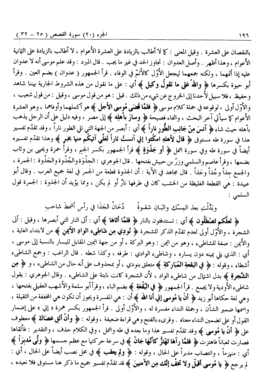 بالنقصان على العشرة. وقيل المعنى: كَمَا لَا أُطَالِبُ بِالزِّيَادَةِ عَلَى الْعَشَرَةِ الْأَعْوَامِ، لَا أُطَالِبُ بِالزِّيَادَةِ عَلَى الثَّمَانِيَةِ الْأَعْوَامِ، وَهَذَا أَظْهَرُ. وَأَصْلُ الْعُدْوَانِ: تَجَاوُزُ الْحَدِّ فِي غَيْرِ مَا يَجِبُ. قَالَ الْمُبَرِّدُ: وَقَدْ عَلِمَ مُوسَى أَنَّهُ لَا عُدْوَانَ عَلَيْهِ إِذَا أَتَمَّهُمَا، وَلَكِنَّهُ جَمَعَهُمَا لِيَجْعَلَ الْأَوَّلَ كَالْأَتَمِّ فِي الْوَفَاءِ. قَرَأَ الْجُمْهُورُ (عُدْوَانَ) بِضَمِّ الْعَيْنِ. وَقَرَأَ أَبُو حَيْوَةَ بِكَسْرِهَا وَاللَّهُ عَلى مَا نَقُولُ وَكِيلٌ أَيْ: عَلَى مَا نَقُولُ مِنْ هَذِهِ الشُّرُوطِ الْجَارِيَةِ بَيْنَنَا شَاهِدٌ وَحَفِيظٌ، فَلَا سَبِيلَ لِأَحَدِنَا إِلَى الْخُرُوجِ عَنْ شَيْءٍ مِنْ ذَلِكَ. قِيلَ: هُوَ مِنْ قَوْلِ مُوسَى، وَقِيلَ: مِنْ قَوْلِ شُعَيْبٍ، وَالْأَوَّلُ أَوْلَى، لِوُقُوعِهِ فِي جُمْلَةِ كَلَامِ مُوسَى فَلَمَّا قَضى مُوسَى الْأَجَلَ هُوَ أَكْمَلُهُمَا وَأَوْفَاهُمَا، وَهُوَ الْعَشْرَةُ الْأَعْوَامِ كَمَا سَيَأْتِي آخِرَ الْبَحْثِ، وَالْفَاءُ فَصِيحَةٌ وَسارَ بِأَهْلِهِ إِلَى مِصْرَ، وَفِيهِ دَلِيلٌ عَلَى أَنَّ الرَّجُلَ يَذْهَبُ بِأَهْلِهِ حَيْثُ شَاءَ آنَسَ مِنْ جانِبِ الطُّورِ نَارًا أَيْ: أَبْصَرَ مِنَ الْجِهَةِ الَّتِي تَلِي الطُّورَ نَارًا، وَقَدْ تَقَدَّمَ تَفْسِيرُ هَذَا فِي سُورَةِ طه مُسْتَوْفًى قالَ لِأَهْلِهِ امْكُثُوا إِنِّي آنَسْتُ نَارًا لَعَلِّي آتِيكُمْ مِنْها بِخَبَرٍ وَهَذَا تَقَدَّمَ تَفْسِيرُهُ أَيْضًا فِي سُورَةِ طه وَفِي سُورَةِ النَّمْلِ أَوْ جَذْوَةٍ قَرَأَ الْجُمْهُورُ بِكَسْرِ الْجِيمِ، وَقَرَأَ حَمْزَةُ وَيَحْيَى بْنُ وَثَّابٍ بِضَمِّهَا، وَقَرَأَ عَاصِمٌ وَالسُّلَمِيُّ وَزِرُّ بْنُ حُبَيْشٍ بِفَتْحِهَا. قَالَ الْجَوْهَرِيُّ: الجذوة والجذوة والجذوة: الجمرة، والجمع جذا وجذا وجذا. قَالَ مُجَاهِدٌ فِي الْآيَةِ: أَنَّ الْجَذْوَةَ قِطْعَةٌ مِنَ الْجَمْرِ فِي لُغَةِ جَمِيعِ الْعَرَبِ. وَقَالَ أَبُو عُبَيْدَةَ: هِيَ الْقِطْعَةُ الْغَلِيظَةُ مِنَ الْخَشَبِ كان في طرفها نار أو لم يكن، ومما يُؤَيِّدُ أَنَّ الْجَذْوَةَ: الْجَمْرَةُ قَوْلُ السُّلَمِيِّ:
