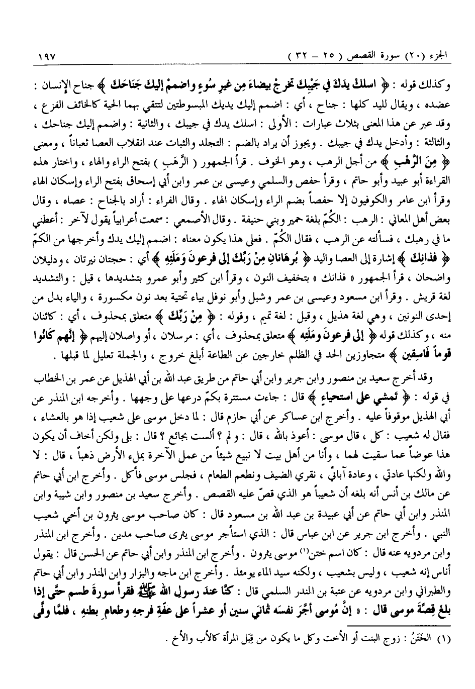 عَضُدُهُ، وَيُقَالُ لِلْيَدِ كُلِّهَا: جَنَاحٌ، أَيِ: اضْمُمْ إِلَيْكَ يَدَيْكَ الْمَبْسُوطَتَيْنِ لِتَتَّقِيَ بِهِمَا الْحَيَّةَ كَالْخَائِفِ الْفَزِعِ، وَقَدْ عَبَّرَ عَنْ هَذَا الْمَعْنَى بِثَلَاثِ عِبَارَاتٍ: الْأُولَى: اسْلُكْ يَدَكَ فِي جيبك، والثانية: واضمم إليك جناحك، والثالثة: وأدخل يَدَكَ فِي جَيْبِكَ. وَيَجُوزُ أَنْ يُرَادَ بِالضَّمِّ: التَّجَلُّدُ وَالثَّبَاتُ عِنْدَ انْقِلَابِ الْعَصَا ثُعْبَانًا، وَمَعْنَى مِنَ الرَّهْبِ مِنْ أَجْلِ الرَّهْبِ، وَهُوَ الْخَوْفُ. قَرَأَ الْجُمْهُورُ (الرَّهَبِ) بِفَتْحِ الرَّاءِ وَالْهَاءِ، وَاخْتَارَ هَذِهِ الْقِرَاءَةَ أَبُو عُبَيْدٍ وَأَبُو حَاتِمٍ، وقرأ حَفْصٌ وَالسُّلَمِيُّ وَعِيسَى بْنُ عُمَرَ وَابْنُ أَبِي إِسْحَاقَ بِفَتْحِ الرَّاءِ وَإِسْكَانِ الْهَاءِ وَقَرَأَ ابْنُ عَامِرٍ وَالْكُوفِيُّونَ إِلَّا حَفْصًا بِضَمِّ الرَّاءِ وَإِسْكَانِ الْهَاءِ. وَقَالَ الْفَرَّاءُ: أَرَادَ بِالْجَنَاحِ: عَصَاهُ، وَقَالَ بَعْضُ أَهْلِ الْمَعَانِي: الرَّهَبُ: الْكُمُّ بِلُغَةِ حِمْيَرَ وبني حنيفة. وقال الْأَصْمَعِيُّ: سَمِعْتُ أَعْرَابِيًّا يَقُولُ لِآخَرَ: أَعْطِنِي مَا فِي رَهَبِكَ، فَسَأَلْتُهُ عَنِ الرَّهَبِ، فَقَالَ الْكُمُّ. فَعَلَى هَذَا يَكُونُ مَعْنَاهُ: اضْمُمْ إِلَيْكَ يَدَكَ وَأَخْرِجْهَا مِنَ الْكُمِّ فَذانِكَ إِشَارَةٌ إِلَى الْعَصَا واليد بُرْهانانِ مِنْ رَبِّكَ إِلى فِرْعَوْنَ وَمَلَائِهِ أَيْ: حُجَّتَانِ نَيِّرَتَانِ، وَدَلِيلَانِ وَاضِحَانِ، قَرَأَ الْجُمْهُورُ «فَذَانِكَ» بِتَخْفِيفِ النُّونِ، وَقَرَأَ ابْنُ كَثِيرٍ وَأَبُو عَمْرٍو بِتَشْدِيدِهَا، قِيلَ: وَالتَّشْدِيدُ لُغَةُ قُرَيْشٍ. وَقَرَأَ ابْنُ مَسْعُودٍ وَعِيسَى بْنُ عُمَرَ وَشِبْلٌ وَأَبُو نوفل بياء تَحْتِيَّةٍ بَعْدَ نُونٍ مَكْسُورَةٍ، وَالْيَاءُ بَدَلٌ مِنْ إِحْدَى النُّونَيْنِ، وَهِيَ لُغَةُ هُذَيْلٍ، وَقِيلَ: لُغَةُ تَمِيمٍ، وَقَوْلُهُ: مِنْ رَبِّكَ مُتَعَلِّقٌ بِمَحْذُوفٍ، أَيْ: كائنان منه، وكذلك قوله إِلى فِرْعَوْنَ وَمَلَائِهِ مُتَعَلِّقٌ بِمَحْذُوفٍ، أَيْ: مُرْسَلَانِ، أَوْ وَاصِلَانِ إِلَيْهِمْ إِنَّهُمْ كانُوا قَوْماً فاسِقِينَ مُتَجَاوِزِينَ الْحَدَّ فِي الظُّلْمِ خَارِجِينَ عَنِ الطَّاعَةِ أَبْلَغَ خُرُوجٍ، وَالْجُمْلَةُ تَعْلِيلٌ لِمَا قَبْلَهَا.