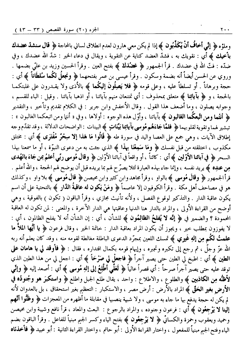 وَمَلَؤُهُ إِنِّي أَخافُ أَنْ يُكَذِّبُونِ إِذَا لَمْ يَكُنْ مَعِي هَارُونُ لِعَدَمِ انْطِلَاقِ لِسَانِي بِالْمُحَاجَّةِ قالَ سَنَشُدُّ عَضُدَكَ بِأَخِيكَ أَيْ: نُقَوِّيكَ بِهِ، فَشَدُّ الْعَضُدِ كِنَايَةٌ عَنِ التَّقْوِيَةِ، وَيُقَالُ فِي دُعَاءِ الْخَيْرِ: شَدَّ اللَّهُ عَضُدَكَ، وَفِي ضِدِّهِ: فَتَّ اللَّهُ فِي عَضُدِكَ. قَرَأَ الْجُمْهُورُ عَضُدَكَ بِفَتْحِ الْعَيْنِ. وَقَرَأَ الْحُسَيْنُ وَزَيْدُ بْنُ عَلِيٍّ بضمها.