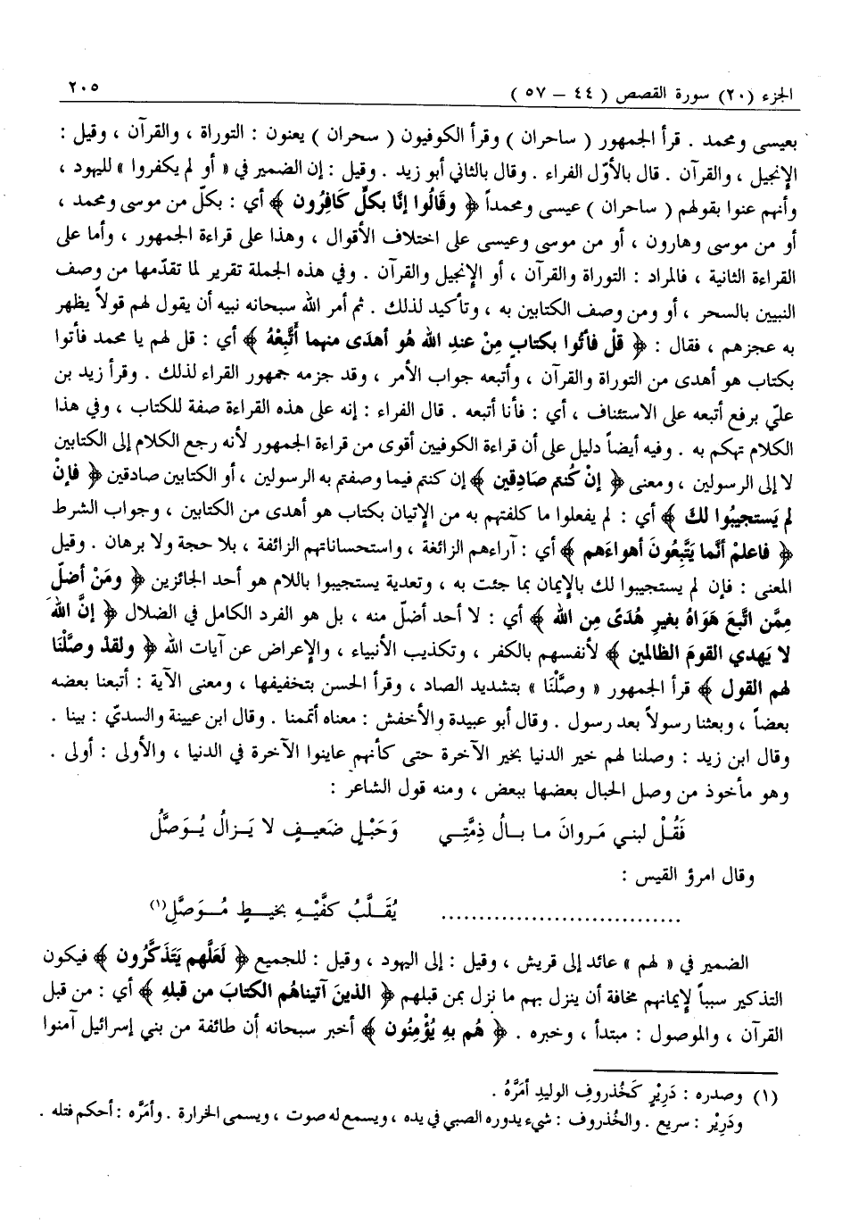 الْإِنْجِيلُ، وَالْقُرْآنُ. قَالَ بِالْأَوَّلِ الْفَرَّاءُ. وَقَالَ بِالثَّانِي أَبُو زَيْدٍ. وقيل: إن الضمير في «أو لم يَكْفُرُوا» لِلْيَهُودِ، وَأَنَّهُمْ عَنَوْا بِقَوْلِهِمْ (سَاحِرَانِ) عِيسَى وَمُحَمَّدًا وَقالُوا إِنَّا بِكُلٍّ كافِرُونَ أَيْ: بِكُلٍّ مِنْ مُوسَى وَمُحَمَّدٍ، أَوْ مِنْ مُوسَى وَهَارُونَ، أَوْ مِنْ مُوسَى وَعِيسَى عَلَى اخْتِلَافِ الْأَقْوَالِ، وَهَذَا عَلَى قِرَاءَةِ الْجُمْهُورِ، وَأَمَّا عَلَى الْقِرَاءَةِ الثَّانِيَةِ، فَالْمُرَادُ: التَّوْرَاةُ وَالْقُرْآنُ، أَوِ الْإِنْجِيلُ وَالْقُرْآنُ. وَفِي هَذِهِ الْجُمْلَةِ تَقْرِيرٌ لِمَا تَقَدَّمَهَا مِنْ وصف النبيين بالسحر، أو ومن وصف الكتابين به، وتأكيد لذلك. ثُمَّ أَمَرَ اللَّهُ سُبْحَانَهُ نَبِيَّهُ أَنْ يَقُولَ لَهُمْ قَوْلًا يَظْهَرُ بِهِ عَجْزُهُمْ، فَقَالَ: قُلْ فَأْتُوا بِكِتابٍ مِنْ عِنْدِ اللَّهِ هُوَ أَهْدى مِنْهُما أَتَّبِعْهُ أَيْ: قُلْ لَهُمْ يَا مُحَمَّدُ فَأْتُوا بِكِتَابٍ هُوَ أَهْدَى مِنَ التَّوْرَاةِ وَالْقُرْآنِ، وَأَتَّبِعْهُ جَوَابُ الْأَمْرِ، وَقَدْ جَزَمَهُ جُمْهُورُ الْقُرَّاءِ لِذَلِكَ. وَقَرَأَ زَيْدُ بْنُ عَلِيٍّ بِرَفْعِ أَتَّبِعُهُ عَلَى الِاسْتِئْنَافِ، أَيْ: فَأَنَا أَتَّبِعُهُ. قَالَ الْفَرَّاءُ: إِنَّهُ عَلَى هَذِهِ الْقِرَاءَةِ صِفَةٌ لِلْكِتَابِ، وَفِي هَذَا الْكَلَامِ تَهَكُّمٌ بِهِ. وَفِيهِ أَيْضًا دَلِيلٌ عَلَى أَنَّ قِرَاءَةَ الْكُوفِيِّينَ أَقْوَى مِنْ قِرَاءَةِ الْجُمْهُورِ لِأَنَّهُ رَجَعَ الْكَلَامُ إِلَى الْكِتَابَيْنِ لَا إِلَى الرَّسُولَيْنِ، وَمَعْنَى إِنْ كُنْتُمْ صادِقِينَ إِنْ كُنْتُمْ فِيمَا وَصَفْتُمْ بِهِ الرَّسُولَيْنِ، أَوِ الْكِتَابَيْنِ صَادِقِينَ فَإِنْ لَمْ يَسْتَجِيبُوا لَكَ أَيْ: لَمْ يَفْعَلُوا مَا كَلَّفْتَهُمْ بِهِ مِنَ الْإِتْيَانِ بِكِتَابٍ هُوَ أَهْدَى مِنَ الْكِتَابَيْنِ، وَجَوَابُ الشَّرْطِ فَاعْلَمْ أَنَّما يَتَّبِعُونَ أَهْواءَهُمْ أَيْ: آرَاءَهُمُ الزَّائِغَةَ، وَاسْتِحْسَانَاتِهِمُ الزَّائِفَةَ، بِلَا حُجَّةٍ وَلَا بُرْهَانٍ. وَقِيلَ الْمَعْنَى: فَإِنْ لَمْ يَسْتَجِيبُوا لَكَ بِالْإِيمَانِ بِمَا جِئْتَ بِهِ، وَتَعْدِيَةُ يَسْتَجِيبُوا بِاللَّامِ هُوَ أَحَدُ الْجَائِزَيْنِ وَمَنْ أَضَلُّ مِمَّنِ اتَّبَعَ هَواهُ بِغَيْرِ هُدىً مِنَ اللَّهِ أَيْ: لَا أَحَدَ أَضَلُّ مِنْهُ، بَلْ هُوَ الْفَرْدُ الْكَامِلُ فِي الضَّلَالِ إِنَّ اللَّهَ لَا يَهْدِي الْقَوْمَ الظَّالِمِينَ لِأَنْفُسِهِمْ بِالْكُفْرِ، وَتَكْذِيبِ الْأَنْبِيَاءِ، وَالْإِعْرَاضِ عَنْ آيَاتِ اللَّهِ وَلَقَدْ وَصَّلْنا لَهُمُ الْقَوْلَ قَرَأَ الْجُمْهُورُ «وَصَّلْنَا» بِتَشْدِيدِ الصَّادِ، وَقَرَأَ الْحَسَنُ بِتَخْفِيفِهَا، وَمَعْنَى الْآيَةِ: أَتْبَعْنَا بَعْضَهُ بَعْضًا، وَبَعَثْنَا رَسُولًا بَعْدَ رَسُولٍ. وَقَالَ أَبُو عُبَيْدَةَ وَالْأَخْفَشُ: مَعْنَاهُ أَتْمَمْنَا. وَقَالَ ابْنُ عُيَيْنَةَ وَالسُّدِّيُّ: بَيَّنَّا.