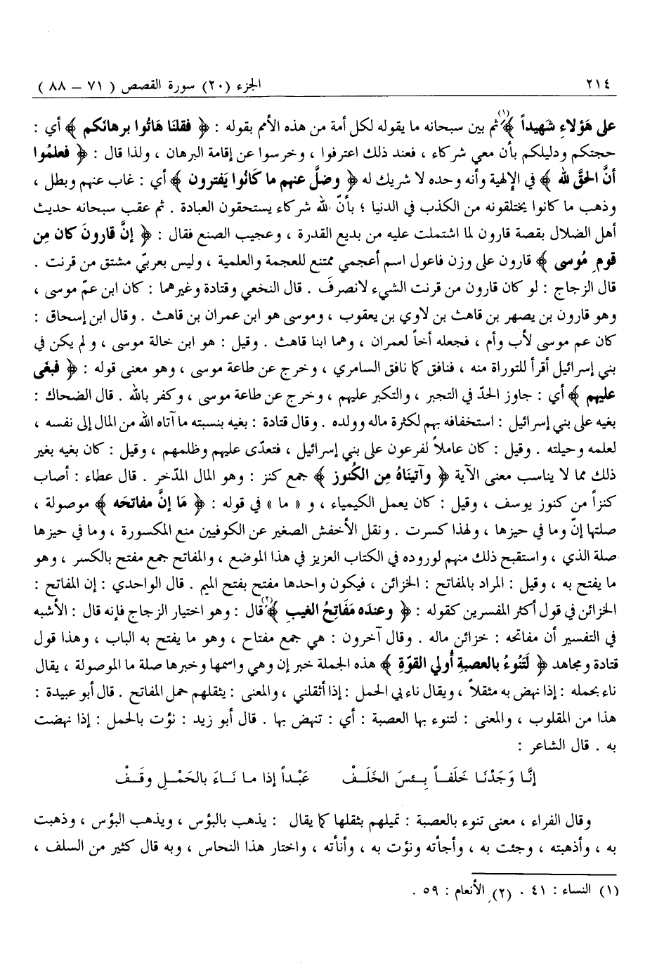 حُجَّتَكُمْ وَدَلِيلَكُمْ بِأَنَّ مَعِي شُرَكَاءَ، فَعِنْدَ ذَلِكَ اعْتَرَفُوا، وَخَرِسُوا عَنْ إِقَامَةِ الْبُرْهَانِ، وَلِذَا قَالَ: فَعَلِمُوا أَنَّ الْحَقَّ لِلَّهِ فِي الْإِلَهِيَّةِ وَأَنَّهُ وَحْدَهُ لَا شَرِيكَ لَهُ وَضَلَّ عَنْهُمْ مَا كانُوا يَفْتَرُونَ أَيْ: غَابَ عَنْهُمْ وَبَطَلَ، وَذَهَبَ مَا كَانُوا يَخْتَلِقُونَهُ مِنَ الْكَذِبِ فِي الدُّنْيَا بِأَنَّ لِلَّهِ شُرَكَاءَ يَسْتَحِقُّونَ الْعِبَادَةَ. ثُمَّ عَقَّبَ سُبْحَانَهُ حَدِيثَ أَهْلِ الضَّلَالِ بِقِصَّةِ قَارُونَ لِمَا اشْتَمَلَتْ عَلَيْهِ مِنْ بَدِيعِ الْقُدْرَةِ، وَعَجِيبِ الصُّنْعِ فَقَالَ: إِنَّ قارُونَ كانَ مِنْ قَوْمِ مُوسى قَارُونُ عَلَى وَزْنِ فَاعُولِ اسْمٌ أَعْجَمِيٌّ مُمْتَنِعٌ لِلْعُجْمَةِ وَالْعَلَمِيَّةِ، وَلَيْسَ بِعَرَبِيٍّ مُشْتَقٍّ مِنْ قَرَنْتُ.