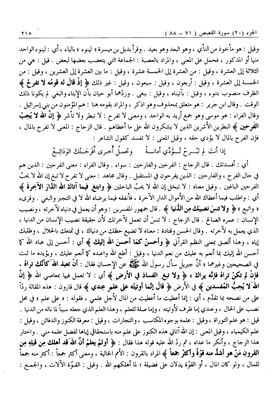 أَيْ: أَفْسَدَتْكَ. قَالَ الزَّجَّاجُ: الْفَرِحِينَ وَالْفَارِحِينَ: سَوَاءٌ. وَقَالَ الْفَرَّاءُ: مَعْنَى الْفَرِحِينَ: الَّذِينَ هُمْ فِي حَالِ الْفَرَحِ، وَالْفَارِحِينَ: الَّذِينَ يَفْرَحُونَ فِي الْمُسْتَقْبَلِ. وَقَالَ مُجَاهِدٌ: مَعْنَى لَا تَفْرَحْ لَا تَبْغِ إِنَّ اللَّهَ لَا يُحِبُّ الْفَرِحِينَ الْبَاغِينَ. وَقِيلَ مَعْنَاهُ: لَا تَبْخَلْ إِنَّ اللَّهَ لَا يُحِبُّ الْبَاخِلِينَ وَابْتَغِ فِيما آتاكَ اللَّهُ الدَّارَ الْآخِرَةَ أَيْ: وَاطْلُبْ فِيمَا أَعْطَاكَ اللَّهُ مِنَ الْأَمْوَالِ الدَّارَ الْآخِرَةَ، فَأَنْفِقْهُ فِيمَا يَرْضَاهُ اللَّهُ لَا فِي التَّجَبُّرِ وَالْبَغْيِ. وَقُرِئَ «وَاتَّبِعْ» وَلا تَنْسَ نَصِيبَكَ مِنَ الدُّنْيا. قَالَ جُمْهُورُ الْمُفَسِّرِينَ: وَهُوَ أَنْ يَعْمَلَ فِي دُنْيَاهُ لآخرته، ونصيب الإنسان: عمره الصالح. قال الزجاج: لَا تَنْسَ أَنْ تَعْمَلَ لِآخِرَتِكَ لِأَنَّ حَقِيقَةَ نَصِيبِ الْإِنْسَانِ مِنَ الدُّنْيَا، الَّذِي يَعْمَلُ بِهِ لِآخِرَتِهِ. وَقَالَ الْحَسَنُ وَقَتَادَةُ: مَعْنَاهُ لَا تُضِّيعْ حَظَّكَ مِنْ دُنْيَاكَ، فِي تَمَتُّعِكَ بِالْحَلَالِ، وَطَلَبِكَ إِيَّاهُ، وَهَذَا أَلْصَقُ بِمَعْنَى النَّظْمِ الْقُرْآنِيِّ وَأَحْسِنْ كَما أَحْسَنَ اللَّهُ إِلَيْكَ أَيْ: أَحْسِنْ إِلَى عِبَادِ اللَّهِ كَمَا أَحْسَنَ اللَّهُ إِلَيْكَ بِمَا أَنْعَمَ بِهِ عَلَيْكَ مِنْ نِعَمِ الدُّنْيَا، وَقِيلَ: أَطِعِ اللَّهَ وَاعْبُدْهُ كَمَا أَنْعَمَ عَلَيْكَ، وَيُؤَيِّدُهُ مَا ثَبَتَ فِي الصَّحِيحَيْنِ وَغَيْرِهِمَا «أَنَّ جِبْرِيلَ سَأَلَ رَسُولَ اللَّهِ صَلَّى اللَّهُ عَلَيْهِ وَسَلَّمَ عَنِ الْإِحْسَانِ فَقَالَ: أَنْ تَعْبُدَ اللَّهَ كَأَنَّكَ تَرَاهُ، فَإِنْ لَمْ تَكُنْ تَرَاهُ فَإِنَّهُ يَرَاكَ» وَلا تَبْغِ الْفَسادَ فِي الْأَرْضِ أَيْ: لَا تَعْمَلْ فِيهَا بِمَعَاصِي اللَّهِ إِنَّ اللَّهَ لَا يُحِبُّ الْمُفْسِدِينَ فِي الْأَرْضِ قالَ إِنَّما أُوتِيتُهُ عَلى عِلْمٍ عِنْدِي قَالَ قَارُونُ: هَذِهِ الْمَقَالَةُ رَدًّا عَلَى مَنْ نَصَحَهُ بِمَا تَقَدَّمَ، أَيْ: إِنَّمَا أُعْطِيتُ مَا أُعْطِيتُ مِنَ الْمَالِ لِأَجْلِ عِلْمِي، فَقَوْلُهُ: «عَلَى عِلْمٍ» فِي مَحَلِّ نَصْبٍ عَلَى الْحَالِ، وَعِنْدِي إِمَّا ظَرْفٌ لِأُوتِيتُهُ، وَإِمَّا صِلَةٌ لِلْعِلْمِ، وَهَذَا الْعِلْمُ الَّذِي جَعَلَهُ سَبَبًا لِمَا نَالَهُ مِنَ الدُّنْيَا.