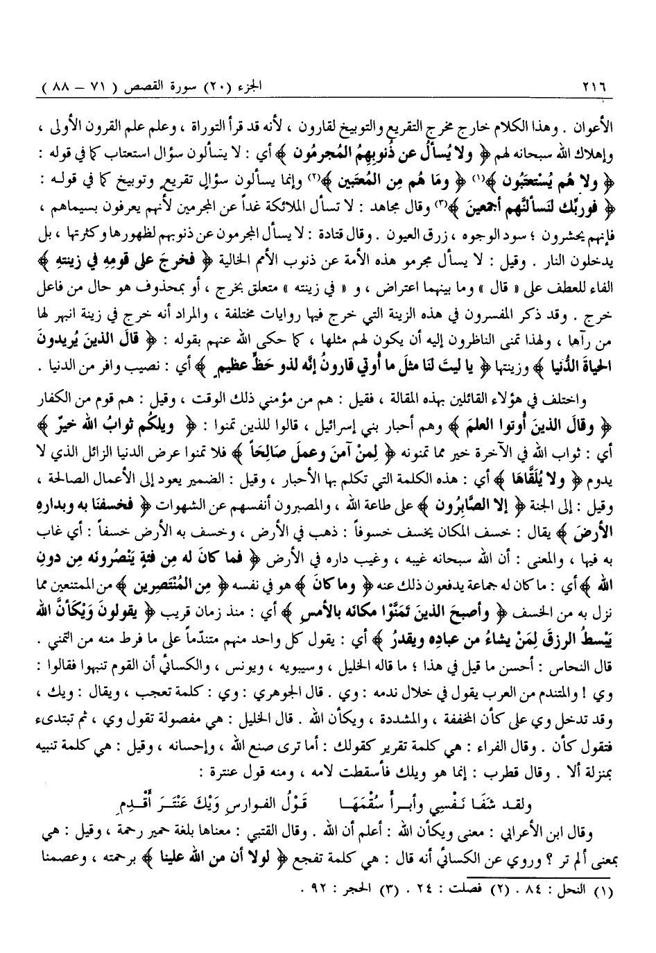 فَوَ رَبِّكَ لَنَسْئَلَنَّهُمْ أَجْمَعِينَ «3» وَقَالَ مُجَاهِدٌ: لَا تَسْأَلُ الْمَلَائِكَةُ غَدًا عَنِ الْمُجْرِمِينَ لِأَنَّهُمْ يُعْرَفُونَ بِسِيمَاهُمْ، فَإِنَّهُمْ يُحْشَرُونَ سُودَ الْوُجُوهِ، زُرْقَ الْعُيُونِ. وَقَالَ قَتَادَةُ: لَا يُسْأَلُ الْمُجْرِمُونَ عَنْ ذُنُوبِهِمْ لِظُهُورِهَا وَكَثْرَتِهَا، بَلْ يَدْخُلُونَ النَّارَ. وَقِيلَ: لَا يُسْأَلُ مُجْرِمُو هَذِهِ الْأُمَّةِ عَنْ ذُنُوبِ الْأُمَمِ الْخَالِيَةِ فَخَرَجَ عَلى قَوْمِهِ فِي زِينَتِهِ الْفَاءُ لِلْعَطْفِ عَلَى «قَالَ» وَمَا بَيْنَهُمَا اعْتِرَاضٌ، وَ «فِي زِينَتِهِ» مُتَعَلِّقٌ بِخَرَجَ، أَوْ بِمَحْذُوفٍ هُوَ حَالٌ مِنْ فَاعِلِ خَرَجَ. وَقَدْ ذَكَرَ الْمُفَسِّرُونَ فِي هَذِهِ الزِّينَةِ الَّتِي خَرَجَ فِيهَا رِوَايَاتٍ مُخْتَلِفَةً، وَالْمُرَادُ أَنَّهُ خَرَجَ فِي زِينَةٍ انْبَهَرَ لَهَا مَنْ رَآهَا، وَلِهَذَا تَمَنَّى النَّاظِرُونَ إِلَيْهِ أَنْ يَكُونَ لَهُمْ مِثْلُهَا، كَمَا حَكَى اللَّهُ عَنْهُمْ بِقَوْلِهِ: قالَ الَّذِينَ يُرِيدُونَ الْحَياةَ الدُّنْيا وَزِينَتَهَا يَا لَيْتَ لَنا مِثْلَ مَا أُوتِيَ قارُونُ إِنَّهُ لَذُو حَظٍّ عَظِيمٍ أَيْ: نَصِيبٍ وَافِرٍ مِنَ الدُّنْيَا.