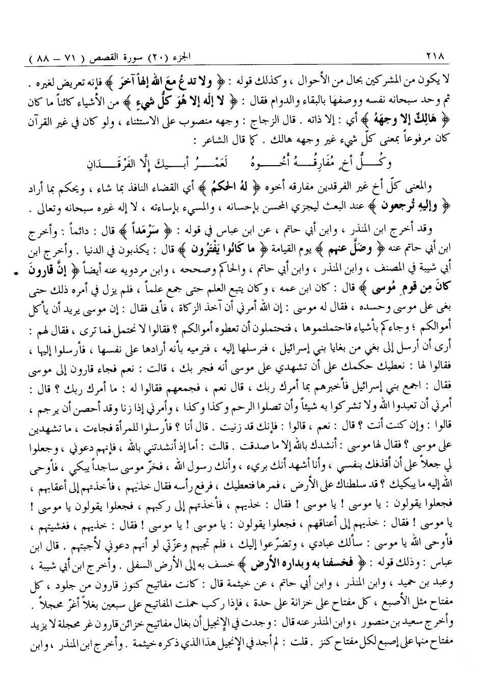 أَمَرَنِي أَنْ تَعْبُدُوا اللَّهَ وَلَا تُشْرِكُوا بِهِ شَيْئًا وَأَنْ تَصِلُوا الرحم وكذا وَكَذَا، وَأَمَرَنِي إِذَا زَنَا وَقَدْ أُحْصِنَ أَنْ يُرْجَمَ، قَالُوا: وَإِنْ كُنْتَ أَنْتَ؟ قَالَ: نَعَمْ، قَالُوا: فَإِنَّكَ قَدْ زَنَيْتَ. قَالَ أَنَا؟ فَأَرْسَلُوا للمرأة فجاءت، مَا تَشْهَدِينَ عَلَى مُوسَى؟ فَقَالَ لَهَا مُوسَى: أَنْشُدُكِ بِاللَّهِ إِلَّا مَا صَدَقْتِ. قَالَتْ: أَمَّا إذ أنشدتني بِاللَّهِ، فَإِنَّهُمْ دَعَوْنِي، وَجَعَلُوا لِي جُعْلًا عَلَى أن أقذفك بنفسي، وأنا أشهد أنك بريء، وَأَنَّكَ رَسُولُ اللَّهِ، فَخَرَّ مُوسَى سَاجِدًا يَبْكِي، فَأَوْحَى اللَّهُ إِلَيْهِ مَا يُبْكِيكَ؟ قَدْ سَلَّطْنَاكَ على الأرض، فمرها فتعطيك، فَرَفَعَ رَأْسَهُ فَقَالَ خُذِيهِمْ، فَأَخَذَتْهُمْ إِلَى أَعْقَابِهِمْ، فَجَعَلُوا يَقُولُونَ: يَا مُوسَى! يَا مُوسَى! فَقَالَ: خُذِيهِمْ، فَأَخَذَتْهُمْ إِلَى رَكْبِهِمْ، فَجَعَلُوا يَقُولُونَ يَا موسى! يا موسى! فقال: خذيهم إِلَى أَعْنَاقِهِمْ، فَجَعَلُوا يَقُولُونَ: يَا مُوسَى! يَا موسى! فقال: خذيهم، فَغَشِيَتْهُمْ، فَأَوْحَى اللَّهُ يَا مُوسَى: سَأَلَكَ عِبَادِي، وَتَضَرَّعُوا إِلَيْكَ، فَلَمْ تُجِبْهُمْ وَعِزَّتِي لَوْ أَنَّهُمْ دَعَوْنِي لَأَجَبْتُهُمْ. قَالَ ابْنُ عَبَّاسٍ: وَذَلِكَ قَوْلُهُ: فَخَسَفْنا بِهِ وَبِدارِهِ الْأَرْضَ خُسِفَ بِهِ إِلَى الْأَرْضِ السُّفْلَى. وَأَخْرَجَ ابْنُ أَبِي شَيْبَةَ، وَعَبْدُ بْنُ حُمَيْدٍ، وَابْنُ الْمُنْذِرِ، وَابْنُ أَبِي حَاتِمٍ، عَنْ خَيْثَمَةَ قَالَ: كَانَتْ مَفَاتِيحُ كُنُوزِ قَارُونَ مِنْ جُلُودٍ، كُلُّ مِفْتَاحٍ مِثْلُ الْإِصْبَعِ، كُلُّ مِفْتَاحٍ عَلَى خِزَانَةٍ عَلَى حِدَةٍ، فَإِذَا رَكِبَ حُمِلَتِ الْمَفَاتِيحُ عَلَى سَبْعِينَ بَغْلًا أَغَرَّ مُحَجَّلًا.