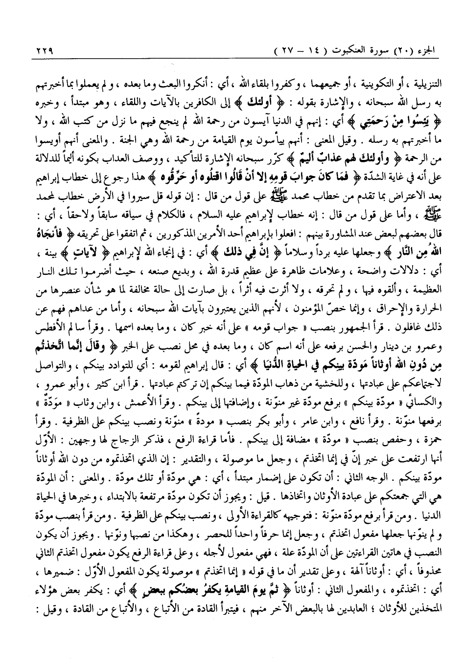 قَالَ بَعْضُهُمْ لِبَعْضٍ عِنْدِ الْمُشَاوَرَةِ بَيْنَهُمُ: افْعَلُوا بِإِبْرَاهِيمَ أَحَدَ الْأَمْرَيْنِ الْمَذْكُورَيْنِ، ثُمَّ اتَّفَقُوا عَلَى تَحْرِيقِهِ فَأَنْجاهُ اللَّهُ مِنَ النَّارِ وَجَعَلَهَا عَلَيْهِ بَرْدًا وَسَلَامًا إِنَّ فِي ذلِكَ أَيْ: فِي إِنْجَاءِ اللَّهِ لِإِبْرَاهِيمَ لَآياتٍ بَيِّنَةً، أَيْ: دَلَالَاتٍ وَاضِحَةً، وَعَلَامَاتٍ ظَاهِرَةً عَلَى عَظِيمِ قُدْرَةِ اللَّهِ، وَبَدِيعِ صُنْعِهِ، حَيْثُ أَضْرَمُوا تِلْكَ النَّارَ الْعَظِيمَةَ، وَأَلْقَوْهُ فِيهَا، وَلَمْ تَحْرِقْهُ، وَلَا أَثَّرَتْ فِيهِ أَثَرًا، بَلْ صَارَتْ إِلَى حَالَةٍ مُخَالِفَةٍ لِمَا هُوَ شَأْنُ عُنْصُرِهَا مِنَ الْحَرَارَةِ وَالْإِحْرَاقِ، وَإِنَّمَا خَصَّ الْمُؤْمِنُونَ، لِأَنَّهُمُ الَّذِينَ يَعْتَبِرُونَ بِآيَاتِ اللَّهِ سُبْحَانَهُ، وَأَمَّا مَنْ عَدَاهُمْ فَهُمْ عَنْ ذَلِكَ غَافِلُونَ. قَرَأَ الْجُمْهُورُ بِنَصْبِ «جَوَابَ قَوْمِهِ» عَلَى أَنَّهُ خَبَرُ كَانَ، وَمَا بَعْدَهُ اسْمُهَا. وَقَرَأَ سَالِمٌ الْأَفْطَسُ وَعَمْرُو بْنُ دِينَارٍ وَالْحَسَنُ بِرَفْعِهِ عَلَى أَنَّهُ اسْمُ كَانَ، وَمَا بَعْدَهُ فِي مَحَلِّ نَصْبٍ عَلَى الْخَبَرِ وَقالَ إِنَّمَا اتَّخَذْتُمْ مِنْ دُونِ اللَّهِ أَوْثاناً مَوَدَّةَ بَيْنِكُمْ فِي الْحَياةِ الدُّنْيا أَيْ: قَالَ إِبْرَاهِيمُ لِقَوْمِهِ: أَيْ لِلتَّوَادُدِ بَيْنَكُمْ، وَالتَّوَاصُلِ لِاجْتِمَاعِكُمْ عَلَى عِبَادَتِهَا، وَلِلْخَشْيَةِ مِنْ ذَهَابِ الْمَوَدَّةِ فِيمَا بَيْنَكُمْ إِنْ تَرَكْتُمْ عِبَادَتَهَا. قَرَأَ ابْنُ كَثِيرٍ، وَأَبُو عَمْرٍو، وَالْكِسَائِيُّ «مَوَدَّةُ بَيْنِكُمْ» بِرَفْعِ مَوَدَّةَ غَيْرِ مُنَوَّنَةٍ، وَإِضَافَتِهَا إِلَى بَيْنِكُمْ. وَقَرَأَ الْأَعْمَشُ، وَابْنُ وَثَّابٍ «مَوَدَّةٌ» بِرَفْعِهَا مُنَوَّنَةً. وَقَرَأَ نَافِعٌ، وَابْنُ عَامِرٍ، وَأَبُو بَكْرٍ بِنَصْبِ «مَوَدَّةَ» مُنَوَّنَةً وَنَصَبَ بَيْنَكُمْ عَلَى الظَّرْفِيَّةِ. وَقَرَأَ حَمْزَةُ، وَحَفْصٌ بِنَصْبِ «مَوَدَّةَ» مُضَافَةً إِلَى بَيْنِكُمْ. فَأَمَّا قِرَاءَةُ الرَّفْعِ، فَذَكَرَ الزَّجَّاجُ لَهَا وَجْهَيْنِ: الْأَوَّلُ أَنَّهَا ارْتَفَعَتْ عَلَى خَبَرِ إِنَّ فِي إِنَّمَا اتَّخَذْتُمْ، وَجَعَلَ مَا موصولة، وَالتَّقْدِيرُ: إِنَّ الَّذِي اتَّخَذْتُمُوهُ مِنْ دُونِ اللَّهِ أوثانا مودّة بينكم. الوجه الثَّانِي: أَنْ تَكُونَ عَلَى إِضْمَارِ مُبْتَدَأٍ، أَيْ: هِيَ مَوَدَّةٌ أَوْ تِلْكَ مَوَدَّةٌ. وَالْمَعْنَى: أَنَّ الْمَوَدَّةَ هِيَ الَّتِي جَمَعَتْكُمْ عَلَى عِبَادَةِ الْأَوْثَانِ وَاتِّخَاذِهَا. قِيلَ: وَيَجُوزُ أَنْ تَكُونَ مَوَدَّةُ مُرْتَفِعَةً بِالِابْتِدَاءِ، وَخَبَرُهَا فِي الْحَيَاةِ الدُّنْيَا. وَمَنْ قَرَأَ بِرَفْعِ مَوَدَّةَ مُنَوَّنَةً: فَتَوْجِيهُهُ كَالْقِرَاءَةِ الْأُولَى، وَنَصْبِ بَيْنِكُمْ عَلَى الظَّرْفِيَّةِ. وَمَنْ قَرَأَ بِنَصْبِ مَوَدَّةٍ وَلَمْ يُنَوِّنْهَا جَعْلَهَا مَفْعُولَ اتَّخَذْتُمْ، وَجَعَلَ إِنَّمَا حَرْفًا وَاحِدًا لِلْحَصْرِ، وَهَكَذَا مَنْ نَصَبَهَا وَنَوَّنَهَا. وَيَجُوزُ أَنْ يَكُونَ النَّصْبُ فِي هَاتَيْنِ الْقِرَاءَتَيْنِ عَلَى أَنَّ الْمَوَدَّةَ عِلَّةٌ، فَهِيَ مَفْعُولٌ لِأَجْلِهِ، وَعَلَى قِرَاءَةِ الرَّفْعِ يَكُونُ مَفْعُولُ اتَّخَذْتُمُ الثَّانِي مَحْذُوفًا، أَيْ: أَوْثَانًا آلِهَةً، وَعَلَى تَقْدِيرِ أَنَّ مَا فِي قَوْلِهِ «إِنَّمَا اتَّخَذْتُمْ» مَوْصُولَةٌ يَكُونُ الْمَفْعُولُ الْأَوَّلُ: ضَمِيرَهَا، أَيِ: اتَّخَذْتُمُوهُ، وَالْمَفْعُولُ الثَّانِي: أَوْثَانًا ثُمَّ يَوْمَ الْقِيامَةِ يَكْفُرُ بَعْضُكُمْ بِبَعْضٍ أَيْ: يَكْفُرُ بَعْضُ هَؤُلَاءِ الْمُتَّخِذِينَ لِلْأَوْثَانِ 