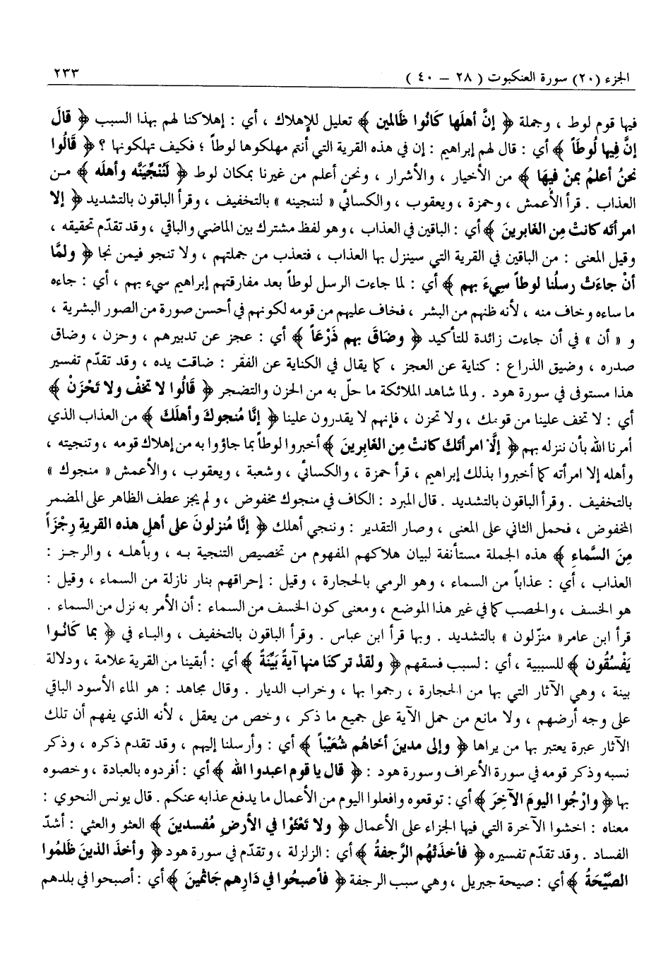 فِيهَا قَوْمُ لُوطٍ، وَجُمْلَةُ إِنَّ أَهْلَها كانُوا ظالِمِينَ تَعْلِيلٌ لِلْإِهْلَاكِ، أَيْ: إِهْلَاكُنَا لَهُمْ بِهَذَا السَّبَبِ قالَ إِنَّ فِيها لُوطاً أَيْ: قَالَ لَهُمْ إِبْرَاهِيمُ: إِنَّ فِي هَذِهِ الْقَرْيَةِ الَّتِي أَنْتُمْ مُهْلِكُوهَا لُوطًا فَكَيْفَ تُهْلِكُونَهَا؟ قالُوا نَحْنُ أَعْلَمُ بِمَنْ فِيها مِنَ الْأَخْيَارِ، وَالْأَشْرَارِ، وَنَحْنُ أَعْلَمُ مِنْ غَيْرِنَا بِمَكَانِ لُوطٍ لَنُنَجِّيَنَّهُ وَأَهْلَهُ مِنَ الْعَذَابِ. قَرَأَ الْأَعْمَشُ، وَحَمْزَةُ، وَيَعْقُوبُ، وَالْكِسَائِيُّ «لَنُنْجِيَنَّهُ» بِالتَّخْفِيفِ، وَقَرَأَ الْبَاقُونَ بِالتَّشْدِيدِ إِلَّا امْرَأَتَهُ كانَتْ مِنَ الْغابِرِينَ أَيِ: الْبَاقِينَ فِي الْعَذَابِ، وَهُوَ لَفْظٌ مُشْتَرَكٌ بَيْنَ الْمَاضِي وَالْبَاقِي، وَقَدْ تَقَدَّمَ تَحْقِيقُهُ، وَقِيلَ الْمَعْنَى: مِنَ الْبَاقِينَ فِي الْقَرْيَةِ الَّتِي سَيَنْزِلُ بِهَا الْعَذَابُ، فَتُعَذَّبُ مِنْ جُمْلَتِهِمْ، وَلَا تَنْجُو فِيمَنْ نَجَا وَلَمَّا أَنْ جاءَتْ رُسُلُنا لُوطاً سِيءَ بِهِمْ أَيْ: لَمَّا جَاءَتِ الرُّسُلُ لُوطًا بَعْدَ مُفَارَقَتِهِمْ إِبْرَاهِيمَ سِيءَ بِهِمْ، أَيْ: جَاءَهُ مَا سَاءَهُ وَخَافَ مِنْهُ، لِأَنَّهُ ظَنَّهُمْ مِنَ الْبَشَرِ، فَخَافَ عَلَيْهِمْ مِنْ قَوْمِهِ لِكَوْنِهِمْ فِي أَحْسَنِ صُورَةٍ مِنَ الصُّوَرِ الْبَشَرِيَّةِ، وَ «أَنْ» فِي أَنْ جَاءَتْ زَائِدَةٌ لِلتَّأْكِيدِ وَضاقَ بِهِمْ ذَرْعاً أَيْ: عَجَزَ عَنْ تَدْبِيرِهِمْ، وَحَزِنَ، وَضَاقَ صَدْرُهُ، وَضِيقُ الذِّرَاعِ: كِنَايَةٌ عَنِ الْعَجْزِ، كَمَا يُقَالُ فِي الْكِنَايَةِ عَنِ الْفَقْرِ: ضَاقَتْ يَدُهُ، وَقَدْ تَقَدَّمَ تَفْسِيرُ هَذَا مُسْتَوْفًى فِي سُورَةِ هود. ولما شاهد الْمَلَائِكَةُ مَا حَلَّ بِهِ مِنَ الْحُزْنِ وَالتَّضَجُّرِ قالُوا لَا تَخَفْ وَلا تَحْزَنْ أَيْ: لَا تَخَفْ عَلَيْنَا مِنْ قَوْمِكَ، وَلَا تَحْزَنْ، فَإِنَّهُمْ لَا يَقْدِرُونَ عَلَيْنَا إِنَّا مُنَجُّوكَ وَأَهْلَكَ مِنَ الْعَذَابِ الَّذِي أَمَرَنَا اللَّهُ بِأَنْ نُنْزِلَهُ بِهِمْ إِلَّا امْرَأَتَكَ كانَتْ مِنَ الْغابِرِينَ أَخْبَرُوا لُوطًا بِمَا جَاءُوا بِهِ مِنْ إِهْلَاكِ قَوْمِهِ، وَتَنْجِيَتِهِ، وَأَهْلِهِ إِلَّا امْرَأَتَهُ كَمَا أَخْبَرُوا بِذَلِكَ إِبْرَاهِيمَ، قَرَأَ حَمْزَةُ، وَالْكِسَائِيُّ، وَشُعْبَةُ، وَيَعْقُوبُ، وَالْأَعْمَشُ «مُنَجُّوكَ» بِالتَّخْفِيفِ. وَقَرَأَ الْبَاقُونَ بِالتَّشْدِيدِ. قَالَ الْمُبَرِّدُ: الْكَافُ فِي مُنَجُّوكَ مَخْفُوضٌ، وَلَمْ يَجُزْ عَطْفُ الظَّاهِرِ عَلَى الْمُضْمَرِ الْمَخْفُوضِ، فَحُمِلَ الثَّانِي عَلَى الْمَعْنَى، وَصَارَ التَّقْدِيرُ: وَنُنْجِي أَهْلَكَ إِنَّا مُنْزِلُونَ عَلى أَهْلِ هذِهِ الْقَرْيَةِ رِجْزاً مِنَ السَّماءِ هَذِهِ الْجُمْلَةُ مُسْتَأْنَفَةٌ لِبَيَانِ هَلَاكِهِمُ الْمَفْهُومُ مِنْ تَخْصِيصِ التَّنْجِيَةِ بِهِ، وَبِأَهْلِهِ، وَالرِّجْزُ:
