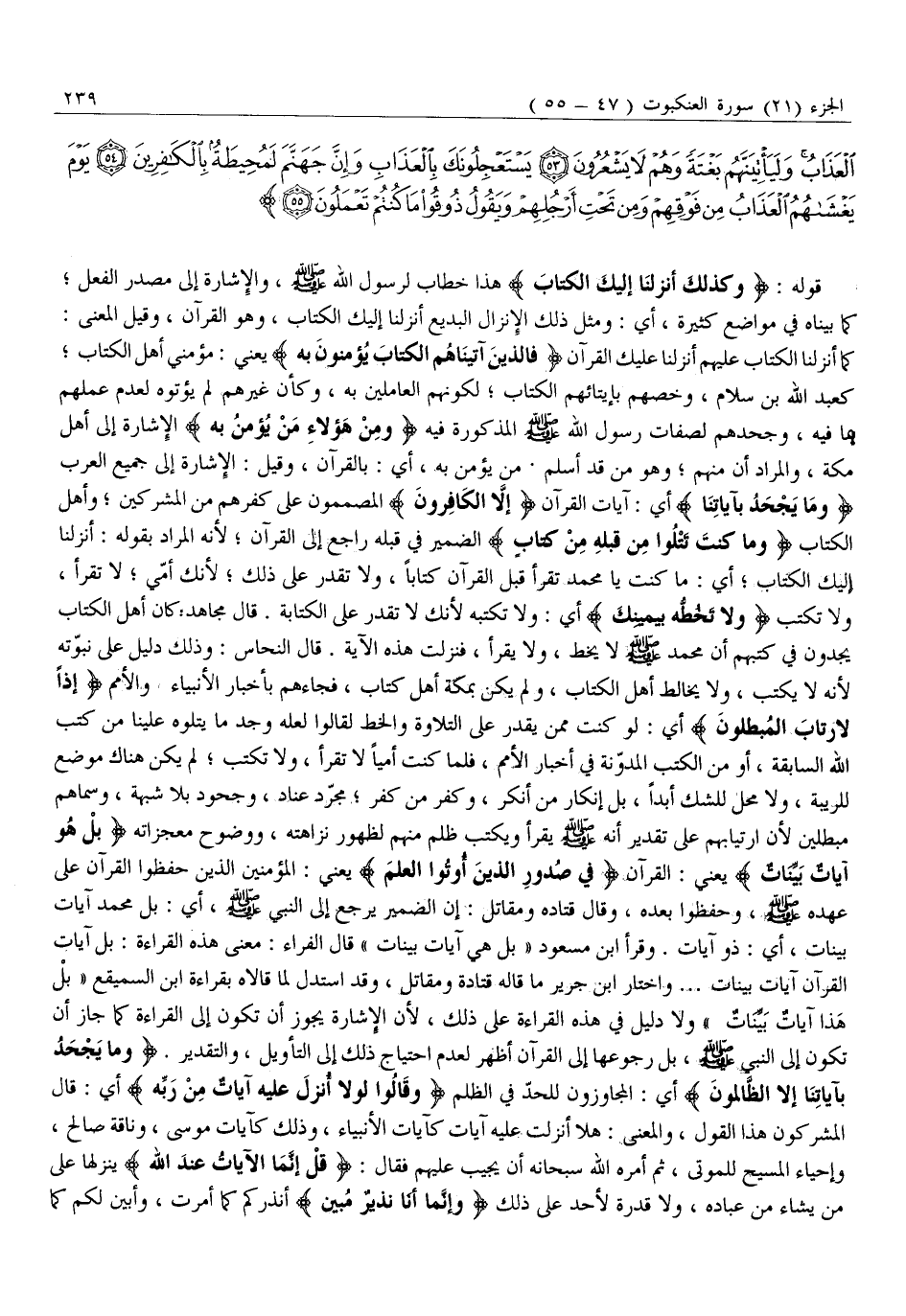 كَمَا أَنْزَلَنَا الْكِتَابَ عَلَيْهِمْ أَنْزَلْنَا عَلَيْكَ الْقُرْآنَ فَالَّذِينَ آتَيْناهُمُ الْكِتابَ يُؤْمِنُونَ بِهِ يَعْنِي: مُؤْمِنِي أَهْلِ الْكِتَابِ كَعَبْدِ اللَّهِ بْنِ سَلَامٍ، وَخَصَّهُمْ بِإِيتَائِهُمُ الْكِتَابَ لِكَوْنِهِمُ الْعَامِلِينَ بِهِ، وَكَأَنَّ غَيْرَهُمْ لَمْ يُؤْتَوْهُ لِعَدَمِ عَمَلِهِمْ بِمَا فِيهِ، وَجَحْدِهِمْ لِصِفَاتِ رَسُولِ اللَّهِ صَلَّى اللَّهُ عَلَيْهِ وَسَلَّمَ الْمَذْكُورَةِ فِيهِ وَمِنْ هؤُلاءِ مَنْ يُؤْمِنُ بِهِ الْإِشَارَةُ إِلَى أَهْلِ مَكَّةَ، وَالْمُرَادُ أَنَّ مِنْهُمْ وَهُوَ مَنْ قَدْ أَسْلَمَ. مَنْ يُؤْمِنُ بِهِ، أَيْ: بِالْقُرْآنِ، وَقِيلَ: الْإِشَارَةُ إِلَى جَمِيعِ الْعَرَبِ وَما يَجْحَدُ بِآياتِنا أَيْ: آيَاتِ الْقُرْآنِ إِلَّا الْكافِرُونَ الْمُصَمِّمُونَ عَلَى كُفْرِهِمْ مِنَ الْمُشْرِكِينَ وأهل الكتاب وَما كُنْتَ تَتْلُوا مِنْ قَبْلِهِ مِنْ كِتابٍ الضَّمِيرُ فِي قَبْلِهِ رَاجِعٌ إِلَى الْقُرْآنِ لِأَنَّهُ الْمُرَادُ بِقَوْلِهِ: أَنْزَلْنَا إِلَيْكَ الْكِتَابَ أَيْ: مَا كُنْتَ يَا مُحَمَّدُ تَقْرَأُ قَبْلَ الْقُرْآنِ كِتَابًا، وَلَا تَقْدِرُ عَلَى ذَلِكَ لِأَنَّكَ أُمِّيٌّ لَا تَقْرَأُ، وَلَا تَكْتُبُ وَلا تَخُطُّهُ بِيَمِينِكَ أَيْ: وَلَا تَكْتُبُهُ لِأَنَّكَ لَا تَقْدِرُ عَلَى الْكِتَابَةِ. قَالَ مُجَاهِدٌ: كَانَ أهل الكتاب يجدون في كتبهم أن محمّد صلّى الله عليه وَسَلَّمَ لَا يَخُطُّ، وَلَا يَقْرَأُ، فَنَزَلَتْ هَذِهِ الْآيَةُ. قَالَ النَّحَّاسُ: وَذَلِكَ دَلِيلٌ عَلَى نُبُوَّتِهِ لِأَنَّهُ لَا يَكْتُبُ، وَلَا يُخَالِطُ أَهْلَ الْكِتَابِ، وَلَمْ يَكُنْ بِمَكَّةَ أَهْلُ كِتَابٍ، فَجَاءَهُمْ بِأَخْبَارِ الْأَنْبِيَاءِ وَالْأُمَمِ إِذاً لَارْتابَ الْمُبْطِلُونَ أَيْ: لَوْ كُنْتَ مِمَّنْ يَقْدِرُ عَلَى التِّلَاوَةِ وَالْخَطِّ لَقَالُوا لَعَلَّهُ وَجَدَ مَا يَتْلُوهُ عَلَيْنَا مِنْ كُتُبِ اللَّهِ السَّابِقَةِ، أَوْ مِنَ الْكُتُبِ الْمُدَوَّنَةِ فِي أَخْبَارِ الْأُمَمِ، فَلَمَّا كُنْتَ أُمِّيًّا لَا تَقْرَأُ، وَلَا تَكْتُبُ لَمْ يَكُنْ هُنَاكَ مَوْضِعٌ لِلرِّيبَةِ، وَلَا مَحَلٌّ لِلشَّكِّ أَبَدًا، بَلْ إِنْكَارُ مَنْ أَنْكَرَ، وَكُفْرُ مَنْ كَفَرَ مُجَرَّدُ عِنَادٍ، وَجُحُودٍ بِلَا شُبْهَةٍ، وَسَمَّاهُمْ مُبْطِلِينَ لِأَنَّ ارْتِيَابَهُمْ عَلَى تقدير أنه صلّى الله عليه وَسَلَّمَ يَقْرَأُ وَيَكْتُبُ ظُلْمٌ مِنْهُمْ لِظُهُورِ نَزَاهَتِهِ، وَوُضُوحِ مُعْجِزَاتِهِ بَلْ هُوَ آياتٌ بَيِّناتٌ يَعْنِي: الْقُرْآنَ فِي صُدُورِ الَّذِينَ أُوتُوا الْعِلْمَ يَعْنِي: الْمُؤْمِنِينَ الَّذِينَ حَفِظُوا الْقُرْآنَ عَلَى عَهْدِهِ صَلَّى الله عليه وسلم، وحفظوا بَعْدَهُ، وَقَالَ قَتَادَةُ وَمُقَاتِلٌ: إِنَّ الضَّمِيرَ يَرْجِعُ إلى النبي صلّى الله عليه وَسَلَّمَ، أَيْ: بَلْ مُحَمَّدٌ آيَاتٌ بَيِّنَاتٌ، أَيْ: ذُو آيَاتٍ. وَقَرَأَ ابْنُ مَسْعُودٍ «بَلْ هِيَ آيَاتٌ بَيِّنَاتٌ» قَالَ الْفَرَّاءُ: مَعْنَى هَذِهِ الْقِرَاءَةِ: بَلْ آيَاتُ الْقُرْآنِ آيَاتٌ بَيِّنَاتٌ ... وَاخْتَارَ ابْنُ جَرِيرٍ مَا قَالَهُ قَتَادَةُ وَمُقَاتِلٌ، وَقَدِ اسْتَدَلَّ لما قالاه بقراءة ابن السميقع «بَلْ هَذَا آيَاتٌ بَيِّنَاتٌ» وَلَا دَلِيلَ فِي هَذِهِ الْقِرَاءَةِ عَلَى ذَلِكَ، لِأَنَّ الْإِشَارَةَ يَجُوزُ أن تكون إلى القراءة كَمَا جَازَ أَنْ تَكُونَ إِلَى النَّبِيِّ صَلَّى الله عليه وَسَلَّمَ، بَلْ رُجُوعُهَا إِلَى الْقُرْآنِ أَظْهَرُ لِعَدَمِ احْتِيَاجِ ذَلِكَ إِلَى التَّأْوِيلِ، وَالتَّقْدِيرِ. وَما يَجْحَدُ بِآياتِنا إِلَّا الظَّالِمُونَ أَيِ: الْمُجَاوِزُونَ لِلْحَدِّ فِي الظُّلْمِ وَقالُوا لَوْلا أُنْزِلَ عَلَيْهِ آياتٌ مِنْ رَبِّهِ أَي