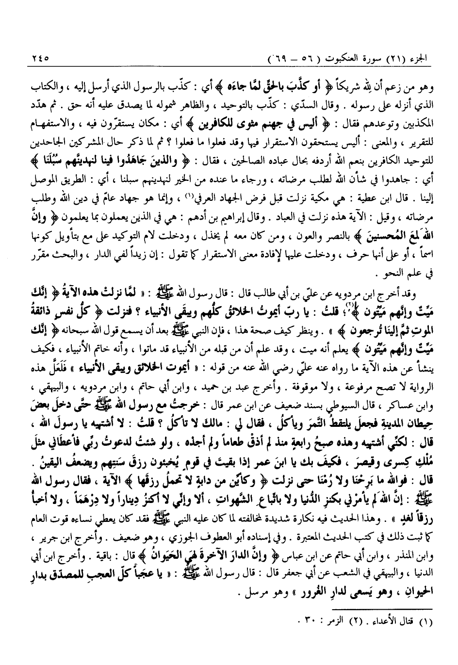 وَقَدْ أَخْرَجَ ابْنُ مَرْدَوَيْهِ عَنْ عَلِيِّ بْنِ أَبِي طَالِبٍ قَالَ: قَالَ رَسُولُ اللَّهِ صَلَّى اللَّهُ عَلَيْهِ وَسَلَّمَ: «لَمَّا نَزَلَتْ هَذِهِ الْآيَةُ إِنَّكَ مَيِّتٌ وَإِنَّهُمْ مَيِّتُونَ «2» قُلْتُ: يَا رَبِّ أَيَمُوتُ الْخَلَائِقُ كُلُّهُمْ وَيَبْقَى الْأَنْبِيَاءُ؟ فَنَزَلَتْ كُلُّ نَفْسٍ ذائِقَةُ الْمَوْتِ ثُمَّ إِلَيْنا تُرْجَعُونَ» . وَيُنْظَرُ كَيْفَ صِحَّةُ هَذَا، فَإِنَّ النَّبِيَّ صَلَّى الله عليه وَسَلَّمَ بَعْدَ أَنْ يَسْمَعَ قَوْلَ اللَّهِ سُبْحَانَهُ إِنَّكَ مَيِّتٌ وَإِنَّهُمْ مَيِّتُونَ يَعْلَمُ أَنَّهُ مَيِّتٌ، وَقَدْ عَلِمَ أَنَّ مَنْ قَبْلَهُ مِنَ الْأَنْبِيَاءِ قَدْ مَاتُوا، وَأَنَّهُ خَاتَمُ الْأَنْبِيَاءِ، فَكَيْفَ يَنْشَأُ عن هذه الآية ما رواه عَنْهُ عَلِيٌّ رَضِيَ اللَّهُ عَنْهُ مِنْ قَوْلِهِ: «أَيَمُوتُ الْخَلَائِقُ وَيَبْقَى الْأَنْبِيَاءُ» فَلَعَلَّ هَذِهِ الرِّوَايَةَ لَا تَصِحُّ مَرْفُوعَةً، وَلَا مَوْقُوفَةً. وَأَخْرَجَ عَبْدُ بْنُ حُمَيْدٍ، وَابْنُ أَبِي حَاتِمٍ، وَابْنُ مَرْدَوَيْهِ، وَالْبَيْهَقِيُّ، وَابْنُ عَسَاكِرَ، قَالَ السُّيُوطِيُّ بِسَنَدٍ ضَعِيفٍ عَنِ ابْنِ عُمَرَ قَالَ: خَرَجْتُ مَعَ رَسُولِ اللَّهِ صَلَّى اللَّهُ عَلَيْهِ وَسَلَّمَ حَتَّى دَخَلَ بَعْضَ حِيطَانِ الْمَدِينَةِ فَجَعَلَ يلتقط التّمر ويأكل، فقال لي: مالك لَا تَأْكُلُ؟ قُلْتُ: لَا أَشْتَهِيهِ يَا رَسُولَ اللَّهِ، قَالَ: لَكِنِّي أَشْتَهِيهِ وَهَذِهِ صُبْحُ رَابِعَةٍ مُنْذُ لَمْ أَذُقْ طَعَامًا وَلَمْ أَجِدْهُ، وَلَوْ شِئْتُ لَدَعَوْتُ رَبِّي فَأَعْطَانِي مِثْلَ مُلْكِ كِسْرَى وَقَيْصَرَ، فَكَيْفَ بِكَ يَا ابْنَ عُمَرَ إِذَا بَقِيتَ فِي قَوْمٍ يُخَبِّئُونَ رِزْقَ سَنَتِهِمْ وَيَضْعُفُ اليقين.