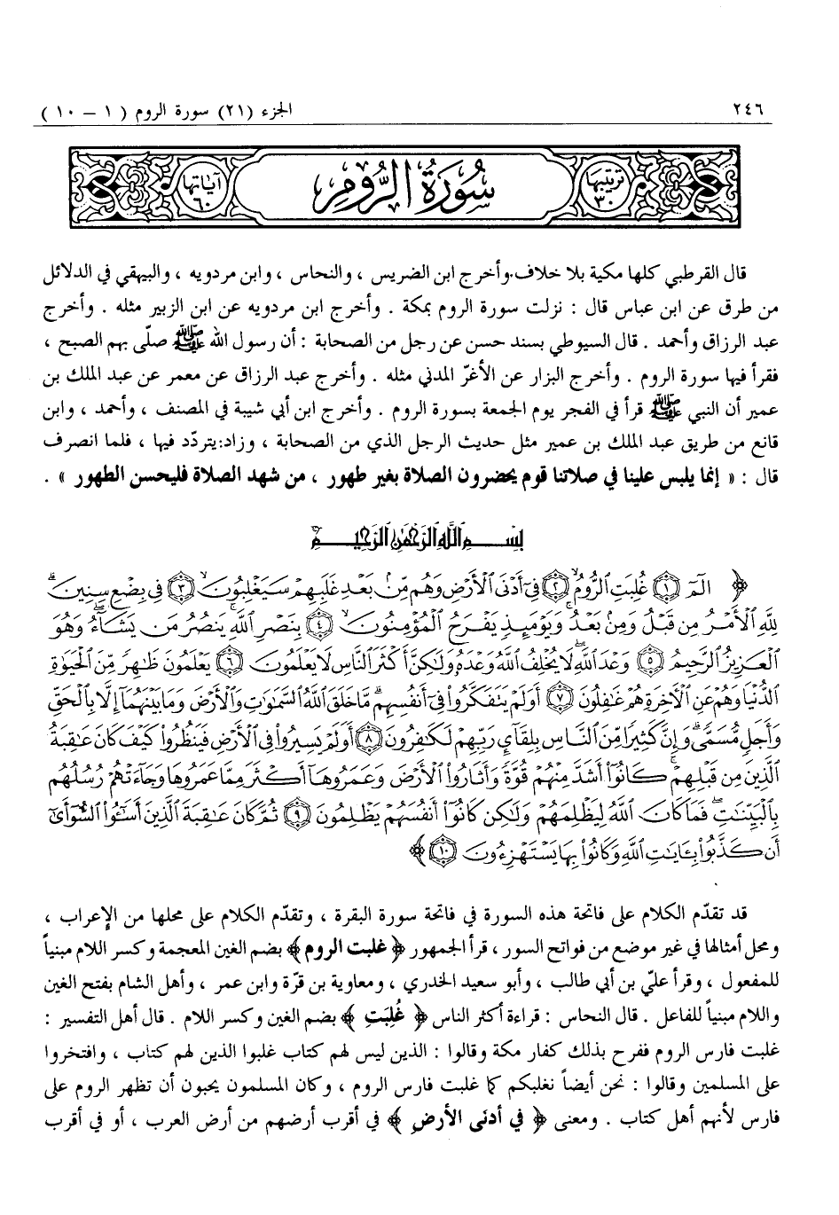 قال القرطبي كلها مَكِّيَّةٌ بِلَا خِلَافٍ وَأَخْرَجَ ابْنُ الضُّرَيْسِ، وَالنَّحَّاسُ، وَابْنُ مَرْدَوَيْهِ، وَالْبَيْهَقِيُّ فِي الدَّلَائِلِ مِنْ طُرُقٍ عَنِ ابْنِ عَبَّاسٍ قَالَ: نَزَلَتْ سُورَةُ الرُّومِ بِمَكَّةَ. وَأَخْرَجَ ابْنُ مَرْدَوَيْهِ عَنِ ابْنِ الزُّبَيْرِ مِثْلَهُ. وَأَخْرَجَ عَبْدُ الرَّزَّاقِ وَأَحْمَدُ. قَالَ السُّيُوطِيُّ بِسَنَدٍ حَسَنٍ عَنْ رَجُلٍ مِنَ الصَّحَابَةِ: أَنَّ رَسُولَ اللَّهِ صَلَّى اللَّهُ عَلَيْهِ وَسَلَّمَ صَلَّى بِهِمُ الصُّبْحَ، فَقَرَأَ فِيهَا سُورَةَ الرُّومِ. وَأَخْرَجَ الْبَزَّارُ عَنِ الْأَغَرِّ الْمَدَنِيِّ مِثْلَهُ. وأخرج عبد الرزاق عن معمر عن عَبْدِ الْمَلِكِ بْنِ عُمَيْرٍ أَنَّ النَّبِيَّ صَلَّى اللَّهُ عَلَيْهِ وَسَلَّمَ قَرَأَ فِي الْفَجْرِ يَوْمَ الْجُمُعَةِ بِسُورَةِ الرُّومِ. وَأَخْرَجَ ابْنُ أَبِي شَيْبَةَ فِي الْمُصَنَّفِ، وَأَحْمَدُ، وَابْنُ قَانِعٌ مِنْ طَرِيقِ عَبْدِ الْمَلِكِ بْنِ عُمَيْرٍ مِثْلَ حَدِيثِ الرَّجُلِ الَّذِي مِنَ الصَّحَابَةِ، وَزَادَ: يَتَرَدَّدُ فِيهَا، فَلَمَّا انْصَرَفَ قَالَ: «إِنَّمَا يُلْبِسُ عَلَيْنَا فِي صَلَاتِنَا قَوْمٌ يَحْضُرُونَ الصَّلَاةَ بِغَيْرِ طَهُورٍ، مَنْ شَهِدَ الصَّلَاةَ فَلْيُحْسِنِ الطهور» .