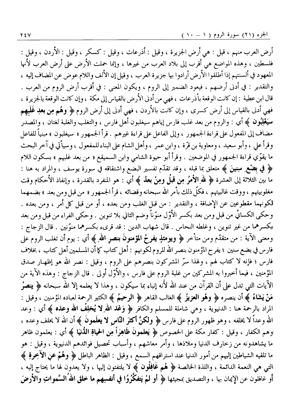 قَالَ ابْنُ عَطِيَّةَ: إِنْ كَانَتِ الْوَقْعَةُ بِأَذْرُعَاتٍ، فَهِيَ مِنْ أَدْنَى الْأَرْضِ بِالْقِيَاسِ إِلَى مَكَّةَ، وَإِنْ كَانَتِ الْوَقْعَةُ بِالْجَزِيرَةِ، فَهِيَ أَدْنَى بِالْقِيَاسِ إِلَى أَرْضِ كِسْرَى، وَإِنْ كَانَتْ بِالْأُرْدُنِّ، فَهِيَ أَدْنَى إِلَى أَرْضِ الرُّومِ وَهُمْ مِنْ بَعْدِ غَلَبِهِمْ سَيَغْلِبُونَ أَيْ: وَالرُّومُ مِنْ بَعْدِ غَلَبِ فَارِسَ إِيَّاهُمْ سَيَغْلِبُونَ أَهْلَ فَارِسَ، والتغلب وَالْغَلَبَةُ لُغَتَانِ، وَالْمَصْدَرُ مُضَافٌ إِلَى الْمَفْعُولِ عَلَى قِرَاءَةِ الْجُمْهُورِ، وَإِلَى الْفَاعِلِ عَلَى قِرَاءَةِ غَيْرِهِمْ. قَرَأَ الْجُمْهُورُ «سَيَغْلِبُونَ» مَبْنِيًّا لِلْفَاعِلِ وَقَرَأَ عَلِيٌّ، وَأَبُو سَعِيدٍ، وَمُعَاوِيَةُ بْنُ قُرَّةَ، وَابْنُ عُمَرَ، وأهل الشام على البناء للمفعول، وسيأتي في آخر البحث ما يقوّي قراءة الجمهور في الموضعين. وقرأ أبو حيوة الشامي وابن السميقع «مِنْ بَعْدِ غَلْبِهِمْ» بِسُكُونِ اللَّامِ فِي بِضْعِ سِنِينَ
