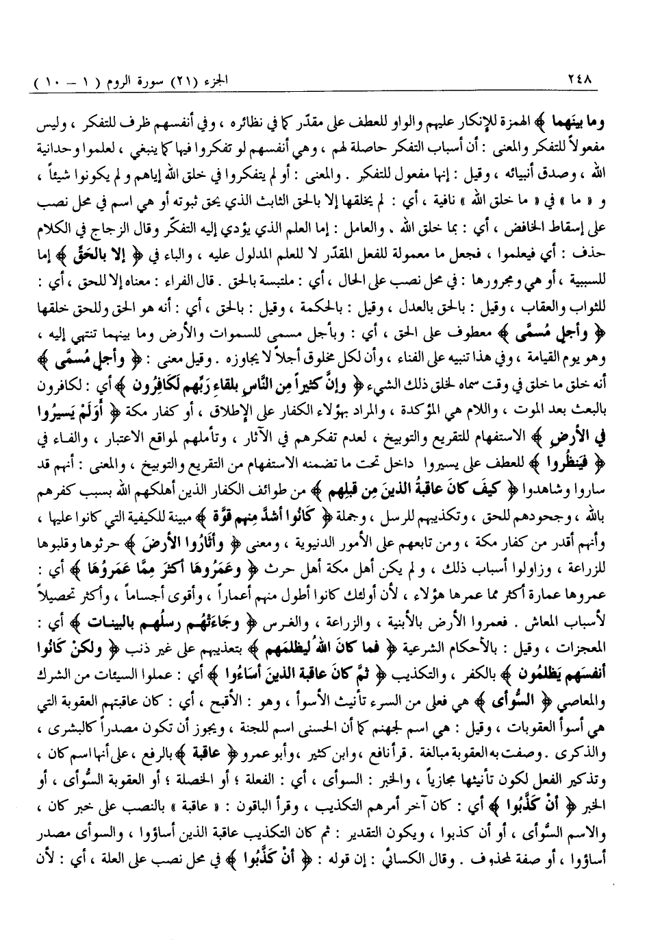 لِلثَّوَابِ وَالْعِقَابِ، وَقِيلَ: بِالْحَقِّ بِالْعَدْلِ، وَقِيلَ: بِالْحِكْمَةِ، وَقِيلَ: بِالْحَقِّ، أَيْ: أَنَّهُ هُوَ الْحَقُّ وَلِلْحَقِّ خَلَقَهَا وَأَجَلٍ مُسَمًّى مَعْطُوفٌ على الحق، أي: وبأجل مسمى للسموات وَالْأَرْضِ وَمَا بَيْنَهُمَا تَنْتَهِي إِلَيْهِ، وَهُوَ يَوْمُ الْقِيَامَةِ، وَفِي هَذَا تَنْبِيهٌ عَلَى الْفَنَاءِ، وَأَنَّ لِكُلِّ مَخْلُوقٍ أَجَلًا لَا يُجَاوِزُهُ. وَقِيلَ مَعْنَى: وَأَجَلٍ مُسَمًّى أَنَّهُ خَلَقَ مَا خَلَقَ فِي وَقْتٍ سَمَّاهُ لِخَلْقِ ذَلِكَ الشَّيْءِ وَإِنَّ كَثِيراً مِنَ النَّاسِ بِلِقاءِ رَبِّهِمْ لَكافِرُونَ أَيْ: لَكَافِرُونَ بِالْبَعْثِ بَعْدَ الْمَوْتِ، وَاللَّامُ هِيَ الْمُؤَكِّدَةُ، وَالْمُرَادُ بِهَؤُلَاءِ الْكُفَّارُ عَلَى الْإِطْلَاقِ، أَوْ كُفَّارُ مَكَّةَ أَوَلَمْ يَسِيرُوا فِي الْأَرْضِ الِاسْتِفْهَامُ لِلتَّقْرِيعِ وَالتَّوْبِيخِ، لِعَدَمِ تَفَكُّرِهِمْ فِي الْآثَارِ، وَتَأَمُّلِهِمْ لِمَوَاقِعِ الِاعْتِبَارِ، وَالْفَاءُ فِي فَيَنْظُرُوا لِلْعَطْفِ عَلَى يَسِيرُوا دَاخِلٌ تَحْتَ مَا تَضَمَّنَهُ الِاسْتِفْهَامُ مِنَ التَّقْرِيعِ وَالتَّوْبِيخِ، وَالْمَعْنَى: أَنَّهُمْ قَدْ سَارُوا وَشَاهَدُوا كَيْفَ كانَ عاقِبَةُ الَّذِينَ مِنْ قَبْلِهِمْ مِنْ طَوَائِفِ الْكُفَّارِ الَّذِينَ أَهْلَكَهُمُ اللَّهُ بِسَبَبِ كُفْرِهِمْ بِاللَّهِ، وَجُحُودِهِمْ لِلْحَقِّ، وَتَكْذِيبِهِمْ لِلرُّسُلِ، وَجُمْلَةُ كانُوا أَشَدَّ مِنْهُمْ قُوَّةً مُبَيِّنَةٌ لِلْكَيْفِيَّةِ الَّتِي كَانُوا عَلَيْهَا، وَأَنَّهُمْ أَقْدَرُ مِنْ كُفَّارِ مَكَّةَ، وَمَنْ تَابَعَهُمْ عَلَى الْأُمُورِ الدُّنْيَوِيَّةِ، وَمَعْنَى وَأَثارُوا الْأَرْضَ حَرَثُوهَا وَقَلَّبُوهَا لِلزِّرَاعَةِ، وَزَاوَلُوا أَسْبَابَ ذَلِكَ، وَلَمْ يَكُنْ أَهْلُ مَكَّةَ أَهْلَ حَرْثٍ وَعَمَرُوها أَكْثَرَ مِمَّا عَمَرُوها أَيْ: