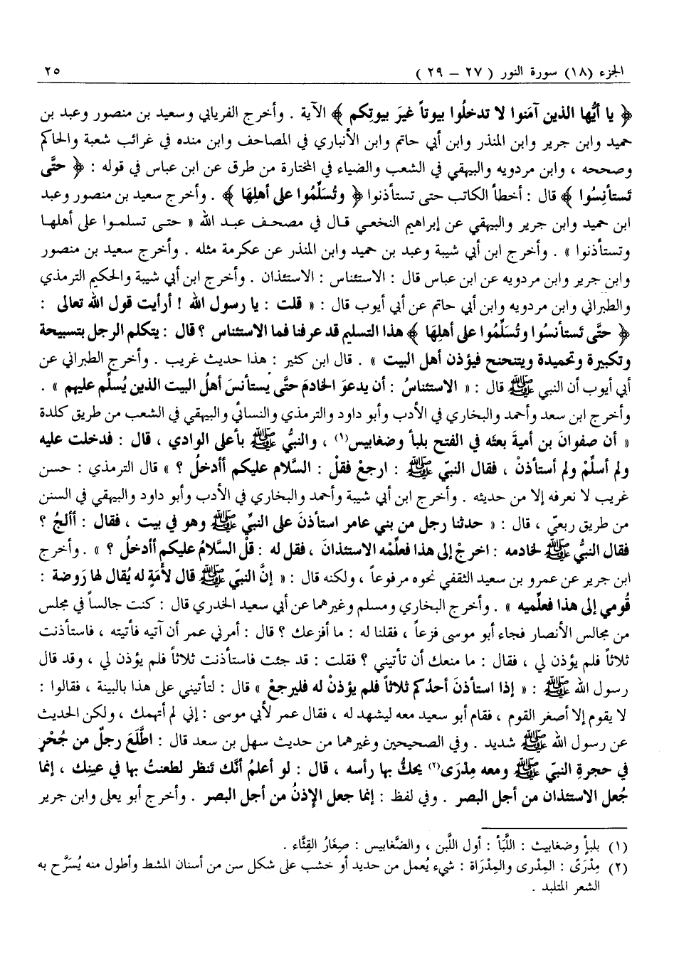 يَا أَيُّهَا الَّذِينَ آمَنُوا لَا تَدْخُلُوا بُيُوتاً غَيْرَ بُيُوتِكُمْ الْآيَةَ. وَأَخْرَجَ الْفِرْيَابِيُّ وَسَعِيدُ بْنُ مَنْصُورٍ وَعَبْدُ بْنُ حُمَيْدٍ وَابْنُ جَرِيرٍ وَابْنُ الْمُنْذِرِ وَابْنُ أَبِي حَاتِمٍ وَابْنُ الْأَنْبَارِيِّ فِي الْمَصَاحِفِ وَابْنُ مَنْدَهْ فِي غَرَائِبِ شُعْبَةَ وَالْحَاكِمُ وَصَحَّحَهُ، وَابْنُ مَرْدَوَيْهِ وَالْبَيْهَقِيُّ فِي الشُّعَبِ وَالضِّيَاءُ فِي الْمُخْتَارَةِ مِنْ طُرُقٍ عَنِ ابْنِ عَبَّاسٍ فِي قَوْلِهِ: حَتَّى تَسْتَأْنِسُوا قَالَ: أَخْطَأَ الْكَاتِبُ حَتَّى تَسْتَأْذِنُوا وَتُسَلِّمُوا عَلى أَهْلِها. وَأَخْرَجَ سَعِيدُ بن منصور وعبد ابن حُمَيْدٍ وَابْنُ جَرِيرٍ وَالْبَيْهَقِيُّ عَنْ إِبْرَاهِيمَ النَّخَعِيُّ قَالَ فِي مُصْحَفِ عَبْدِ اللَّهِ «حَتَّى تُسَلِّمُوا عَلَى أَهْلِهَا وَتَسْتَأْذِنُوا» . وَأَخْرَجَ ابْنُ أَبِي شَيْبَةَ وَعَبْدُ بْنُ حُمَيْدٍ وَابْنُ الْمُنْذِرِ عَنْ عِكْرِمَةَ مِثْلَهُ. وَأَخْرَجَ سَعِيدُ بْنُ مَنْصُورٍ وَابْنُ جَرِيرٍ وَابْنُ مَرْدَوَيْهِ عَنِ ابْنِ عَبَّاسٍ قَالَ: الِاسْتِئْنَاسُ: الاستئذان. وأخرج ابن أبي شيبة والحكيم الترمذي وَالطَّبَرَانِيُّ وَابْنُ مَرْدَوَيْهِ وَابْنُ أَبِي حَاتِمٍ عَنْ أَبِي أَيُّوبَ قَالَ: «قُلْتُ: يَا رَسُولَ اللَّهِ! أَرَأَيْتَ قَوْلَ اللَّهِ تَعَالَى: