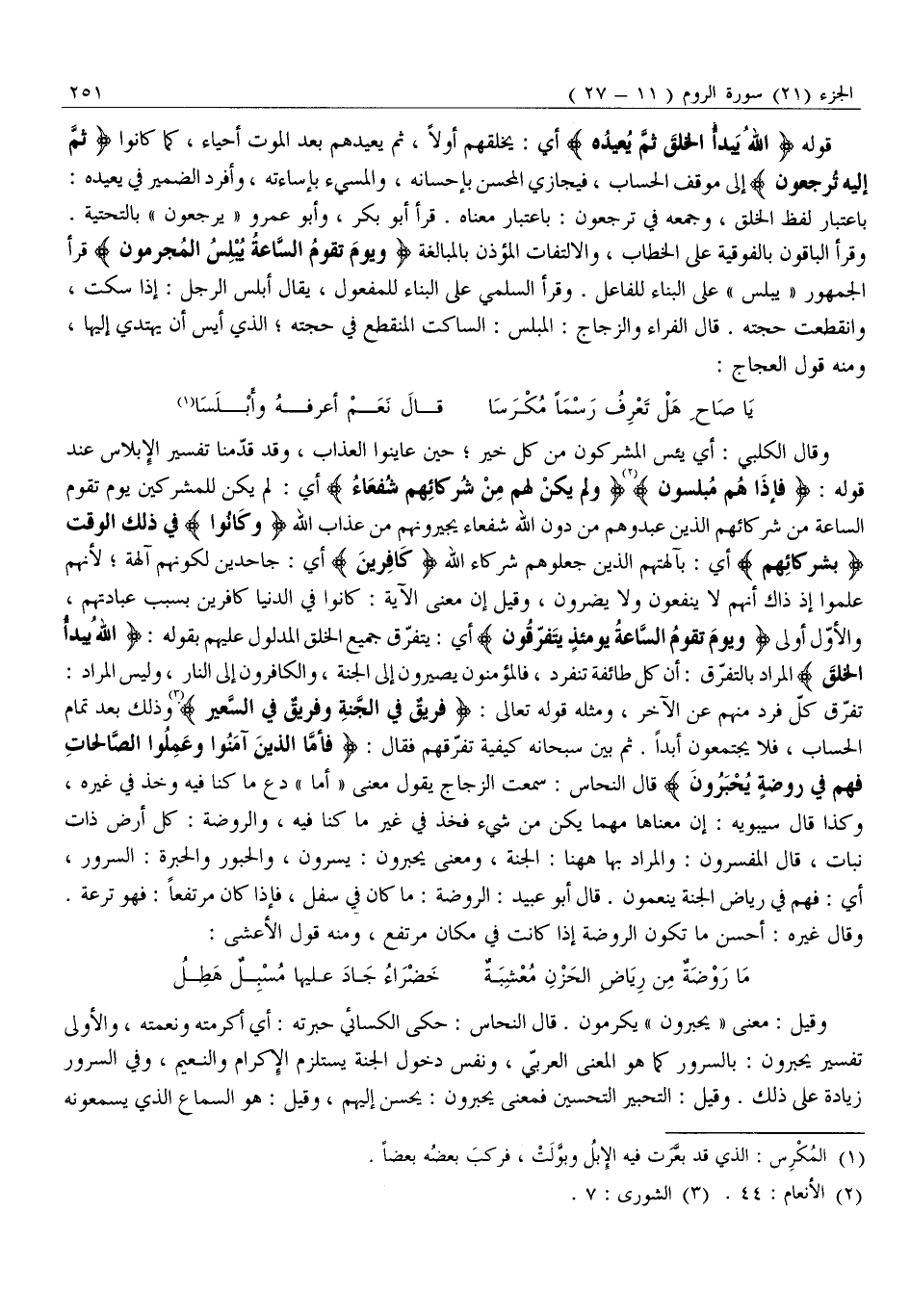 قوله اللَّهُ يَبْدَؤُا الْخَلْقَ ثُمَّ يُعِيدُهُ أَيْ: يَخْلُقُهُمْ أَوَّلًا، ثُمَّ يُعِيدُهُمْ بَعْدَ الْمَوْتِ أَحْيَاءً، كَمَا كَانُوا ثُمَّ إِلَيْهِ تُرْجَعُونَ إِلَى مَوْقِفِ الْحِسَابِ، فَيُجَازِي الْمُحْسِنَ بِإِحْسَانِهِ، وَالْمُسِيءَ بِإِسَاءَتِهِ، وَأَفْرَدَ الضَّمِيرَ فِي يُعِيدُهُ: