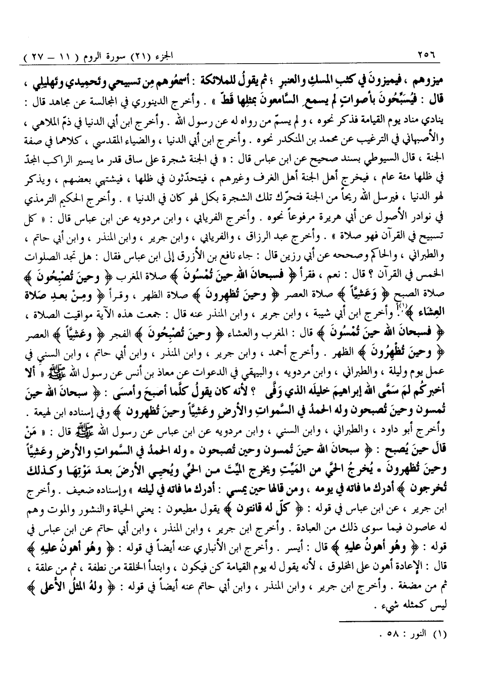 وَأَخْرَجَ أَبُو دَاوُدَ، وَالطَّبَرَانِيُّ، وَابْنُ السُّنِّيِّ، وَابْنُ مَرْدَوَيْهِ عَنِ ابْنِ عَبَّاسٍ عَنْ رَسُولِ اللَّهِ صَلَّى اللَّهُ عَلَيْهِ وَسَلَّمَ قَالَ: «مَنْ قَالَ حِينَ يُصْبِحُ: فَسُبْحانَ اللَّهِ حِينَ تُمْسُونَ وَحِينَ تُصْبِحُونَ وَلَهُ الْحَمْدُ فِي السَّماواتِ وَالْأَرْضِ وَعَشِيًّا وَحِينَ تُظْهِرُونَ يُخْرِجُ الْحَيَّ مِنَ الْمَيِّتِ وَيُخْرِجُ الْمَيِّتَ مِنَ الْحَيِّ وَيُحْيِ الْأَرْضَ بَعْدَ مَوْتِها وَكَذلِكَ تُخْرَجُونَ أَدْرَكَ مَا فَاتَهُ فِي يَوْمِهِ، وَمَنْ قَالَهَا حِينَ يُمْسِي: أَدْرَكَ مَا فَاتَهُ فِي لَيْلَتِهِ» وَإِسْنَادُهُ ضَعِيفٌ. وَأَخْرَجَ ابْنُ جَرِيرٍ، عَنِ ابْنِ عَبَّاسٍ فِي قَوْلِهِ: كُلٌّ لَهُ قانِتُونَ يَقُولُ مُطِيعُونَ: يَعْنِي الْحَيَاةَ وَالنُّشُورَ وَالْمَوْتَ وَهُمْ لَهُ عَاصُونَ فِيمَا سِوَى ذَلِكَ مِنَ الْعِبَادَةِ. وَأَخْرَجَ ابْنُ جَرِيرٍ، وَابْنُ الْمُنْذِرِ، وَابْنُ أَبِي حَاتِمٍ عَنِ ابْنِ عَبَّاسٍ فِي قَوْلِهِ: وَهُوَ أَهْوَنُ عَلَيْهِ قَالَ: أَيْسَرُ. وَأَخْرَجَ ابْنُ الْأَنْبَارِيِّ عَنْهُ أَيْضًا فِي قَوْلِهِ: وَهُوَ أَهْوَنُ عَلَيْهِ قَالَ: الْإِعَادَةُ أَهْوَنُ عَلَى الْمَخْلُوقِ، لِأَنَّهُ يَقُولُ لَهُ يَوْمَ الْقِيَامَةِ كُنْ فَيَكُونُ، وَابْتَدَأَ الْخِلْقَةَ مِنْ نُطْفَةٍ، ثُمَّ مِنْ عَلَقَةٍ، ثُمَّ مِنْ مُضْغَةٍ. وَأَخْرَجَ ابْنُ جَرِيرٍ، وَابْنُ الْمُنْذِرِ، وَابْنُ أَبِي حَاتِمٍ عَنْهُ أيضا في قوله: وَلَهُ الْمَثَلُ الْأَعْلى ليس كمثله شيء.