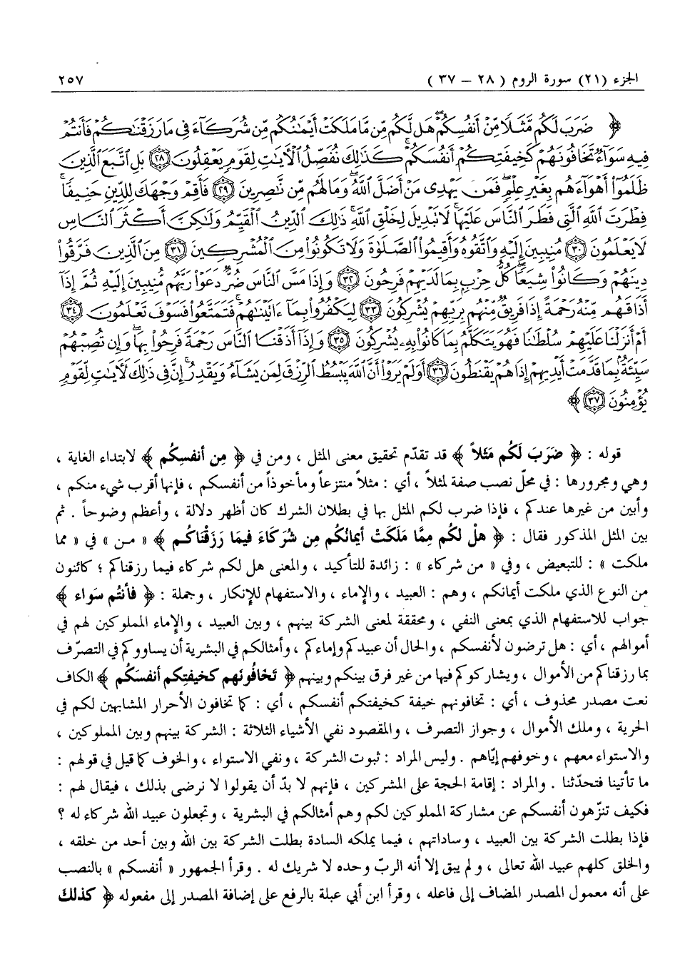 ضَرَبَ لَكُمْ مَثَلاً مِنْ أَنْفُسِكُمْ هَلْ لَكُمْ مِنْ مَا مَلَكَتْ أَيْمانُكُمْ مِنْ شُرَكاءَ فِي مَا رَزَقْناكُمْ فَأَنْتُمْ فِيهِ سَواءٌ تَخافُونَهُمْ كَخِيفَتِكُمْ أَنْفُسَكُمْ كَذلِكَ نُفَصِّلُ الْآياتِ لِقَوْمٍ يَعْقِلُونَ (28) بَلِ اتَّبَعَ الَّذِينَ ظَلَمُوا أَهْواءَهُمْ بِغَيْرِ عِلْمٍ فَمَنْ يَهْدِي مَنْ أَضَلَّ اللَّهُ وَما لَهُمْ مِنْ ناصِرِينَ (29) فَأَقِمْ وَجْهَكَ لِلدِّينِ حَنِيفاً فِطْرَتَ اللَّهِ الَّتِي فَطَرَ النَّاسَ عَلَيْها لَا تَبْدِيلَ لِخَلْقِ اللَّهِ ذلِكَ الدِّينُ الْقَيِّمُ وَلكِنَّ أَكْثَرَ النَّاسِ لَا يَعْلَمُونَ (30) مُنِيبِينَ إِلَيْهِ وَاتَّقُوهُ وَأَقِيمُوا الصَّلاةَ وَلا تَكُونُوا مِنَ الْمُشْرِكِينَ (31) مِنَ الَّذِينَ فَرَّقُوا دِينَهُمْ وَكانُوا شِيَعاً كُلُّ حِزْبٍ بِما لَدَيْهِمْ فَرِحُونَ (32)