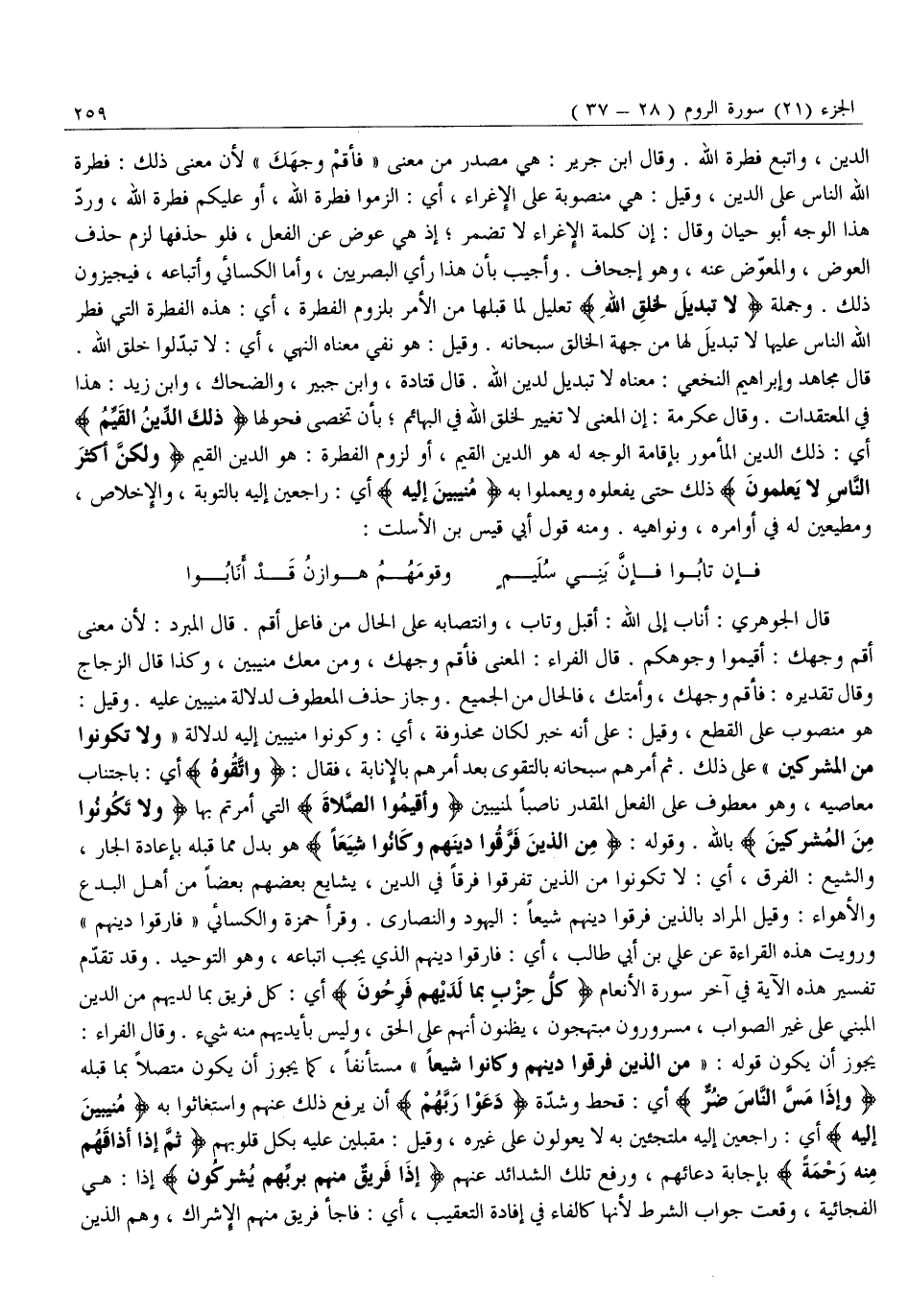 الدِّينَ، وَاتَّبِعْ فِطْرَةَ اللَّهِ. وَقَالَ ابْنُ جَرِيرٍ: هِيَ مَصْدَرٌ مِنْ مَعْنَى «فَأَقِمْ وَجْهَكَ» لِأَنَّ مَعْنَى ذَلِكَ: فِطْرَةُ اللَّهِ النَّاسَ عَلَى الدِّينِ، وَقِيلَ: هِيَ مَنْصُوبَةٌ عَلَى الْإِغْرَاءِ، أَيِ: الْزَمُوا فِطْرَةَ اللَّهِ، أَوْ عَلَيْكُمْ فِطْرَةَ اللَّهِ، وَرَدَّ هَذَا الْوَجْهَ أَبُو حَيَّانَ وَقَالَ: إِنَّ كَلِمَةَ الْإِغْرَاءِ لَا تُضْمَرُ إِذْ هِيَ عِوَضٌ عَنِ الْفِعْلِ، فَلَوْ حَذَفَهَا لَزِمَ حَذْفُ الْعِوَضِ، وَالْمُعَوَّضُ عَنْهُ، وَهُوَ إِجْحَافٌ. وَأُجِيبُ بِأَنَّ هَذَا رَأْيُ الْبَصْرِيِّينَ، وَأَمَّا الْكِسَائِيُّ وَأَتْبَاعُهُ، فَيُجِيزُونَ ذَلِكَ. وَجُمْلَةُ لَا تَبْدِيلَ لِخَلْقِ اللَّهِ تَعْلِيلٌ لِمَا قَبْلَهَا مِنَ الْأَمْرِ بِلُزُومِ الْفِطْرَةِ، أَيْ: هَذِهِ الْفِطْرَةُ الَّتِي فَطَرَ اللَّهُ النَّاسَ عَلَيْهَا لَا تَبْدِيلَ لَهَا مِنْ جِهَةِ الْخَالِقِ سُبْحَانَهُ. وَقِيلَ: هُوَ نَفْيٌ مَعْنَاهُ النَّهْيُ، أَيْ: لَا تُبَدِّلُوا خَلْقَ اللَّهِ.
