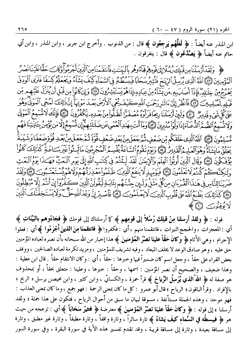 وَلَقَدْ أَرْسَلْنا مِنْ قَبْلِكَ رُسُلاً إِلى قَوْمِهِمْ فَجاؤُهُمْ بِالْبَيِّناتِ فَانْتَقَمْنا مِنَ الَّذِينَ أَجْرَمُوا وَكانَ حَقًّا عَلَيْنا نَصْرُ الْمُؤْمِنِينَ (47) اللَّهُ الَّذِي يُرْسِلُ الرِّياحَ فَتُثِيرُ سَحاباً فَيَبْسُطُهُ فِي السَّماءِ كَيْفَ يَشاءُ وَيَجْعَلُهُ كِسَفاً فَتَرَى الْوَدْقَ يَخْرُجُ مِنْ خِلالِهِ فَإِذا أَصابَ بِهِ مَنْ يَشاءُ مِنْ عِبادِهِ إِذا هُمْ يَسْتَبْشِرُونَ (48) وَإِنْ كانُوا مِنْ قَبْلِ أَنْ يُنَزَّلَ عَلَيْهِمْ مِنْ قَبْلِهِ لَمُبْلِسِينَ (49) فَانْظُرْ إِلى آثارِ رَحْمَتِ اللَّهِ كَيْفَ يُحْيِ الْأَرْضَ بَعْدَ مَوْتِها إِنَّ ذلِكَ لَمُحْيِ الْمَوْتى وَهُوَ عَلى كُلِّ شَيْءٍ قَدِيرٌ (50) وَلَئِنْ أَرْسَلْنا رِيحاً فَرَأَوْهُ مُصْفَرًّا لَظَلُّوا مِنْ بَعْدِهِ يَكْفُرُونَ (51)