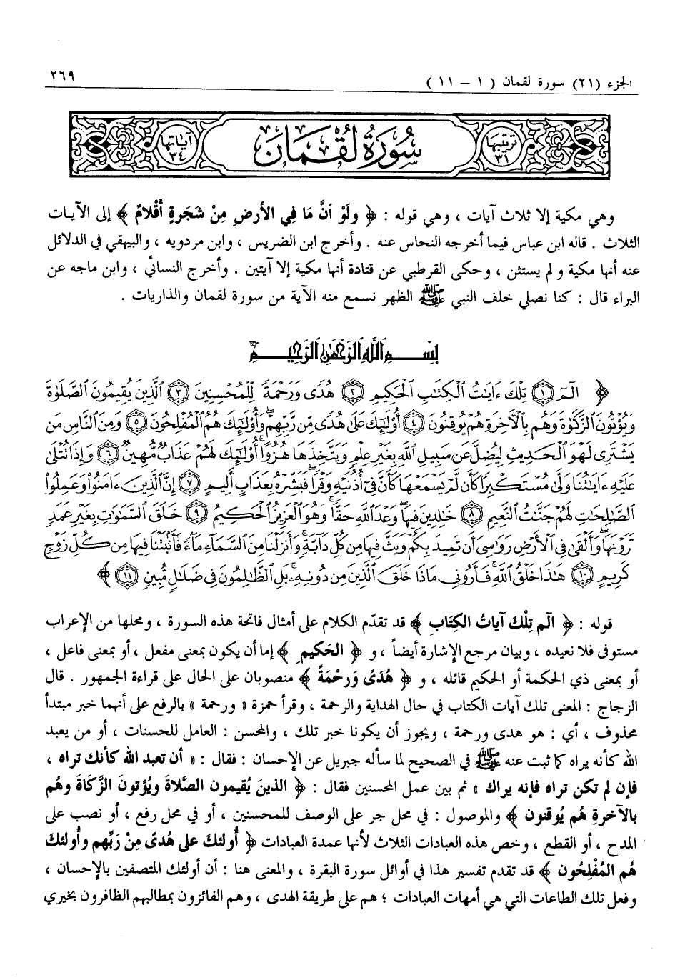 قَوْلُهُ: الم تِلْكَ آياتُ الْكِتابِ قَدْ تَقَدَّمَ الْكَلَامُ عَلَى أَمْثَالِ فَاتِحَةِ هَذِهِ السُّورَةِ، وَمَحَلِّهَا مِنَ الْإِعْرَابِ مُسْتَوْفًى فَلَا نُعِيدُهُ، وَبَيَانُ مرجع الإشارة أيضا، والْحَكِيمِ إِمَّا أَنْ يَكُونَ بِمَعْنَى مُفْعِلٍ، أَوْ بِمَعْنَى فَاعِلٍ، أَوْ بِمَعْنَى ذِي الْحِكْمَةِ أَوِ الْحَكِيمِ قائله، وهُدىً وَرَحْمَةً مَنْصُوبَانِ عَلَى الْحَالِ عَلَى قِرَاءَةِ الْجُمْهُورِ. قَالَ الزَّجَّاجُ: الْمَعْنَى تِلْكَ آيَاتُ الْكِتَابِ فِي حَالِ الْهِدَايَةِ وَالرَّحْمَةِ، وَقَرَأَ حَمْزَةُ «وَرَحْمَةٌ» بِالرَّفْعِ عَلَى أَنَّهُمَا خَبَرُ مُبْتَدَأٍ مَحْذُوفٍ، أَيْ: هُوَ هُدًى وَرَحْمَةٌ، وَيَجُوزُ أَنْ يَكُونَا خَبَرَ تِلْكَ، وَالْمُحْسِنُ: الْعَامِلُ لِلْحَسَنَاتِ، أَوْ مَنْ يَعْبُدُ اللَّهَ كَأَنَّهُ يَرَاهُ كَمَا ثَبَتَ عَنْهُ صَلَّى اللَّهُ عَلَيْهِ وَسَلَّمَ فِي الصَّحِيحِ لَمَّا سَأَلَهُ جِبْرِيلُ عَنِ الْإِحْسَانِ: فَقَالَ: «أَنْ تَعْبُدَ اللَّهَ كَأَنَّكَ تَرَاهُ، فَإِنْ لَمْ تَكُنْ تَرَاهُ فَإِنَّهُ يَرَاكَ» ثُمَّ بَيَّنَ عَمَلَ الْمُحْسِنِينَ فَقَالَ: الَّذِينَ يُقِيمُونَ الصَّلاةَ وَيُؤْتُونَ الزَّكاةَ وَهُمْ بِالْآخِرَةِ هُمْ يُوقِنُونَ وَالْمَوْصُولُ: فِي مَحَلِّ جَرٍّ عَلَى الْوَصْفِ لِلْمُحْسِنِينَ، أَوْ فِي مَحَلِّ رَفْعٍ، أَوْ نَصْبٍ عَلَى الْمَدْحِ، أَوِ الْقَطْعِ، وَخَصَّ هَذِهِ الْعِبَادَاتِ الثَّلَاثَ لِأَنَّهَا عُمْدَةُ الْعِبَادَاتِ أُولئِكَ عَلى هُدىً مِنْ رَبِّهِمْ وَأُولئِكَ هُمُ الْمُفْلِحُونَ قد تَقَدَّمَ تَفْسِيرُ هَذَا فِي أَوَائِلِ سُورَةِ الْبَقَرَةِ، وَالْمَعْنَى هُنَا: أَنَّ أُولَئِكَ الْمُتَّصِفِينَ بِالْإِحْسَانِ، وَفِعْلِ تِلْكَ الطَّاعَاتِ الَّتِي هِيَ أُمَّهَاتُ الْعِبَادَاتِ هُمْ عَلَى طَرِيقَةِ الْهُدَى، وَهُمُ الْفَائِزُونَ بِمَطَالِبِهِمُ الظَّافِرُونَ بخيري