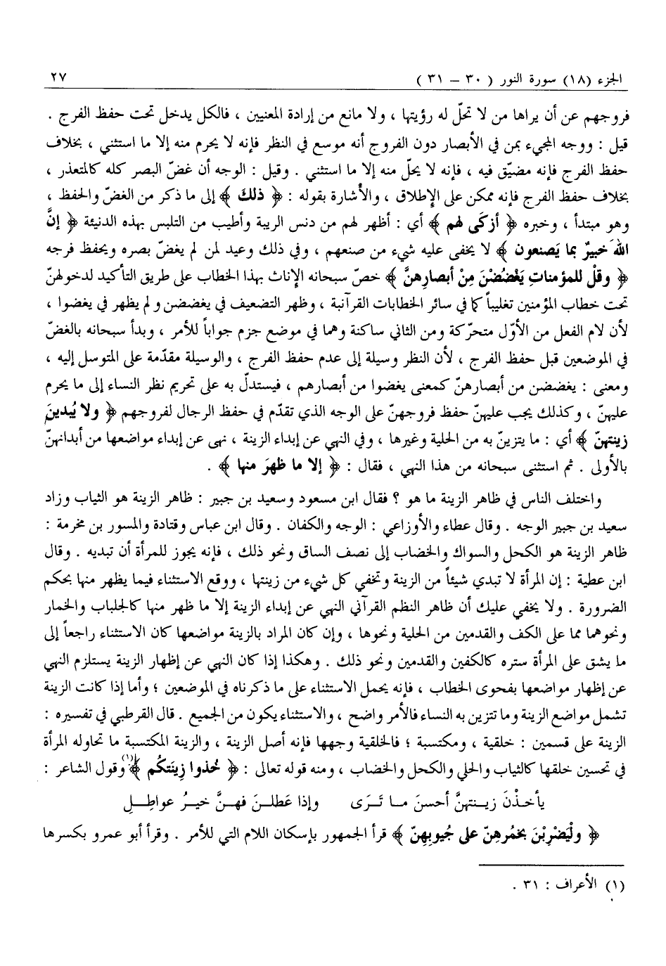 قِيلَ: وَوَجْهُ الْمَجِيءِ بِمِنْ فِي الْأَبْصَارِ دُونَ الْفُرُوجِ أَنَّهُ مُوَسَّعٌ فِي النَّظَرِ فَإِنَّهُ لَا يَحْرُمُ مِنْهُ إِلَّا مَا اسْتُثْنِيَ، بِخِلَافِ حِفْظِ الْفَرْجِ فَإِنَّهُ مُضَيَّقٌ فِيهِ، فَإِنَّهُ لَا يَحِلُّ مِنْهُ إِلَّا مَا اسْتُثْنِيَ. وَقِيلَ: الْوَجْهُ أَنَّ غَضَّ الْبَصَرِ كُلِّهِ كَالْمُتَعَذِّرِ، بِخِلَافٍ حِفْظِ الْفَرْجِ فَإِنَّهُ مُمْكِنٌ عَلَى الْإِطْلَاقِ، وَالْإِشَارَةُ بِقَوْلِهِ: ذلِكَ إِلَى مَا ذُكِرَ مِنَ الْغَضِّ وَالْحِفْظِ، وَهُوَ مُبْتَدَأٌ، وَخَبَرُهُ أَزْكى لَهُمْ أي: أظهر لَهُمْ مِنْ دَنَسِ الرِّيبَةِ وَأَطْيَبُ مِنَ التَّلَبُّسِ بِهَذِهِ الدَّنِيئَةِ إِنَّ اللَّهَ خَبِيرٌ بِما يَصْنَعُونَ لَا يَخْفَى عَلَيْهِ شَيْءٌ مِنْ صُنْعِهِمْ، وَفِي ذَلِكَ وَعِيدٌ لِمَنْ لَمْ يَغُضَّ بَصَرَهُ وَيَحْفَظْ فَرْجَهُ وَقُلْ لِلْمُؤْمِناتِ يَغْضُضْنَ مِنْ أَبْصارِهِنَّ خَصَّ سُبْحَانَهُ الْإِنَاثَ بِهَذَا الْخِطَابِ عَلَى طَرِيقِ التَّأْكِيدِ لِدُخُولِهِنَّ تَحْتَ خِطَابِ الْمُؤْمِنِينَ تَغْلِيبًا كَمَا فِي سائر الخطابات القرآنية، وظهر التضعيف في يغضضن وَلَمْ يَظْهَرْ فِي يَغُضُّوا، لِأَنَّ لَامَ الْفِعْلِ مِنَ الْأَوَّلِ مُتَحَرِّكَةٌ وَمِنَ الثَّانِي سَاكِنَةٌ وَهُمَا فِي مَوْضِعِ جَزْمٍ جَوَابًا لِلْأَمْرِ، وَبَدَأَ سُبْحَانَهُ بِالْغَضِّ فِي الْمَوْضِعَيْنِ قَبْلَ حِفْظِ الْفَرْجِ، لِأَنَّ النَّظَرَ وَسِيلَةٌ إِلَى عَدَمِ حِفْظِ الْفَرْجِ، وَالْوَسِيلَةُ مُقَدَّمَةٌ عَلَى الْمُتَوَسَّلِ إِلَيْهِ، وَمَعْنَى: يَغْضُضْنَ مِنْ أَبْصَارِهِنَّ كَمَعْنَى يَغُضُّوا مِنْ أَبْصَارِهِمْ، فَيُسْتَدَلُّ بِهِ عَلَى تَحْرِيمِ نَظَرِ النِّسَاءِ إِلَى مَا يَحْرُمُ عَلَيْهِنَّ، وَكَذَلِكَ يَجِبُ عَلَيْهِنَّ حِفْظُ فُرُوجِهِنَّ عَلَى الْوَجْهِ الَّذِي تَقَدَّمَ فِي حِفْظِ الرِّجَالِ لِفُرُوجِهِمْ وَلا يُبْدِينَ زِينَتَهُنَّ أَيْ: مَا يَتَزَيَّنَّ بِهِ مِنَ الْحِلْيَةِ وَغَيْرِهَا، وَفِي النَّهْيِ عَنْ إِبْدَاءِ الزينة، نهى عَنْ إِبْدَاءِ مَوَاضِعِهَا مِنْ أَبْدَانِهِنَّ بِالْأَوْلَى. ثُمَّ اسْتَثْنَى سُبْحَانَهُ مِنْ هَذَا النَّهْيِ، فَقَالَ: إِلَّا مَا ظَهَرَ مِنْها.