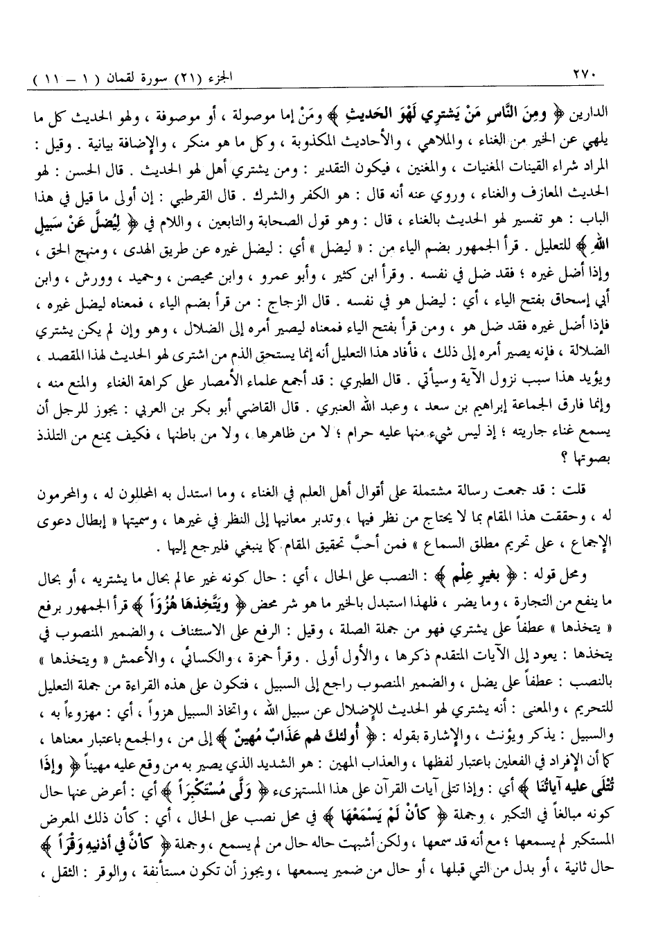 الْمُرَادُ شِرَاءُ الْقَيْنَاتِ الْمُغَنِّيَاتِ، وَالْمُغَنِّينَ، فَيَكُونُ التَّقْدِيرُ: وَمَنْ يَشْتَرِي أَهْلَ لَهْوِ الْحَدِيثِ. قَالَ الْحَسَنُ: لَهْوُ الْحَدِيثِ الْمَعَازِفُ وَالْغِنَاءُ، وَرُوِيَ عَنْهُ أَنَّهُ قَالَ: هُوَ الْكُفْرُ وَالشِّرْكُ. قَالَ الْقُرْطُبِيُّ: إِنَّ أَوْلَى مَا قِيلَ فِي هَذَا الْبَابِ: هُوَ تَفْسِيرُ لَهْوِ الْحَدِيثِ بِالْغِنَاءِ، قَالَ: وَهُوَ قَوْلُ الصَّحَابَةِ وَالتَّابِعِينَ، وَاللَّامُ فِي لِيُضِلَّ عَنْ سَبِيلِ اللَّهِ لِلتَّعْلِيلِ. قَرَأَ الْجُمْهُورُ بِضَمِّ الْيَاءِ مِنْ: «لِيُضِلَّ» أَيْ: لِيُضِلَّ غَيْرَهُ عَنْ طَرِيقِ الْهُدَى، وَمَنْهَجِ الْحَقِّ، وَإِذَا أَضَلَّ غَيْرَهُ فَقَدْ ضَلَّ فِي نَفْسِهِ. وَقَرَأَ ابْنُ كَثِيرٍ، وَأَبُو عَمْرٍو، وَابْنُ مُحَيْصِنٍ، وَحُمَيْدٌ، وَوَرْشٌ، وَابْنُ أَبِي إِسْحَاقَ بِفَتْحِ الْيَاءِ، أَيْ: لِيَضِلَّ هُوَ فِي نَفْسِهِ. قَالَ الزَّجَّاجُ: مَنْ قَرَأَ بِضَمِّ الْيَاءِ، فَمَعْنَاهُ لِيُضِلَّ غَيْرَهُ، فَإِذَا أَضَلَّ غَيْرَهُ فَقَدْ ضَلَّ هُوَ، وَمَنْ قَرَأَ بِفَتْحِ الْيَاءِ فَمَعْنَاهُ لِيَصِيرَ أَمْرُهُ إِلَى الضَّلَالِ، وَهُوَ إن لم يكن يشتري الضلالة، فَإِنَّهُ يَصِيرُ أَمْرُهُ إِلَى ذَلِكَ، فَأَفَادَ هَذَا التَّعْلِيلُ أَنَّهُ إِنَّمَا يَسْتَحِقُّ الذَّمَّ مَنِ اشْتَرَى لَهْوَ الْحَدِيثِ لِهَذَا الْمَقْصِدِ، وَيُؤَيِّدُ هَذَا سَبَبُ نزول الآية وسيأتي. قال الطبري: قَدْ أَجْمَعَ عُلَمَاءُ الْأَمْصَارِ عَلَى كَرَاهَةِ الْغِنَاءِ وَالْمَنْعِ مِنْهُ، وَإِنَّمَا فَارَقَ الْجَمَاعَةَ إِبْرَاهِيمُ بْنُ سَعْدٍ، وَعَبْدُ اللَّهِ الْعَنْبَرِيُّ. قَالَ الْقَاضِي أَبُو بَكْرِ بْنُ الْعَرَبِيِّ: يَجُوزُ لِلرَّجُلِ أَنْ يَسْمَعَ غِنَاءَ جَارِيَتِهِ إِذْ لَيْسَ شَيْءٌ مِنْهَا عَلَيْهِ حَرَامٌ لَا مِنْ ظَاهِرِهَا، وَلَا مِنْ بَاطِنِهَا، فَكَيْفَ يُمْنَعُ مِنَ التَّلَذُّذِ بِصَوْتِهَا؟