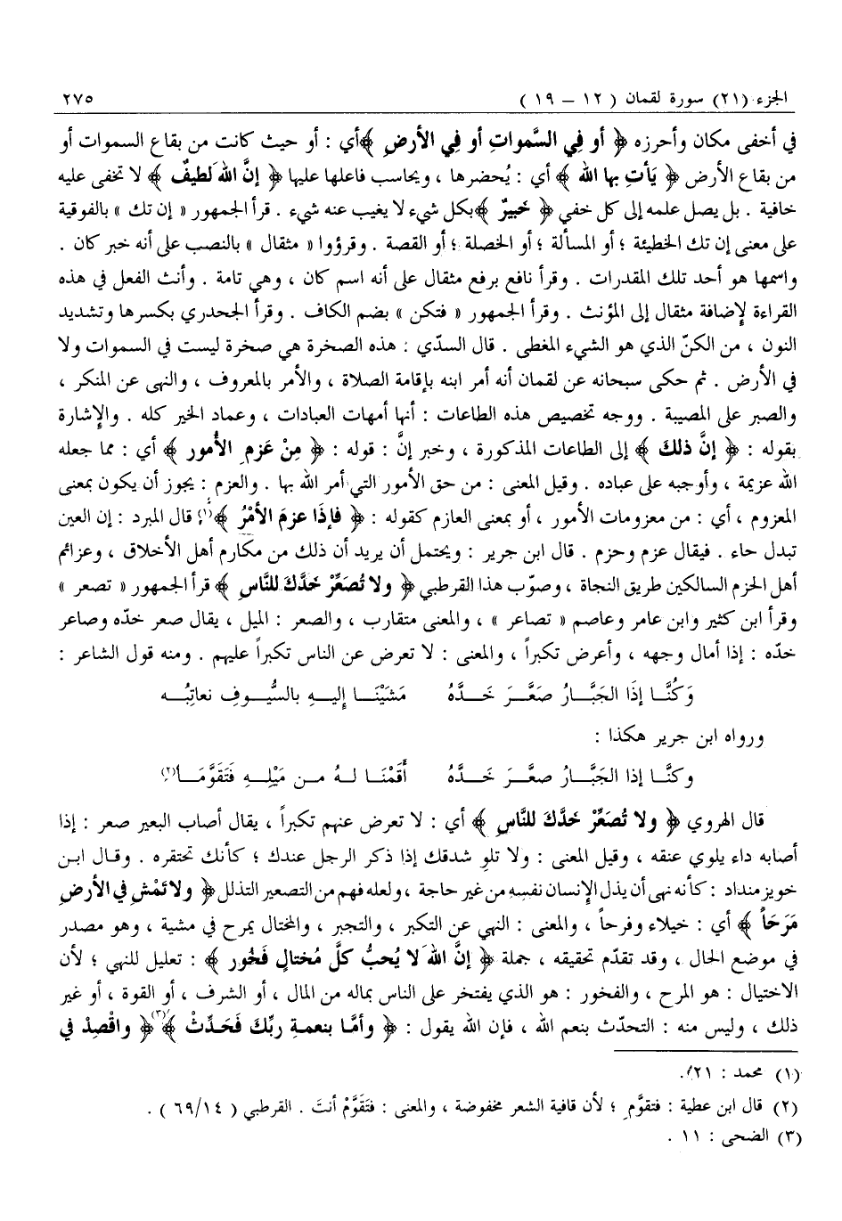 وَاسْمُهَا هُوَ أَحَدُ تِلْكَ الْمُقَدَّرَاتِ. وَقَرَأَ نَافِعٌ بِرَفْعِ مِثْقَالَ عَلَى أَنَّهُ اسْمُ كَانَ، وَهِيَ تَامَّةٌ. وَأَنَّثَ الْفِعْلَ فِي هَذِهِ الْقِرَاءَةِ لِإِضَافَةِ مِثْقَالٍ إِلَى الْمُؤَنَّثِ. وَقَرَأَ الْجُمْهُورُ «فَتَكُنْ» بِضَمِّ الْكَافِ. وَقَرَأَ الْجَحْدَرِيُّ بِكَسْرِهَا وَتَشْدِيدِ النُّونِ، مِنَ الْكَنِّ الَّذِي هُوَ الشَّيْءُ الْمُغَطَّى. قَالَ السُّدِّيُّ: هَذِهِ الصخرة هي صخرة ليست في السموات وَلَا فِي الْأَرْضِ. ثُمَّ حَكَى سُبْحَانَهُ عَنْ لُقْمَانَ أَنَّهُ أَمَرَ ابْنَهُ بِإِقَامَةِ الصَّلَاةِ، وَالْأَمْرِ بِالْمَعْرُوفِ، وَالنَّهْيِ عَنِ الْمُنْكَرِ، وَالصَّبْرِ عَلَى الْمُصِيبَةِ. وَوَجْهُ تَخْصِيصِ هَذِهِ الطَّاعَاتِ: أَنَّهَا أُمَّهَاتُ الْعِبَادَاتِ، وَعِمَادُ الْخَيْرِ كُلَّهِ. وَالْإِشَارَةُ بِقَوْلِهِ: إِنَّ ذلِكَ إِلَى الطَّاعَاتِ الْمَذْكُورَةِ، وَخَبَرُ إِنَّ: قَوْلُهُ: مِنْ عَزْمِ الْأُمُورِ أَيْ: مِمَّا جَعَلَهُ اللَّهُ عَزِيمَةً، وَأَوْجَبَهُ عَلَى عِبَادِهِ. وَقِيلَ الْمَعْنَى: مِنْ حَقِّ الْأُمُورِ الَّتِي أَمَرَ اللَّهُ بِهَا. وَالْعَزْمُ: يَجُوزُ أَنْ يَكُونَ بِمَعْنَى الْمَعْزُومِ، أَيْ: مِنْ مَعْزُومَاتِ الْأُمُورِ، أَوْ بِمَعْنَى الْعَازِمِ كَقَوْلِهِ: فَإِذا عَزَمَ الْأَمْرُ «1» قَالَ الْمُبَرِّدُ: إِنَّ الْعَيْنَ تُبْدَلُ حَاءً. فَيُقَالُ عَزْمٌ وَحَزْمٌ. قَالَ ابْنُ جَرِيرٍ: وَيُحْتَمَلُ أَنْ يُرِيدَ أَنَّ ذَلِكَ مِنْ مَكَارِمِ أَهْلِ الْأَخْلَاقِ، وَعَزَائِمِ أَهْلِ الْحَزْمِ السَّالِكِينَ طَرِيقَ النَّجَاةِ، وَصَوَّبَ هذا القرطبي وَلا تُصَعِّرْ خَدَّكَ لِلنَّاسِ قَرَأَ الْجُمْهُورُ «تُصَعِّرْ» وَقَرَأَ ابْنُ كَثِيرٍ وَابْنُ عَامِرٍ وَعَاصِمٍ «تُصَاعِرْ» ، وَالْمَعْنَى مُتَقَارِبٌ، وَالصَّعَرُ: الْمَيْلُ، يُقَالُ صَعَّرَ خَدَّهُ وَصَاعَرَ خَدَّهُ: إِذَا أَمَالَ وَجْهَهُ، وَأَعْرَضَ تَكَبُّرًا، وَالْمَعْنَى: لَا تُعْرِضْ عَنِ النَّاسِ تَكَبُّرًا عَلَيْهِمْ. وَمِنْهُ قَوْلُ الشَّاعِرِ: