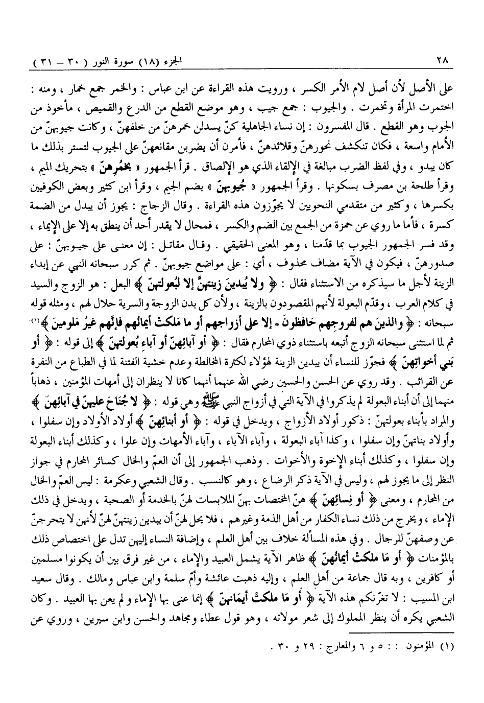 اخْتَمَرَتِ الْمَرْأَةُ وَتَخَمَّرَتْ. وَالْجُيُوبُ: جَمْعُ جَيْبٍ، وَهُوَ مَوْضِعُ الْقَطْعِ مِنَ الدِّرْعِ وَالْقَمِيصِ، مَأْخُوذٌ مِنَ الْجَوْبِ وَهُوَ الْقَطْعُ. قَالَ الْمُفَسِّرُونَ: إِنَّ نِسَاءَ الْجَاهِلِيَّةِ كُنَّ يُسْدِلْنَ خُمُرَهُنَّ مِنْ خَلْفِهِنَّ، وكانت جيوبهنّ من الأمام واسعة، فكان تَنْكَشِفُ نُحُورُهُنَّ وَقَلَائِدُهُنَّ، فَأُمِرْنَ أَنْ يَضْرِبْنَ مَقَانِعَهُنَّ عَلَى الْجُيُوبِ لِتَسْتُرَ بِذَلِكَ مَا كَانَ يَبْدُو، وَفِي لَفْظِ الضَّرْبِ مُبَالَغَةٌ فِي الْإِلْقَاءِ الَّذِي هُوَ الْإِلْصَاقُ. قَرَأَ الْجُمْهُورُ «بِخُمُرِهِنَّ» بِتَحْرِيكِ الْمِيمِ، وَقَرَأَ طَلْحَةُ بْنُ مُصَرِّفٍ بِسُكُونِهَا. وَقَرَأَ الْجُمْهُورُ «جُيُوبِهِنَّ» بِضَمِّ الْجِيمِ، وَقَرَأَ ابْنُ كَثِيرٍ وَبَعْضُ الْكُوفِيِّينَ بِكَسْرِهَا، وَكَثِيرٌ مِنْ مُتَقَدِّمِي النَّحْوِيِّينَ لَا يُجَوِّزُونَ هَذِهِ الْقِرَاءَةَ. وَقَالَ الزَّجَّاجُ: يَجُوزُ أَنْ يُبَدِّلَ مِنَ الضَّمَّةِ كَسْرَةً، فَأَمَّا مَا رُوِيَ عَنْ حَمْزَةَ مِنَ الْجَمْعِ بَيْنَ الضَّمِّ وَالْكَسْرِ، فَمُحَالٌ لَا يَقْدِرُ أَحَدٌ أَنْ يَنْطِقَ بِهِ إِلَّا عَلَى الْإِيمَاءِ، وَقَدْ فَسَّرَ الْجُمْهُورُ الْجُيُوبَ بِمَا قَدَّمْنَا، وَهُوَ الْمَعْنَى الْحَقِيقِيُّ. وَقَالَ مُقَاتِلٌ: إِنَّ مَعْنَى عَلَى جُيُوبِهِنَّ: عَلَى صُدُورِهِنَّ، فَيَكُونُ فِي الْآيَةِ مُضَافٌ مَحْذُوفٌ، أَيْ: عَلَى مَوَاضِعِ جُيُوبِهِنَّ. ثُمَّ كَرَّرَ سُبْحَانَهُ النَّهْيَ عَنْ إِبْدَاءِ الزِّينَةِ لِأَجْلِ مَا سَيَذْكُرُهُ مِنَ الِاسْتِثْنَاءِ فَقَالَ: وَلا يُبْدِينَ زِينَتَهُنَّ إِلَّا لِبُعُولَتِهِنَّ الْبَعْلُ: هُوَ الزَّوْجُ وَالسَّيِّدُ فِي كَلَامِ الْعَرَبِ، وَقَدَّمَ الْبُعُولَةَ لِأَنَّهُمُ الْمَقْصُودُونَ بِالزِّينَةِ، وَلِأَنَّ كُلَّ بَدَنِ الزَّوْجَةِ والسرية حلال لهم، ومثله قَوْلِهِ سُبْحَانَهُ: وَالَّذِينَ هُمْ لِفُرُوجِهِمْ حافِظُونَ إِلَّا عَلى أَزْواجِهِمْ أَوْ مَا مَلَكَتْ أَيْمانُهُمْ فَإِنَّهُمْ غَيْرُ مَلُومِينَ «1» ثُمَّ لَمَّا اسْتَثْنَى سُبْحَانَهُ الزَّوْجَ أَتْبَعَهُ بِاسْتِثْنَاءِ ذَوِي الْمَحَارِمِ فَقَالَ: أَوْ آبائِهِنَّ أَوْ آباءِ بُعُولَتِهِنَّ إِلَى قَوْلِهِ: أَوْ بَنِي أَخَواتِهِنَّ فَجَوَّزَ لِلنِّسَاءِ أَنْ يُبْدِينَ الزِّينَةَ لِهَؤُلَاءِ لِكَثْرَةِ الْمُخَالَطَةِ وَعَدَمِ خَشْيَةِ الْفِتْنَةِ لِمَا فِي الطِّبَاعِ مِنَ النُّفْرَةِ عَنِ الْقَرَائِبِ. وَقَدْ رُوِيَ عَنِ الْحَسَنِ وَالْحُسَيْنِ رَضِيَ اللَّهُ عَنْهُمَا أَنَّهُمَا كَانَا لَا يَنْظُرَانِ إِلَى أُمَّهَاتِ الْمُؤْمِنِينَ، ذَهَابًا مِنْهُمَا إِلَى أَنَّ أَبْنَاءَ الْبُعُولَةِ لَمْ يُذْكَرُوا فِي الْآيَةِ الَّتِي فِي أَزْوَاجِ النَّبِيِّ صَلَّى اللَّهُ عَلَيْهِ وَسَلَّمَ وَهِيَ قَوْلُهُ: لَا جُناحَ عَلَيْهِنَّ فِي آبائِهِنَّ وَالْمُرَادُ بِأَبْنَاءِ بُعُولَتِهِنَّ: ذُكُورُ أَوْلَادِ الْأَزْوَاجِ، وَيَدْخُلُ فِي قَوْلِهِ: أَوْ أَبْنائِهِنَّ أَوْلَادُ الْأَوْلَادِ وَإِنْ سَفَلُوا، وَأَوْلَادُ بَنَاتِهِنَّ وَإِنْ سَفَلُوا، وَكَذَا آبَاءُ الْبُعُولَةِ، وَآبَاءُ الْآبَاءِ، وَآبَاءُ الْأُمَّهَاتِ وَإِنْ عَلَوْا، وَكَذَلِكَ أَبْنَاءُ الْبُعُولَةِ وَإِنْ سَفَلُوا، وَكَذَلِكَ أَبْنَاءُ الْإِخْوَةِ وَالْأَخَوَاتِ. وَذَهَبَ الْجُمْهُورُ إِلَى أَنَّ الْعَمَّ وَالْخَالَ كَسَائِرِ الْمَحَارِمِ فِي جَوَازِ النَّظَرِ إِلَى مَا يَجُوزُ لَهُمْ، وَلَيْسَ فِي الْآيَةِ ذِكْرُ الرَّضَاعِ، وَهُوَ كَالنَّسَبِ. وَقَالَ الشَّعْبِيُّ وَعِكْرِمَةُ: لَيْسَ الْعَمُّ وَالْخَالُ مِنَ الْمَحَارِمِ، وَمَعْنَى أَوْ نِسائِهِنَّ هُنَّ الْمُ