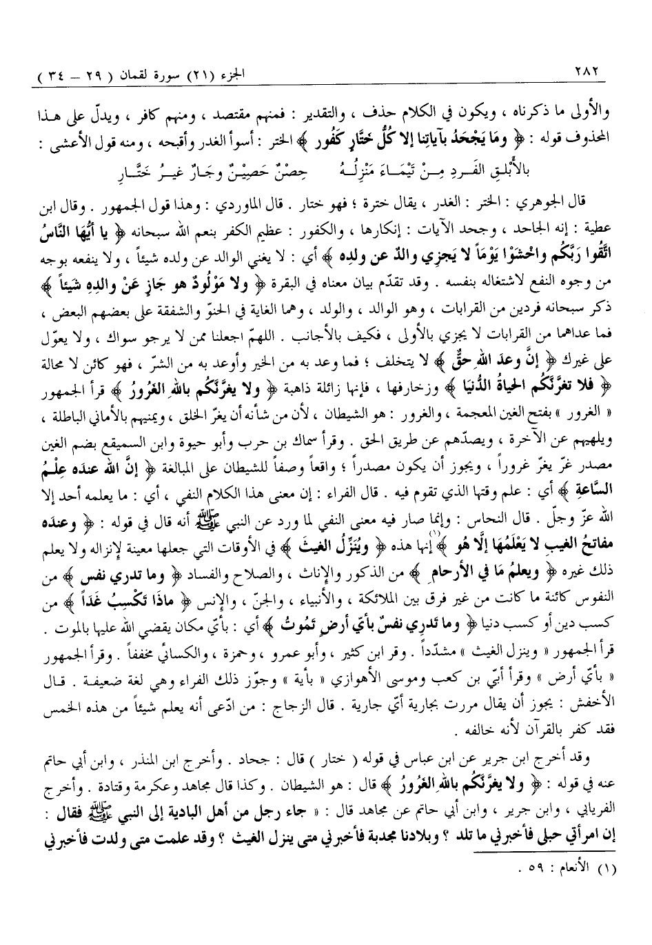 قَالَ الْجَوْهَرِيُّ: الْخَتْرُ: الْغَدْرُ، يُقَالُ خَتَرَهُ فَهُوَ خَتَّارٌ. قَالَ الْمَاوَرْدِيُّ: وَهَذَا قَوْلُ الْجُمْهُورِ. وَقَالَ ابْنُ عَطِيَّةَ: إِنَّهُ الْجَاحِدُ، وَجَحْدُ الْآيَاتِ: إِنْكَارُهَا، وَالْكَفُورُ: عَظِيمُ الْكُفْرِ بِنِعَمِ اللَّهِ سُبْحَانَهُ يَا أَيُّهَا النَّاسُ اتَّقُوا رَبَّكُمْ وَاخْشَوْا يَوْماً لَا يَجْزِي والِدٌ عَنْ وَلَدِهِ أَيْ: لَا يُغْنِي الْوَالِدُ عَنْ وَلَدِهِ شَيْئًا، وَلَا يَنْفَعُهُ بِوَجْهٍ مِنْ وُجُوهِ النَّفْعِ لِاشْتِغَالِهِ بِنَفْسِهِ. وَقَدْ تَقَدَّمَ بَيَانُ مَعْنَاهُ فِي الْبَقَرَةِ وَلا مَوْلُودٌ هُوَ جازٍ عَنْ والِدِهِ شَيْئاً ذَكَرَ سُبْحَانَهُ فَرْدَيْنِ مِنَ الْقَرَابَاتِ، وَهُوَ الْوَالِدُ، وَالْوَلَدُ، وَهُمَا الْغَايَةُ فِي الْحُنُوِّ وَالشَّفَقَةِ عَلَى بَعْضِهِمُ الْبَعْضُ، فَمَا عَدَاهُمَا مِنَ الْقَرَابَاتِ لَا يَجْزِي بِالْأَوْلَى، فَكَيْفَ بِالْأَجَانِبِ. اللَّهُمَّ اجْعَلْنَا مِمَّنْ لَا يَرْجُو سِوَاكَ، وَلَا يُعَوِّلُ عَلَى غَيْرِكَ إِنَّ وَعْدَ اللَّهِ حَقٌّ لَا يَتَخَلَّفُ فَمَا وَعَدَ بِهِ مِنَ الْخَيْرِ وَأَوْعَدَ بِهِ مِنَ الشَّرِّ، فَهُوَ كَائِنٌ لَا مَحَالَةَ فَلا تَغُرَّنَّكُمُ الْحَياةُ الدُّنْيا وَزَخَارِفُهَا، فَإِنَّهَا زَائِلَةٌ ذَاهِبَةٌ وَلا يَغُرَّنَّكُمْ بِاللَّهِ الْغَرُورُ قَرَأَ الْجُمْهُورُ «الْغَرُورِ» بِفَتْحِ الْغَيْنِ الْمُعْجَمَةِ، وَالْغَرُورِ: هُوَ الشَّيْطَانُ، لِأَنَّ مِنْ شَأْنِهِ أَنْ يَغُرَّ الْخَلْقَ، وَيُمَنِّيَهُمْ بِالْأَمَانِي الْبَاطِلَةِ، وَيُلْهِيَهُمْ عَنِ الْآخِرَةِ، وَيَصُدَّهُمْ عَنْ طَرِيقِ الْحَقِّ. وَقَرَأَ سِمَاكُ بْنُ حَرْبٍ وأبو حيوة وابن السميقع بِضَمِّ الْغَيْنِ مَصْدَرُ غَرَّ يَغُرُّ غُرُورًا، وَيَجُوزُ أَنْ يَكُونَ مَصْدَرًا وَاقِعًا وَصْفًا لِلشَّيْطَانِ عَلَى الْمُبَالَغَةِ إِنَّ اللَّهَ عِنْدَهُ عِلْمُ السَّاعَةِ أَيْ: عِلْمُ وَقْتِهَا الَّذِي تَقُومُ فِيهِ. قَالَ الْفَرَّاءُ: إِنَّ مَعْنَى هَذَا الْكَلَامِ النَّفْيُ، أَيْ: مَا يَعْلَمُهُ أَحَدٌ إِلَّا اللَّهُ عَزَّ وَجَلَّ. قَالَ النَّحَّاسُ: وَإِنَّمَا صَارَ فِيهِ مَعْنَى النَّفْيِ لِمَا ورد عَنِ النَّبِيِّ صَلَّى اللَّهُ عَلَيْهِ وَسَلَّمَ أَنَّهُ قَالَ فِي قَوْلُهُ: وَعِنْدَهُ مَفاتِحُ الْغَيْبِ لَا يَعْلَمُها إِلَّا هُوَ «1» إِنَّهَا هَذِهِ وَيُنَزِّلُ الْغَيْثَ فِي الْأَوْقَاتِ الَّتِي جَعَلَهَا مُعَيَّنَةً لِإِنْزَالِهِ وَلَا يَعْلَمُ ذَلِكَ غَيْرُهُ وَيَعْلَمُ مَا فِي الْأَرْحامِ مِنَ الذُّكُورِ وَالْإِنَاثِ، وَالصَّلَاحِ وَالْفَسَادِ وَما تَدْرِي نَفْسٌ مِنَ النُّفُوسِ كَائِنَةً مَا كَانَتْ مِنْ غَيْرِ فَرْقٍ بَيْنَ الْمَلَائِكَةِ، وَالْأَنْبِيَاءِ، وَالْجِنِّ، وَالْإِنْسِ مَاذَا تَكْسِبُ غَداً مِنْ كَسْبِ دِينٍ أَوْ كَسْبِ دُنْيَا وَما تَدْرِي نَفْسٌ بِأَيِّ أَرْضٍ تَمُوتُ أَيْ: بِأَيِّ مَكَانٍ يَقْضِي اللَّهُ عَلَيْهَا بِالْمَوْتِ.