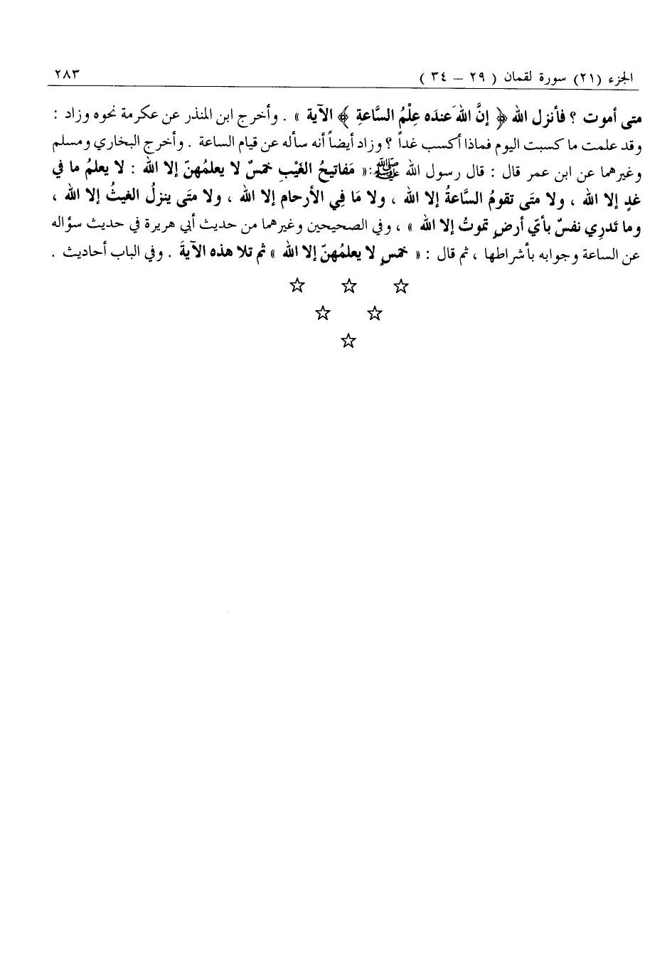 وَقَدْ عَلِمْتُ مَا كَسَبْتُ الْيَوْمَ فَمَاذَا أَكْسِبُ غَدًا؟ وَزَادَ أَيْضًا أَنَّهُ سَأَلَهُ عَنْ قِيَامِ السَّاعَةِ. وَأَخْرَجَ الْبُخَارِيُّ وَمُسْلِمٌ وَغَيْرُهُمَا عَنِ ابْنِ عُمَرَ قَالَ: قَالَ رَسُولُ اللَّهِ صَلَّى اللَّهُ عَلَيْهِ وَسَلَّمَ: «مَفَاتِيحُ الْغَيْبِ خَمْسٌ لَا يَعْلَمُهُنَّ إِلَّا اللَّهُ: لَا يَعْلَمُ مَا فِي غَدٍ إِلَّا اللَّهُ، وَلَا مَتَى تَقُومُ السَّاعَةُ إِلَّا اللَّهُ، وَلَا مَا فِي الْأَرْحَامِ إِلَّا اللَّهُ، وَلَا مَتَى يَنْزِلُ الْغَيْثُ إِلَّا اللَّهُ، وَمَا تَدْرِي نَفْسٌ بِأَيِّ أَرْضٍ تَمُوتُ إِلَّا اللَّهُ» ، وَفِي الصَّحِيحَيْنِ وَغَيْرِهِمَا مِنْ حَدِيثِ أَبِي هُرَيْرَةَ فِي حَدِيثِ سُؤَالِهِ عَنِ السَّاعَةِ وَجَوَابِهِ بِأَشْرَاطِهَا، ثُمَّ قال: «خَمْسٍ لَا يَعْلَمُهُنَّ إِلَّا اللَّهُ» ثُمَّ تَلَا هذه الآية. وفي الباب أحاديث.