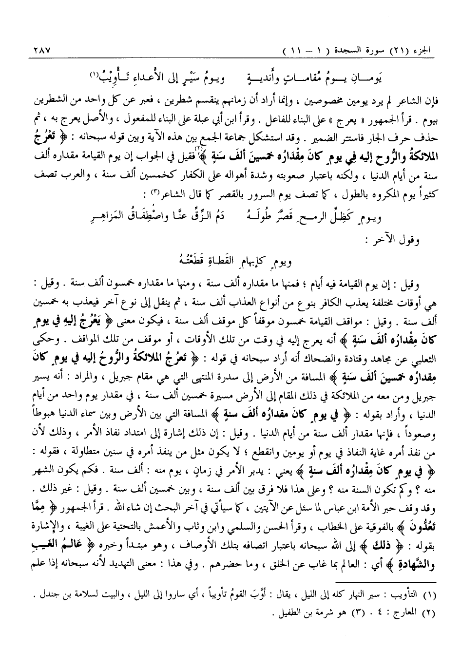 فَإِنَّ الشَّاعِرَ لَمْ يُرِدْ يَوْمَيْنِ مَخْصُوصَيْنِ، وَإِنَّمَا أَرَادَ أَنَّ زَمَانَهُمْ يَنْقَسِمُ شَطْرَيْنِ، فَعَبَّرَ عَنْ كُلِّ وَاحِدٍ مِنَ الشَّطْرَيْنِ بِيَوْمٍ. قَرَأَ الْجُمْهُورُ «يَعْرُجُ» عَلَى الْبِنَاءِ لِلْفَاعِلِ. وَقَرَأَ ابْنُ أَبِي عَبْلَةَ عَلَى الْبِنَاءِ لِلْمَفْعُولِ، وَالْأَصْلُ يُعْرَجُ بِهِ، ثُمَّ حُذِفَ حَرْفُ الْجَارِّ فَاسْتَتَرَ الضَّمِيرُ. وَقَدِ اسْتَشْكَلَ جَمَاعَةٌ الْجَمْعَ بَيْنَ هَذِهِ الْآيَةِ وَبَيْنَ قَوْلِهِ سُبْحَانَهُ: تَعْرُجُ الْمَلائِكَةُ وَالرُّوحُ إِلَيْهِ فِي يَوْمٍ كانَ مِقْدارُهُ خَمْسِينَ أَلْفَ سَنَةٍ «2» فَقِيلَ فِي الْجَوَابِ إِنَّ يَوْمَ الْقِيَامَةِ مِقْدَارُهُ أَلْفُ سَنَةٍ مِنْ أَيَّامِ الدُّنْيَا، وَلَكِنَّهُ بِاعْتِبَارِ صُعُوبَتِهِ وَشِدَّةِ أَهْوَالِهِ عَلَى الْكُفَّارِ كَخَمْسِينَ أَلْفَ سَنَةٍ، وَالْعَرَبُ تَصِفُ كَثِيرًا يَوْمَ الْمَكْرُوهِ بِالطُّولِ، كَمَا تَصِفُ يَوْمَ السُّرُورِ بِالْقِصَرِ كَمَا قَالَ الشَّاعِرُ «3» :