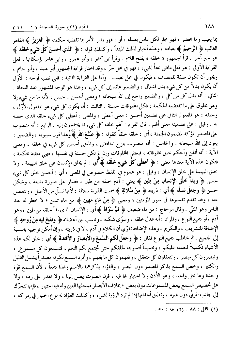 الثَّانِي: أَنَّهُ بَدَلُ كُلٍّ مِنْ كُلٍّ، وَالضَّمِيرُ رَاجِعٌ إِلَى اللَّهِ سُبْحَانَهُ وَمَعْنَى أَحْسَنَ: حَسَّنَ، لِأَنَّهُ مَا مِنْ شَيْءٍ إِلَّا وَهُوَ مَخْلُوقٌ عَلَى مَا تَقْتَضِيهِ الْحِكْمَةُ، فَكُلُّ الْمَخْلُوقَاتِ حَسَنَةٌ. الثَّالِثُ: أَنْ يَكُونَ كُلُّ شَيْءٍ هُوَ الْمَفْعُولُ الْأَوَّلُ، وَخَلَقَهُ: هُوَ الْمَفْعُولُ الثَّانِي عَلَى تَضْمِينِ أَحْسَنَ: مَعْنَى أَعْطَى، وَالْمَعْنَى: أَعْطَى كُلَّ شَيْءٍ خَلَقَهُ الَّذِي خَصَّهُ بِهِ. وَقِيلَ: عَلَى تَضْمِينِهِ مَعْنَى أَلْهَمَ. قَالَ الْفَرَّاءُ: أَلْهَمَ خَلْقَهُ كُلَّ شَيْءٍ مِمَّا يَحْتَاجُونَ إِلَيْهِ. الرَّابِعُ: أَنَّهُ مَنْصُوبٌ عَلَى الْمَصْدَرِ الْمُؤَكِّدِ لِمَضْمُونِ الْجُمْلَةِ، أَيْ: خَلَقَهُ خَلْقًا كَقَوْلِهِ: صُنْعَ اللَّهِ «1» وَهَذَا قَوْلُ سِيبَوَيْهِ، وَالضَّمِيرُ: