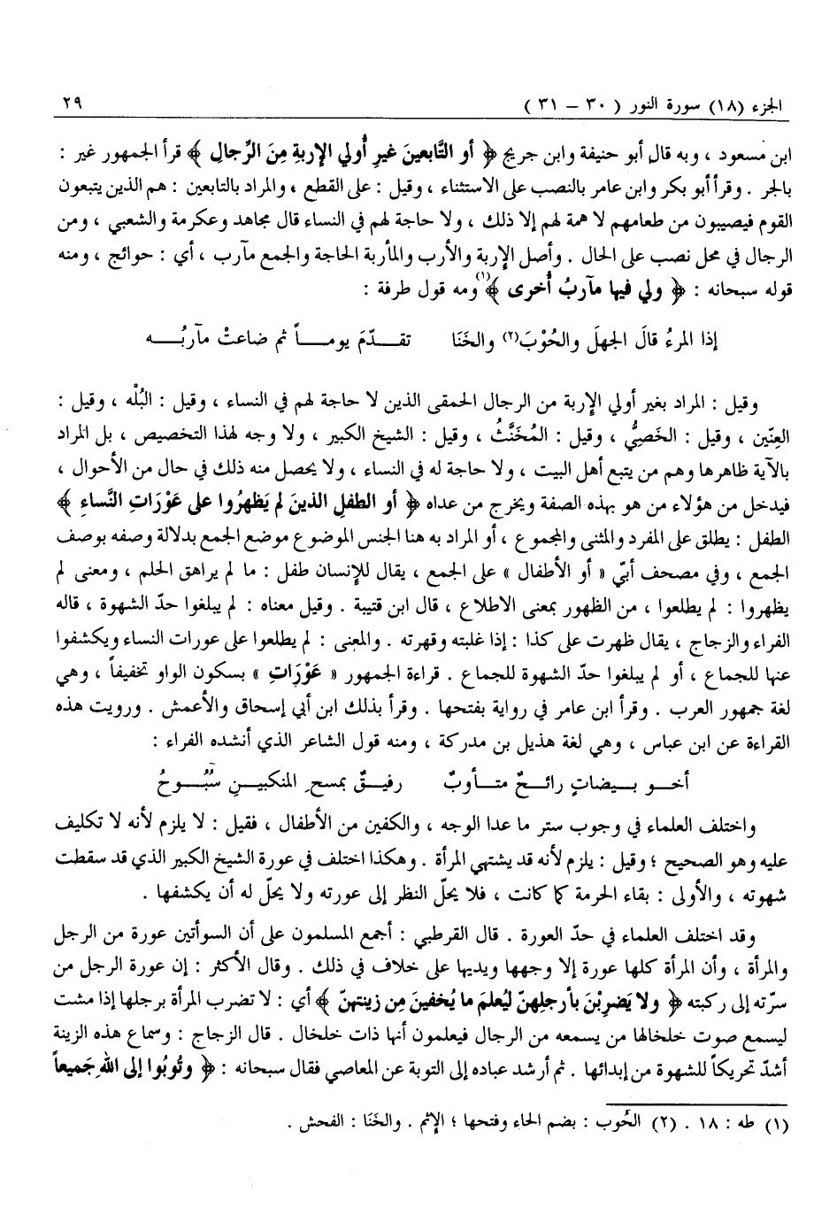 الْعِنِّينُ، وَقِيلَ: الْخَصِيُّ، وَقِيلَ: الْمُخَنَّثُ، وَقِيلَ: الشَّيْخُ الْكَبِيرُ، وَلَا وَجْهَ لِهَذَا التَّخْصِيصِ، بَلِ الْمُرَادُ بِالْآيَةِ ظَاهِرُهَا وَهُمْ مِنْ يَتْبَعُ أَهْلَ الْبَيْتِ، وَلَا حَاجَةَ لَهُ فِي النِّسَاءِ، وَلَا يَحْصُلُ مِنْهُ ذَلِكَ فِي حَالٍ مِنَ الْأَحْوَالِ، فَيَدْخُلُ مِنْ هَؤُلَاءِ مَنْ هُوَ بِهَذِهِ الصِّفَةِ وَيَخْرُجُ مَنْ عَدَاهُ أَوِ الطِّفْلِ الَّذِينَ لَمْ يَظْهَرُوا عَلى عَوْراتِ النِّساءِ الطِّفْلُ: يُطْلَقُ عَلَى الْمُفْرَدِ وَالْمُثَنَّى وَالْمَجْمُوعِ، أَوِ الْمُرَادِ بِهِ هُنَا الْجِنْسُ الْمَوْضُوعُ مَوْضِعَ الْجَمْعِ بِدَلَالَةِ وَصْفِهِ بِوَصْفِ الْجَمْعِ، وَفِي مُصْحَفِ أُبَيٍّ «أَوِ الْأَطْفَالِ» عَلَى الْجَمْعِ، يُقَالُ لِلْإِنْسَانِ طِفْلٌ: مَا لَمْ يُرَاهِقِ الْحُلُمَ، وَمَعْنَى لَمْ يَظْهَرُوا: لَمْ يَطَّلِعُوا، من الظهور بمعنى الاطلاع، قال ابْنُ قُتَيْبَةَ. وَقِيلَ مَعْنَاهُ: لَمْ يَبْلُغُوا حَدَّ الشهوة، قَالَهُ الْفَرَّاءُ وَالزَّجَّاجُ، يُقَالُ ظَهَرْتُ عَلَى كَذَا: إِذَا غَلَبَتُهُ وَقَهَرَتُهُ. وَالْمَعْنَى: لَمْ يَطَّلِعُوا عَلَى عَوْرَاتِ النِّسَاءِ وَيَكْشِفُوا عَنْهَا لِلْجِمَاعِ، أَوْ لَمْ يَبْلُغُوا حَدَّ الشَّهْوَةِ لِلْجِمَاعِ. قِرَاءَةُ الْجُمْهُورِ «عَوْرَاتِ» بِسُكُونِ الْوَاوِ تَخْفِيفًا، وَهِيَ لُغَةُ جُمْهُورِ الْعَرَبِ. وَقَرَأَ ابْنُ عَامِرٍ فِي رِوَايَةٍ بِفَتْحِهَا. وَقَرَأَ بِذَلِكَ ابْنُ أَبِي إِسْحَاقَ وَالْأَعْمَشُ. وَرُوِيَتْ هَذِهِ الْقِرَاءَةُ عَنِ ابْنِ عَبَّاسٍ، وَهِيَ لُغَةُ هُذَيْلِ بْنِ مُدْرِكَةَ، وَمِنْهُ قَوْلُ الشَّاعِرِ الَّذِي أَنْشَدَهُ الفراء: