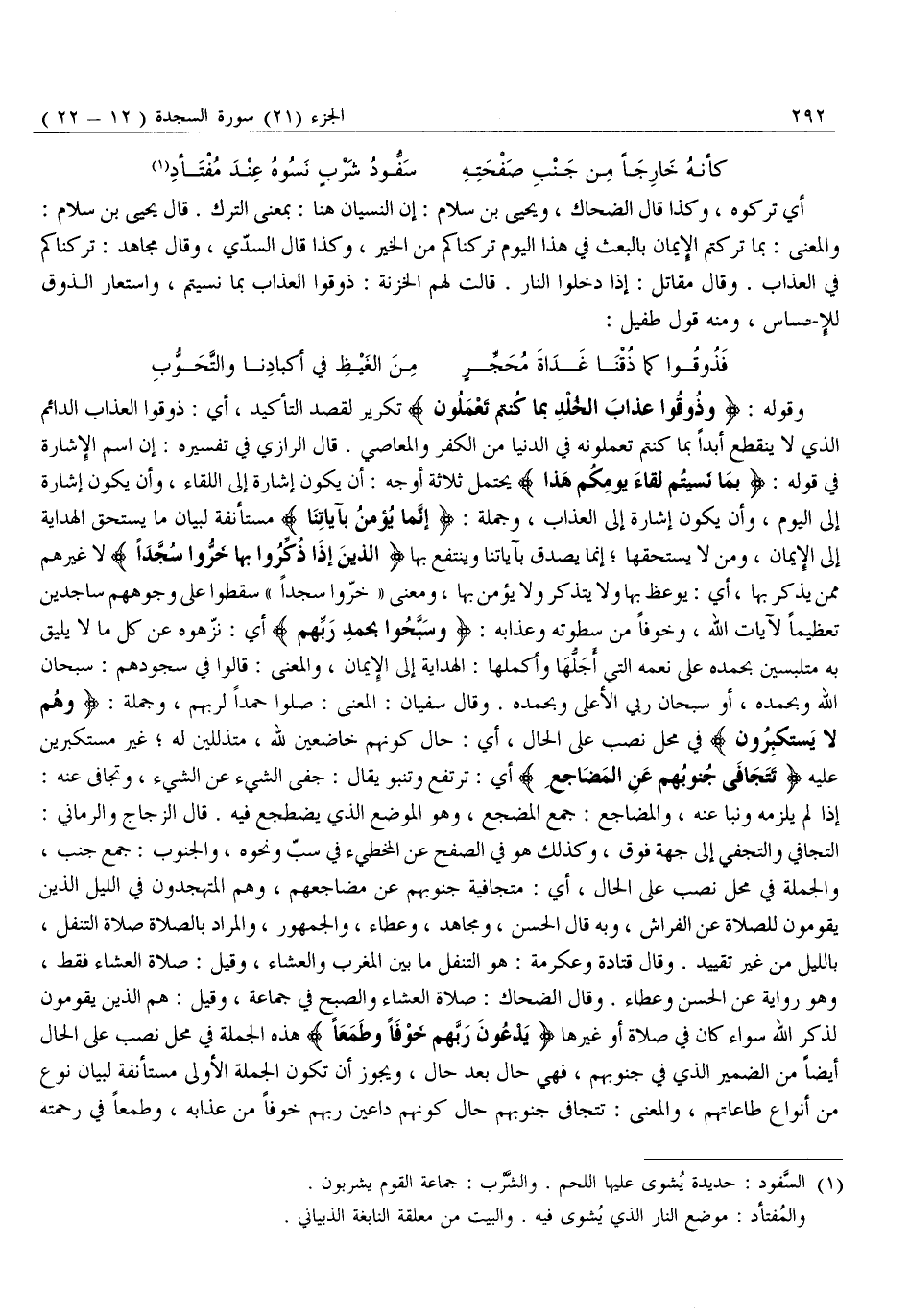 وَقَوْلُهُ: وَذُوقُوا عَذابَ الْخُلْدِ بِما كُنْتُمْ تَعْمَلُونَ تَكْرِيرٌ لِقَصْدِ التَّأْكِيدِ، أَيْ: ذُوقُوا الْعَذَابَ الدَّائِمَ الَّذِي لَا يَنْقَطِعُ أَبَدًا بِمَا كُنْتُمْ تَعْمَلُونَهُ فِي الدُّنْيَا مِنَ الْكُفْرِ وَالْمَعَاصِي. قَالَ الرَّازِيُّ فِي تَفْسِيرِهِ: إِنَّ اسْمَ الْإِشَارَةِ فِي قَوْلِهِ: بِما نَسِيتُمْ لِقاءَ يَوْمِكُمْ هَذَا يَحْتَمِلُ ثَلَاثَةَ أَوْجُهٍ: أَنْ يَكُونَ إِشَارَةً إِلَى اللِّقَاءِ، وَأَنْ يَكُونَ إِشَارَةً إِلَى الْيَوْمِ، وَأَنْ يَكُونَ إِشَارَةً إِلَى الْعَذَابِ، وَجُمْلَةُ: إِنَّما يُؤْمِنُ بِآياتِنَا مُسْتَأْنَفَةٌ لِبَيَانِ مَا يَسْتَحِقُّ الْهِدَايَةَ إِلَى الْإِيمَانِ، وَمَنْ لَا يَسْتَحِقُّهَا إِنَّمَا يُصَدِّقُ بِآيَاتِنَا وَيَنْتَفِعُ بِهَا الَّذِينَ إِذا ذُكِّرُوا بِها خَرُّوا سُجَّداً لَا غَيْرُهُمْ مِمَّنْ يُذَكَّرُ بِهَا، أَيْ: يُوعَظُ بِهَا وَلَا يَتَذَكَّرُ وَلَا يُؤْمِنُ بِهَا، وَمَعْنَى «خَرُّوا سُجَّدًا» سَقَطُوا عَلَى وُجُوهِهِمْ سَاجِدِينَ تَعْظِيمًا لِآيَاتِ اللَّهِ، وَخَوْفًا مِنْ سَطْوَتِهِ وَعَذَابِهِ: وَسَبَّحُوا بِحَمْدِ رَبِّهِمْ أَيْ: نَزَّهُوهُ عَنْ كُلِّ مَا لَا يَلِيقُ بِهِ متلبسين بِحَمْدِهِ عَلَى نِعَمِهِ الَّتِي أَجَلُّهَا وَأَكْمَلُهَا: الْهِدَايَةُ إِلَى الْإِيمَانِ، وَالْمَعْنَى: قَالُوا فِي سُجُودِهِمْ: سُبْحَانَ اللَّهِ وَبِحَمْدِهِ، أَوْ سُبْحَانَ رَبِّيَ الْأَعْلَى وَبِحَمْدِهِ. وَقَالَ سُفْيَانُ: الْمَعْنَى: صَلُّوا حَمْدًا لِرَبِّهِمْ، وَجُمْلَةُ: وَهُمْ لَا يَسْتَكْبِرُونَ فِي مَحَلِّ نَصْبٍ عَلَى الْحَالِ، أَيْ: حَالَ كَوْنِهِمْ خَاضِعِينَ لِلَّهِ، مُتَذَلِّلِينَ لَهُ غَيْرَ مُسْتَكْبِرِينَ عَلَيْهِ تَتَجافى جُنُوبُهُمْ عَنِ الْمَضاجِعِ أَيْ: تَرْتَفِعُ وَتَنْبُو يُقَالُ: جَفَى الشَّيْءُ عَنِ الشَّيْءِ، وَتَجَافَى عَنْهُ: