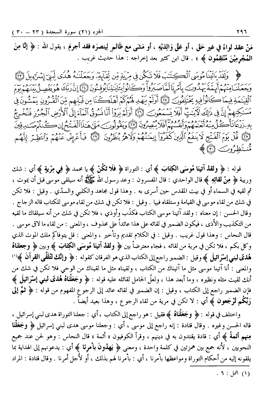 وَلَقَدْ آتَيْنا مُوسَى الْكِتابَ فَلا تَكُنْ فِي مِرْيَةٍ مِنْ لِقائِهِ وَجَعَلْناهُ هُدىً لِبَنِي إِسْرائِيلَ (23) وَجَعَلْنا مِنْهُمْ أَئِمَّةً يَهْدُونَ بِأَمْرِنا لَمَّا صَبَرُوا وَكانُوا بِآياتِنا يُوقِنُونَ (24) إِنَّ رَبَّكَ هُوَ يَفْصِلُ بَيْنَهُمْ يَوْمَ الْقِيامَةِ فِيما كانُوا فِيهِ يَخْتَلِفُونَ (25) أَوَلَمْ يَهْدِ لَهُمْ كَمْ أَهْلَكْنا مِنْ قَبْلِهِمْ مِنَ الْقُرُونِ يَمْشُونَ فِي مَساكِنِهِمْ إِنَّ فِي ذلِكَ لَآياتٍ أَفَلا يَسْمَعُونَ (26) أَوَلَمْ يَرَوْا أَنَّا نَسُوقُ الْماءَ إِلَى الْأَرْضِ الْجُرُزِ فَنُخْرِجُ بِهِ زَرْعاً تَأْكُلُ مِنْهُ أَنْعامُهُمْ وَأَنْفُسُهُمْ أَفَلا يُبْصِرُونَ (27)