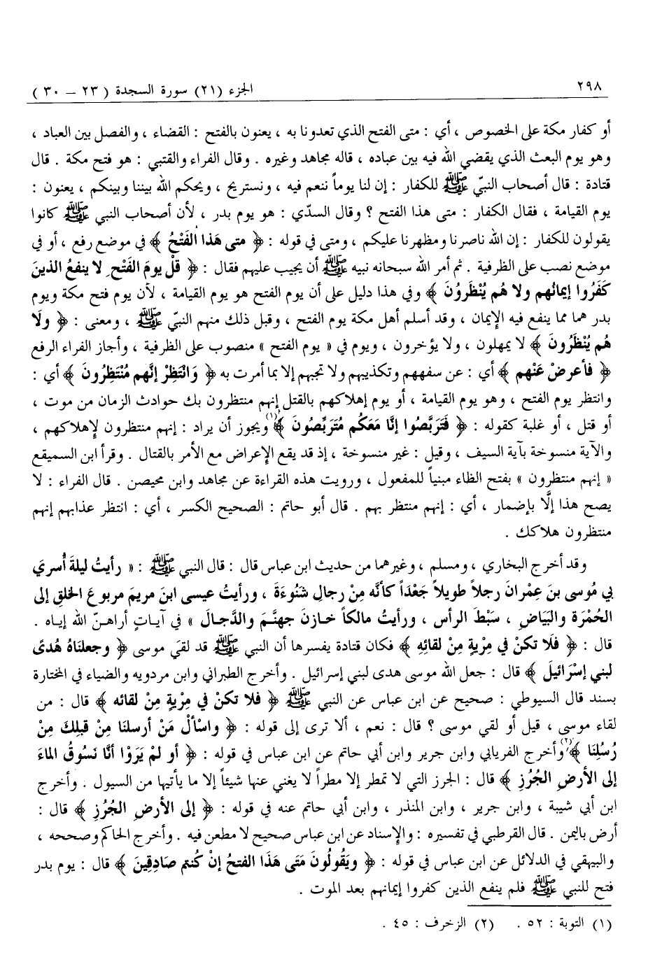قَالَ: فَلا تَكُنْ فِي مِرْيَةٍ مِنْ لِقائِهِ فَكَانَ قَتَادَةُ يُفَسِّرُهَا أَنَّ النَّبِيَّ صَلَّى اللَّهُ عَلَيْهِ وَسَلَّمَ قَدْ لَقِيَ مُوسَى وَجَعَلْناهُ هُدىً لِبَنِي إِسْرائِيلَ قَالَ: جَعَلَ اللَّهُ مُوسَى هُدًى لِبَنِي إِسْرَائِيلَ. وَأَخْرَجَ الطَّبَرَانِيُّ وَابْنُ مَرْدَوَيْهِ وَالضِّيَاءُ فِي الْمُخْتَارَةِ بِسَنَدٍ قَالَ السُّيُوطِيُّ: صَحِيحٌ عَنِ ابْنِ عَبَّاسٍ عَنِ النَّبِيِّ صَلَّى اللَّهُ عليه وَسَلَّمَ فَلا تَكُنْ فِي مِرْيَةٍ مِنْ لِقائِهِ قَالَ: مِنْ لِقَاءِ مُوسَى، قِيلَ أَوَ لَقِيَ مُوسَى؟ قَالَ: نَعَمْ، أَلَا تَرَى إِلَى قَوْلِهِ: وَسْئَلْ مَنْ أَرْسَلْنا مِنْ قَبْلِكَ مِنْ رُسُلِنا «2» وَأَخْرَجَ الْفِرْيَابِيُّ وَابْنُ جَرِيرٍ وَابْنُ أَبِي حَاتِمٍ عَنِ ابْنِ عَبَّاسٍ فِي قَوْلِهِ: أَوَلَمْ يَرَوْا أَنَّا نَسُوقُ الْماءَ إِلَى الْأَرْضِ الْجُرُزِ قَالَ: الْجُرُزُ الَّتِي لَا تُمْطَرُ إِلَّا مَطَرًا لَا يُغْنِي عَنْهَا شَيْئًا إِلَّا مَا يَأْتِيهَا مِنَ السُّيُولِ. وَأَخْرَجَ ابْنُ أَبِي شَيْبَةَ، وَابْنُ جَرِيرٍ، وَابْنُ الْمُنْذِرِ، وَابْنُ أَبِي حَاتِمٍ عَنْهُ فِي قَوْلِهِ: إِلَى الْأَرْضِ الْجُرُزِ قَالَ: