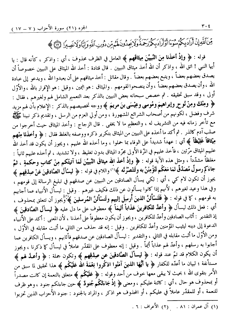 قَوْلُهُ: وَإِذْ أَخَذْنا مِنَ النَّبِيِّينَ مِيثاقَهُمْ الْعَامِلُ فِي الظَّرْفِ مَحْذُوفٌ، أَيْ: وَاذْكُرْ، كَأَنَّهُ قَالَ: يَا أَيُّهَا النَّبِيُّ! اتَّقِ اللَّهَ، وَاذْكُرْ أَنَّ اللَّهَ أَخَذَ مِيثَاقَ النَّبِيِّينَ. قَالَ قَتَادَةُ: أَخَذَ اللَّهُ الْمِيثَاقَ عَلَى النَّبِيِّينَ خُصُوصًا أَنْ يُصَدِّقَ بَعْضُهُمْ بَعْضًا، وَيَتَّبِعَ بَعْضُهُمْ بَعْضًا. وَقَالَ مُقَاتِلٌ: أخذ ميثاقهم على أن يعبدوا الله، ويدعو إِلَى عِبَادَةِ اللَّهِ، وَأَنْ يُصَدِّقَ بَعْضُهُمْ بَعْضًا، وَأَنْ يَنْصَحُوا لِقَوْمِهِمْ. وَالْمِيثَاقُ: هُوَ الْيَمِينُ، وَقِيلَ: هُوَ الْإِقْرَارُ بِاللَّهِ، وَالْأَوَّلُ أَوْلَى، وَقَدْ سَبَقَ تَحْقِيقُهُ. ثُمَّ خَصَّصَ سُبْحَانَهُ بَعْضَ النَّبِيِّينَ بِالذِّكْرِ بَعْدَ التَّعْمِيمِ الشَّامِلِ لَهُمْ وَلِغَيْرِهِمْ، فَقَالَ: