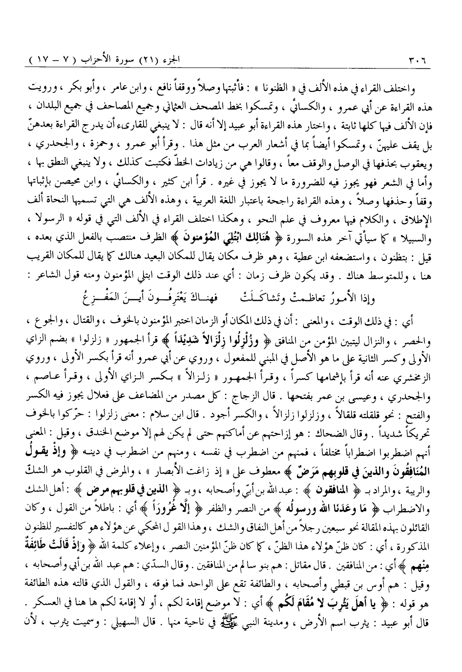 وَاخْتَلَفَ الْقُرَّاءُ فِي هَذِهِ الْأَلِفِ فِي «الظَّنُونَا» : فَأَثْبَتَهَا وَصْلًا وَوَقْفًا نَافِعٌ، وَابْنُ عَامِرٍ، وَأَبُو بَكْرٍ، وَرُوِيَتْ هَذِهِ الْقِرَاءَةُ عَنْ أَبِي عَمْرٍو، وَالْكِسَائِيِّ، وَتَمَسَّكُوا بِخَطِّ الْمُصْحَفِ الْعُثْمَانِيِّ وَجَمِيعِ الْمَصَاحِفِ فِي جَمِيعِ الْبُلْدَانِ، فَإِنَّ الْأَلِفَ فِيهَا كُلِّهَا ثَابِتَةٌ، وَاخْتَارَ هَذِهِ الْقِرَاءَةَ أَبُو عُبَيْدٍ إِلَّا أَنَّهُ قَالَ: لَا يَنْبَغِي لِلْقَارِئِ أَنْ يُدْرِجَ الْقِرَاءَةَ بَعْدَهُنَّ بَلْ يَقِفُ عَلَيْهِنَّ، وَتَمَسَّكُوا أَيْضًا بِمَا فِي أَشْعَارِ الْعَرَبِ مِنْ مِثْلِ هَذَا. وقرأ أبو عمرو، وحمزة، والجحدري، وَيَعْقُوبُ بِحَذْفِهَا فِي الْوَصْلِ وَالْوَقْفِ مَعًا، وَقَالُوا هِيَ مِنْ زِيَادَاتِ الْخَطِّ فَكُتِبَتْ كَذَلِكَ، وَلَا يَنْبَغِي النُّطْقُ بِهَا، وَأَمَّا فِي الشِّعْرِ فَهُوَ يَجُوزُ فِيهِ لِلضَّرُورَةِ مَا لَا يَجُوزُ فِي غيره. قرأ ابن كثير، والكسائي، وَابْنُ مُحَيْصِنٍ بِإِثْبَاتِهَا وَقْفًا وَحَذْفِهَا وَصْلًا، وَهَذِهِ الْقِرَاءَةُ رَاجِحَةٌ بِاعْتِبَارِ اللُّغَةِ الْعَرَبِيَّةِ، وَهَذِهِ الْأَلِفُ هِيَ الَّتِي تُسَمِّيهَا النُّحَاةُ أَلِفَ الْإِطْلَاقِ، وَالْكَلَامُ فِيهَا مَعْرُوفٌ فِي عِلْمِ النَّحْوِ، وَهَكَذَا اخْتَلَفَ القراءة في الألف التي في قوله «الرسولا، والسبيلا» كَمَا سَيَأْتِي آخِرَ هَذِهِ السُّورَةِ هُنالِكَ ابْتُلِيَ الْمُؤْمِنُونَ الظرف منتصب بالفعل الذي بعده، قيل: بتظنون، وَاسْتَضْعَفَهُ ابْنُ عَطِيَّةَ، وَهُوَ ظَرْفُ مَكَانٍ يُقَالُ لِلْمَكَانِ الْبَعِيدِ هُنَالِكَ كَمَا يُقَالُ لِلْمَكَانِ الْقَرِيبِ هُنَا، وَلِلْمُتَوَسِّطِ هُنَاكَ. وَقَدْ يَكُونُ ظَرْفَ زَمَانٍ: أَيْ: عِنْدَ ذَلِكَ الْوَقْتِ ابْتُلِيَ الْمُؤْمِنُونَ وَمِنْهُ قَوْلُ الشَّاعِرِ: