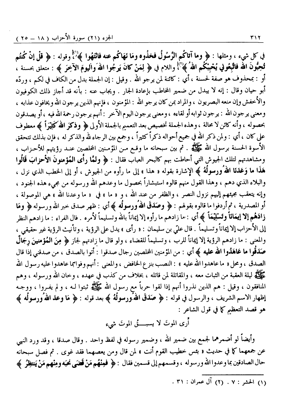 أَرَى الْمَوْتَ لَا يَسْبِقُ الْمَوْتَ شَيْءٌ وَأَيْضًا لَوْ أَضْمَرَهُمَا لَجَمَعَ بَيْنَ ضَمِيرِ اللَّهِ، وَضَمِيرِ رَسُولِهِ فِي لَفْظٍ وَاحِدٍ. وَقَالَ صَدَقَا، وَقَدْ وَرَدَ النَّهْيُ عَنْ جَمْعِهِمَا كَمَا فِي حَدِيثِ «بِئْسَ خَطِيبُ الْقَوْمِ أَنْتَ» لِمَنْ قَالَ وَمَنْ يَعْصِهِمَا فَقَدْ غَوَى. ثُمَّ فَصَّلَ سُبْحَانَهُ حَالَ الصَّادِقِينَ بِمَا وَعَدُوا اللَّهَ وَرَسُولَهُ، وَقَسَّمَهُمْ إِلَى قِسْمَيْنِ فَقَالَ: فَمِنْهُمْ مَنْ قَضى نَحْبَهُ وَمِنْهُمْ مَنْ يَنْتَظِرُ
